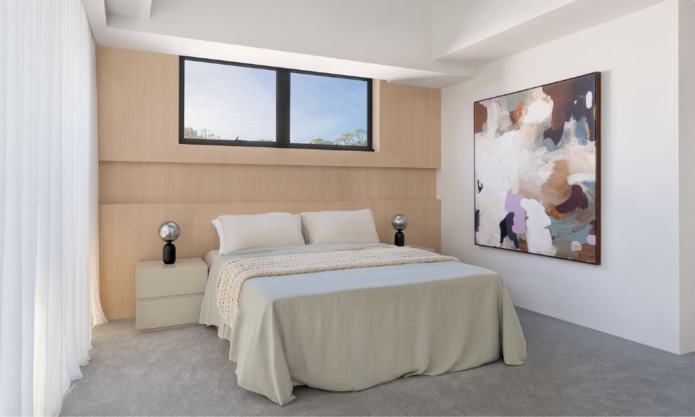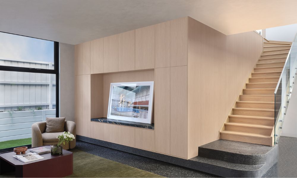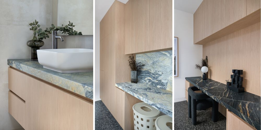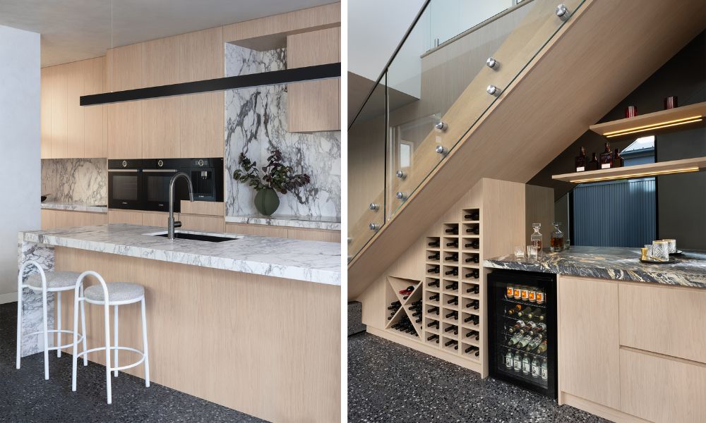 Blonde Oak Woodmatt has been carried through the home’s kitchen cabinetry, laundry, wine display area, bedroom wall lining, and even the stairway panelling - showcasing a cohesive design language that feels calm, warm, and inviting. Rather than competing finishes or contrasting tones, the Elation Group team chose to celebrate the beauty of Blonde Oak’s natural grain and soft, sunlit hue throughout every zone.