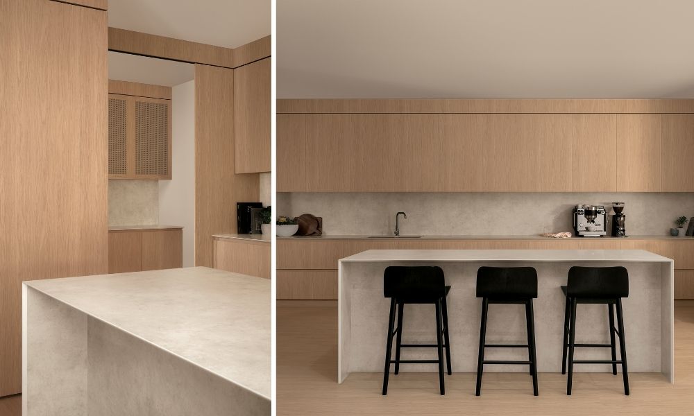Xenolith uses this same compact laminate structure, built from layers of resin-infused paper to form a moisture-resistant, impact-resistant, and self-supporting surface. Because of its homogeneous solid core, it’s perfect for exposed edges, heavy use, and areas prone to spills, humidity, or steam.