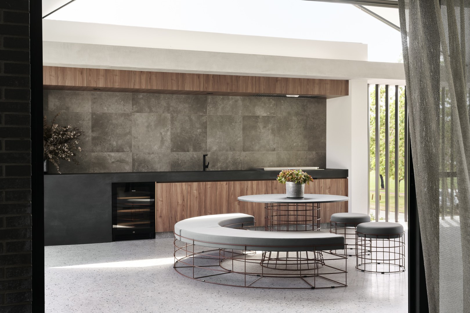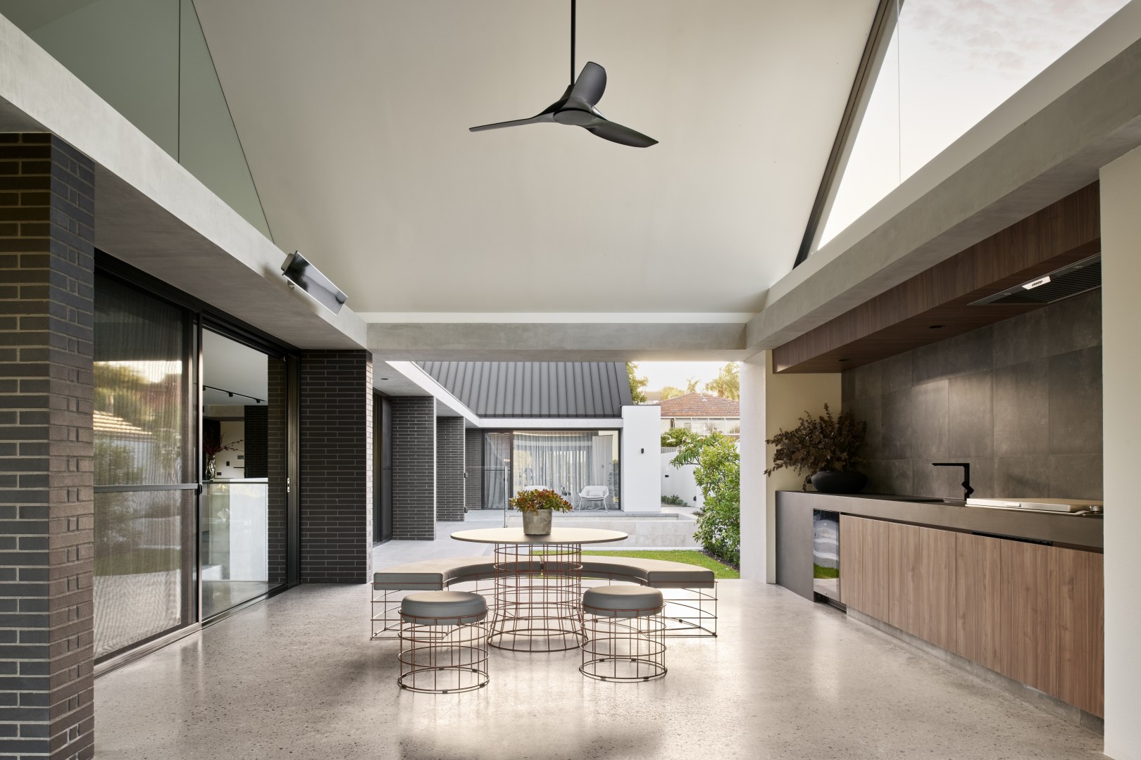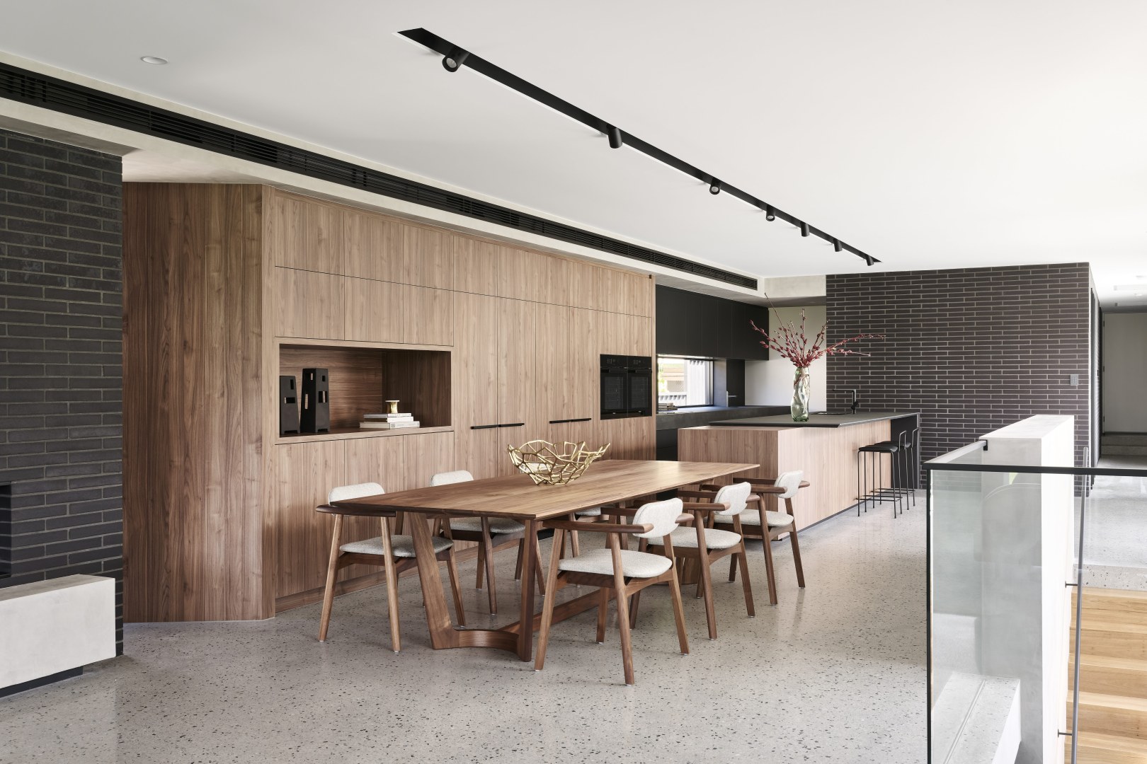 Gregory St has been designed with a timeless aesthetic and richness of material. With clean lines, large expanses of glass and a horizontal emphasis the home maximises the lake views before it. The ceiling volumes have been sculpted to delineate areas the otherwise open plan design. The consistency of materials throughout the residence creates the illusion of greater space than the actual floor area. The colour palette of Notaio Walnut and green kit-kat tiles, emphasised this homes connection with nature.