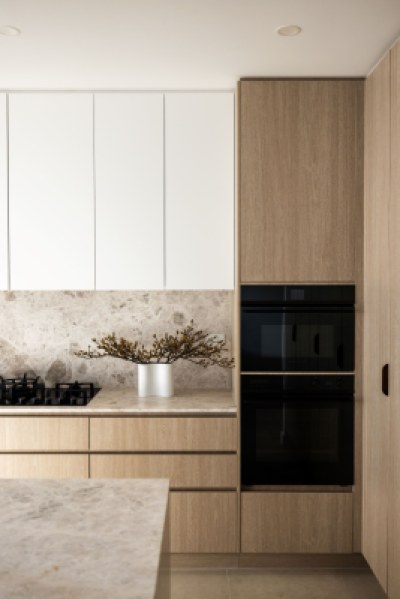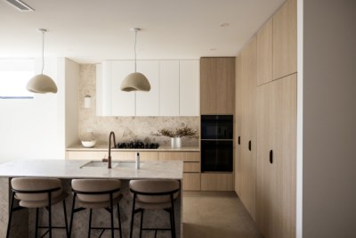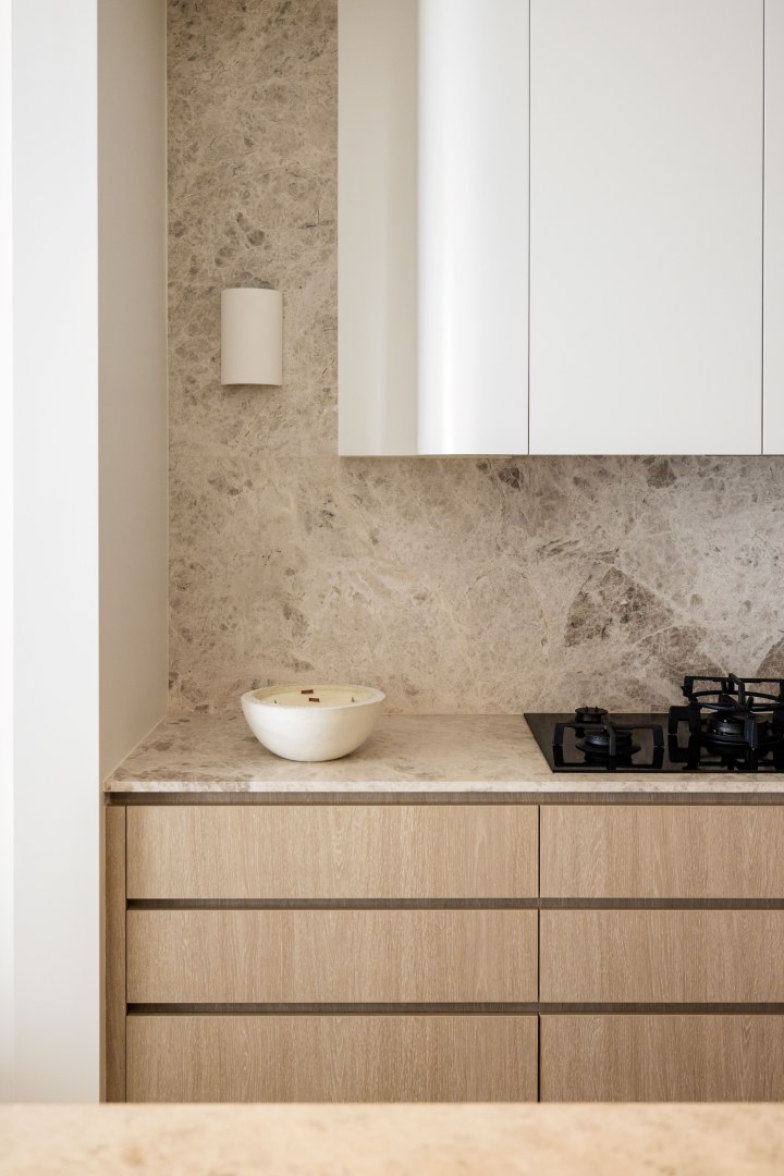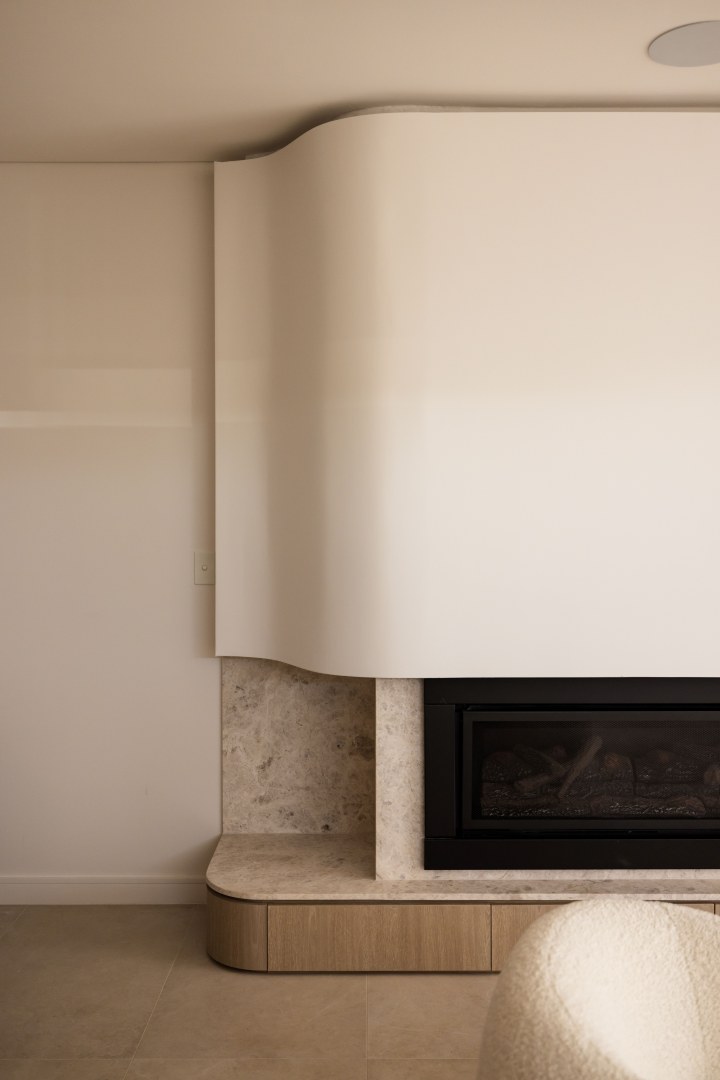 The client’s directive for the project was to establish a welcoming oasis. Achieved through tonally matched finishes, incorporating light timbers, warm whites, and beiges, the interior is enriched with bronze fixtures and gentle curves. Notably, the fireplace seamlessly integrates with the fluidity of the curved plasterboard, contributing to the overall aesthetic.