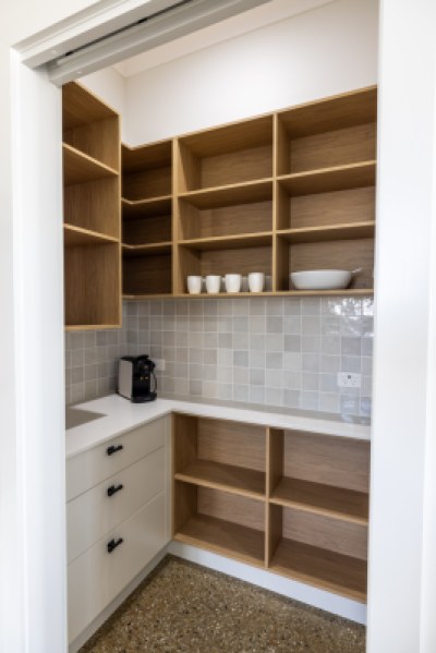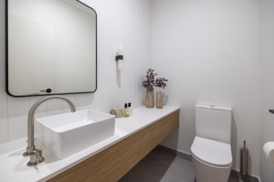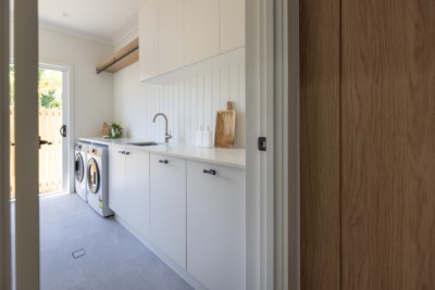 Welcome to AKM Residence, a contemporary haven in the inner suburbs of Townsville. This new build seamlessly blends Boston Oak Woodmatt cabinetry with Blossom White surfaces, creating a haven of refined neutrality. Black hardware adds a touch of drama in each space. In the kitchen the expansive island takes center stage in the spacious room. A tall rangehood complements the high ceilings, and a cleverly designed pantry maximizes functionality in a small footprint.