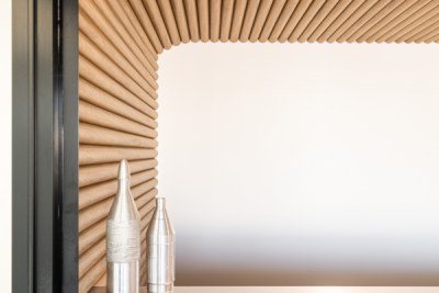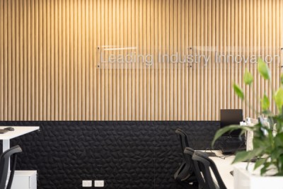 The design reflects the technological prowess through warm, organic, and industrial elements. Curved Steccawood ceilings & walls symbolise AML 3D's ability to create complex shapes, the fractured pinboard representing AML 3D’s flexibility in moulding materials, all achieved through innovative design thinking to seamlessly integrate elements from the brand.
