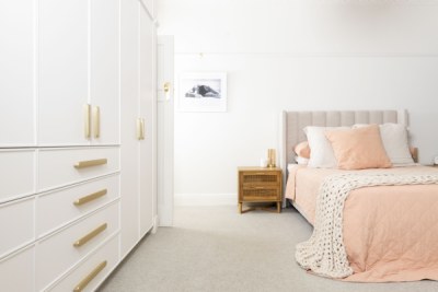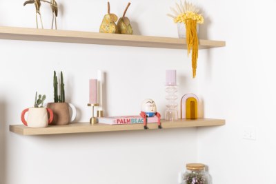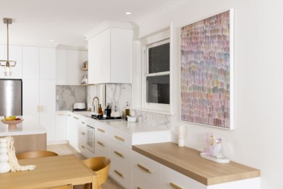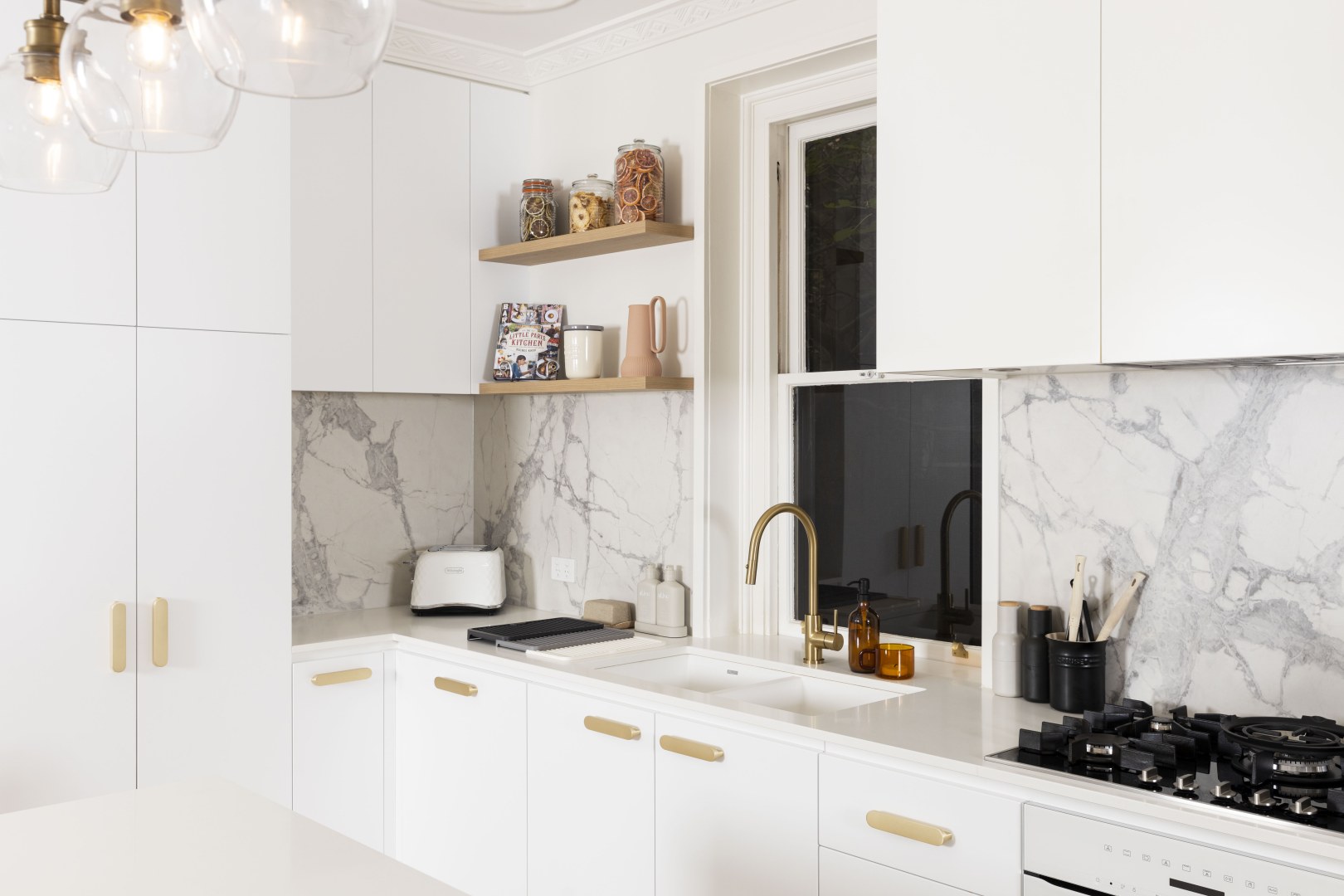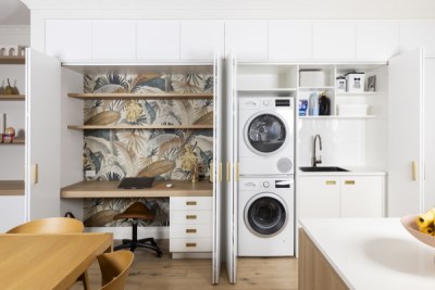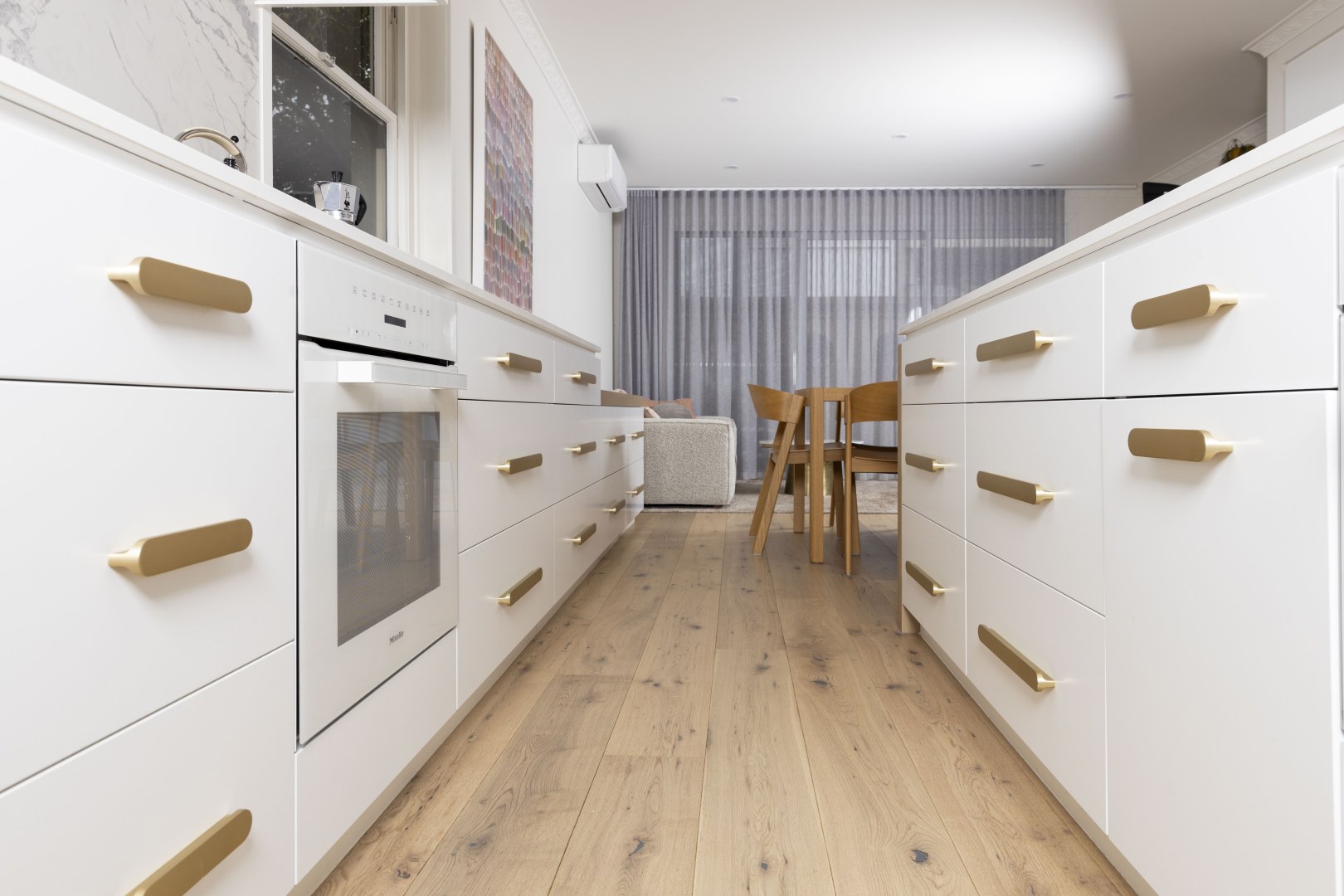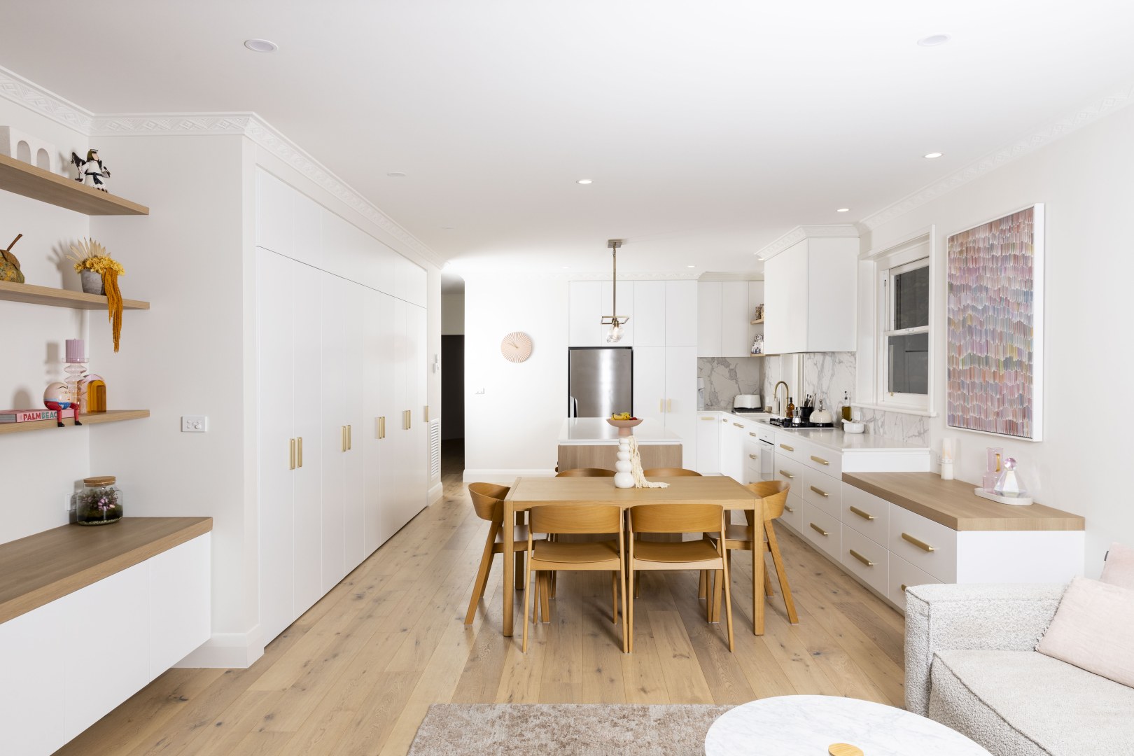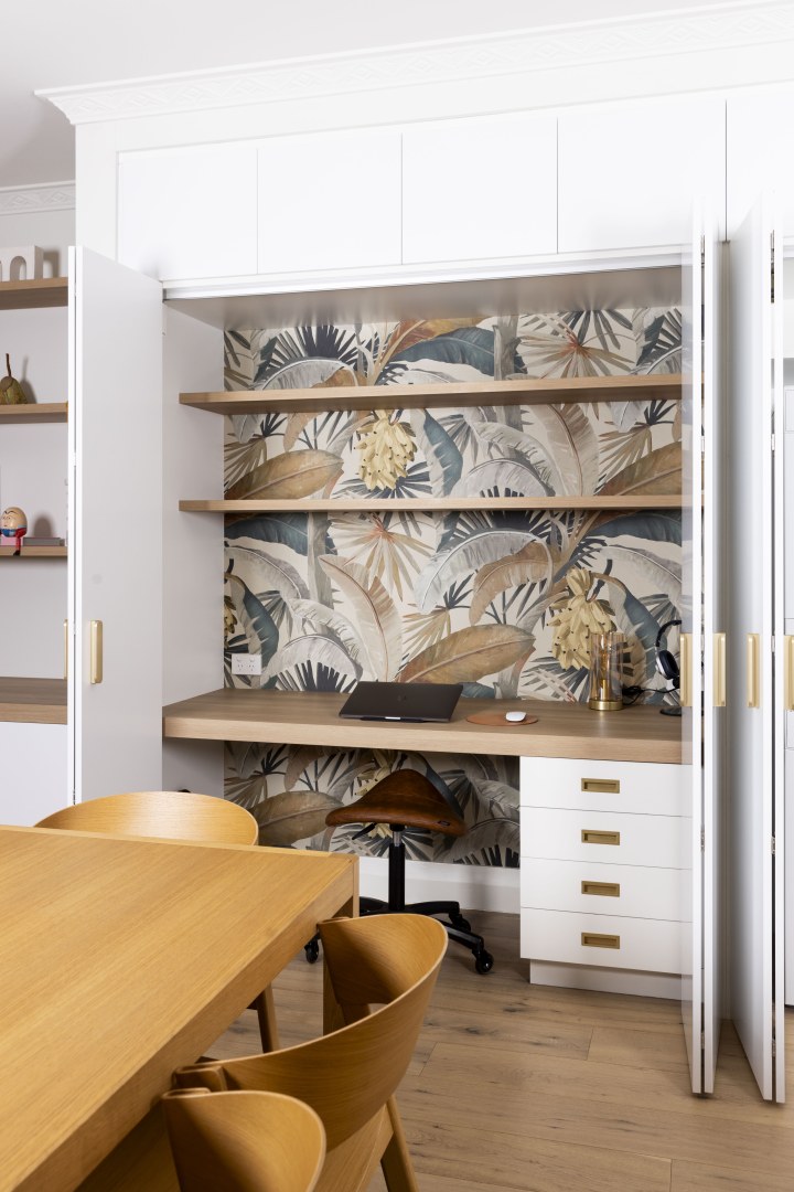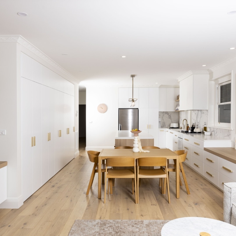 In hipster Elwood, clean modern finishes were important to this client, although we wanted to honour the beautiful old apartment. With a classical nod in the use of Thermolaminated 'Guilford' and ‘Chifley’ doors in ‘Ultra White Matt’, with classical marbles & touches of gold, it integrated beautifully. We introduced soft lines of ‘Plantation Ash’ in oversized benchtops & chunky shelves to blend with the timber floor. The mini-study & fun tropical wallpaper makes working from home a dream!