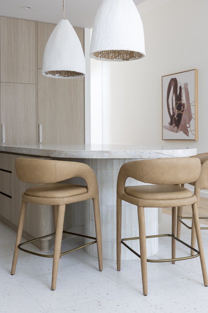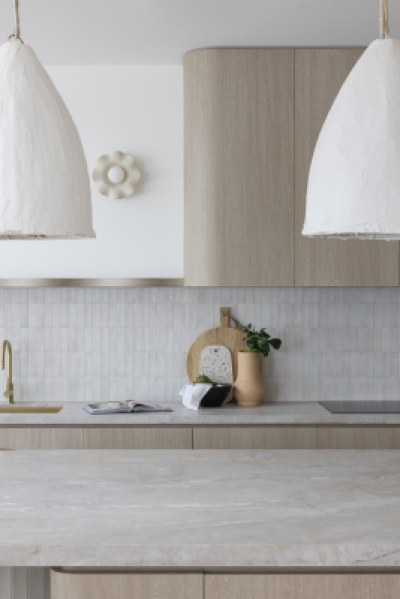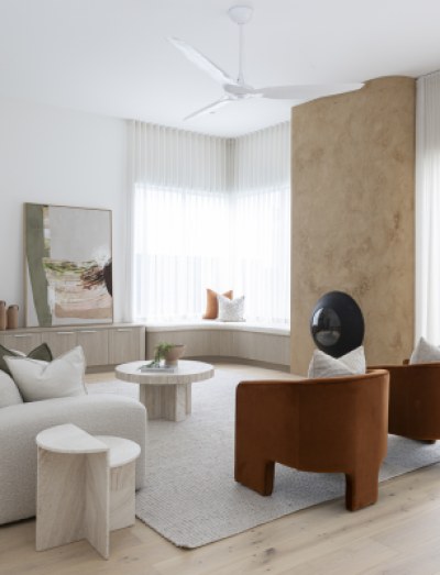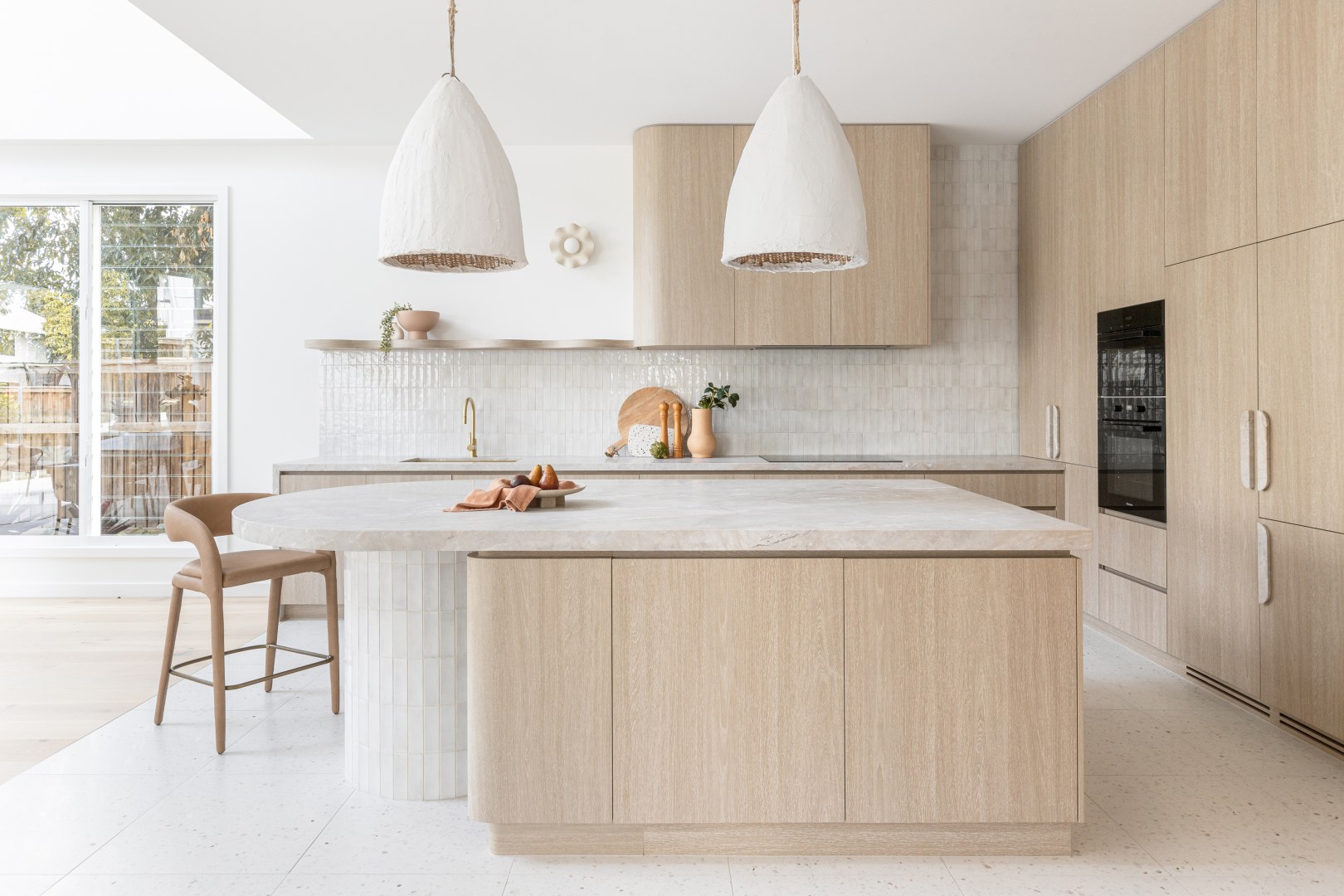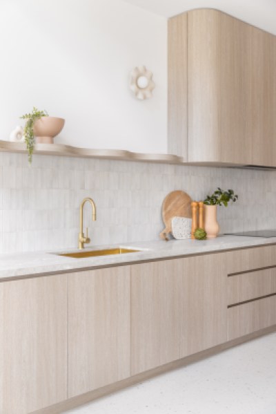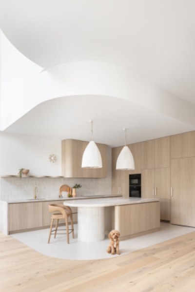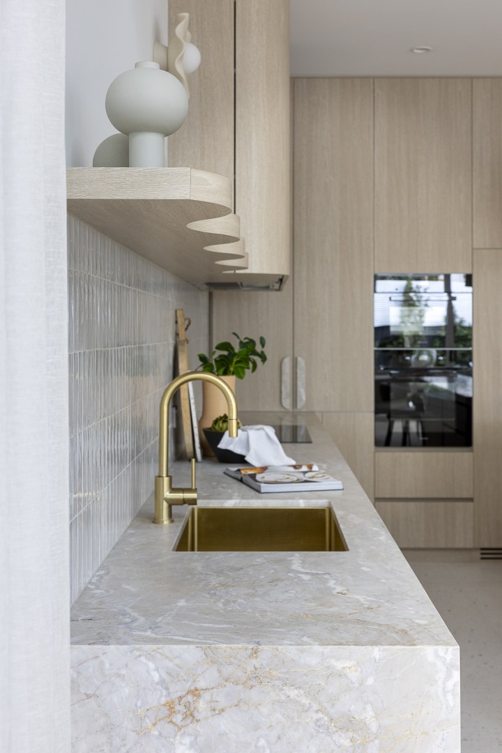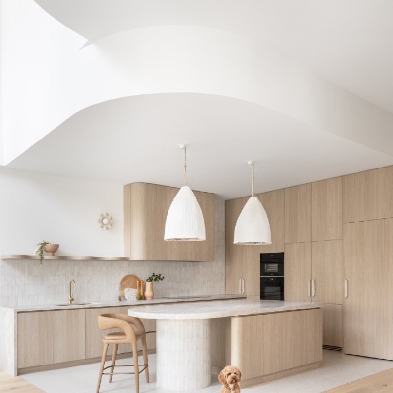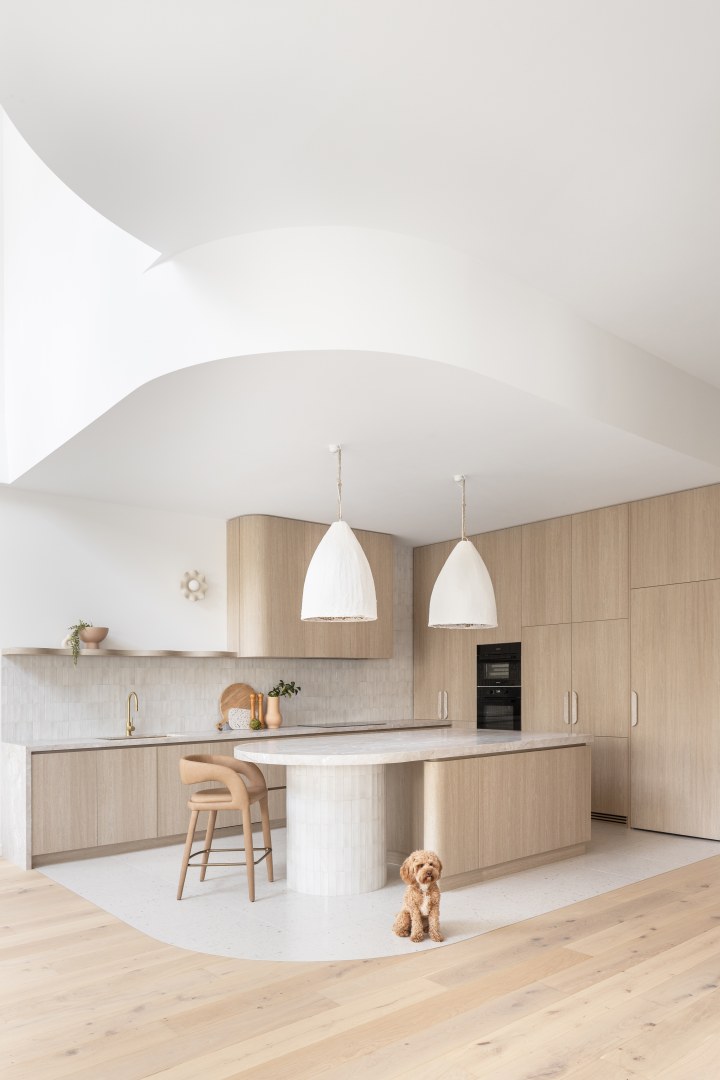 Ashton House was designed with young families in mind, aiming to create a harmonious atmosphere. To enhance the interplay of shadow and movement, a wave shelf in polytec Coastal Oak Woodmatt was installed. The subtle grain of Coastal Oak provides a refined look that isn’t overpowering and can be manipulated to form tight curves.