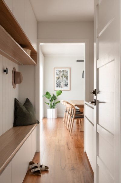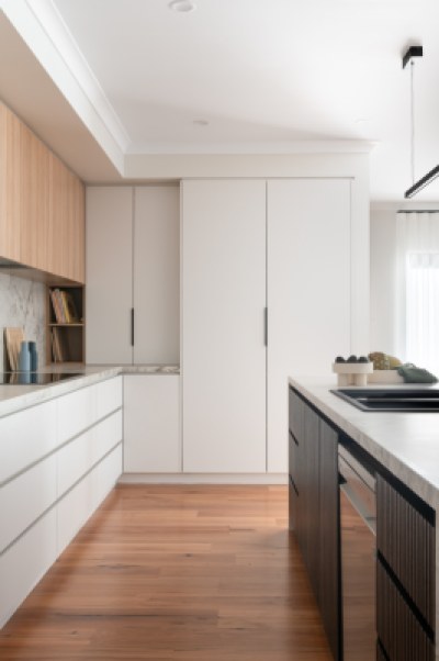We were asked to redesign our client's home and create a welcoming, warm, classic yet modern house, with a wow factor. Our clients loved the idea of introducing some pops of black to create drama, yet natural timbers to make the home feel welcoming and warm. We redesigned the kitchen layout to include a pocket door pantry, a bifold appliance cupboard and redesigned the existing pantry into a drop zone area with an integrated charging station. The result: a modern, welcoming, warm, functional home.