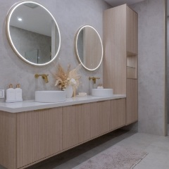 Refurbished in 2022, the female, male and unisex showers to the balance Mayfield gym and swimming area, were recreated to work in harmony with existing surrounding finishes. The aim was to bring it out of the 90’s and give it a timeless essence with a natural, calming feel and a touch of classicism. Drawing from the plywood finishes in other parts of the building, Natural Ply compact laminate paired beautifully with Black Ply Woodmatt to complete this project.