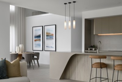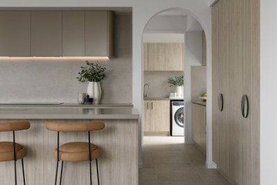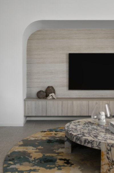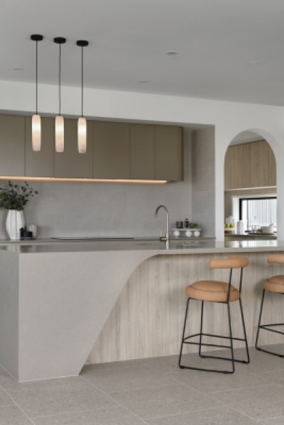 This Gold Coast home embodies contemporary coastal living, inspired by the local natural surroundings. With minimalist principles guiding the design, thoughtfully placed curves highlight functional spaces like the staircase & kitchen island. Neutral terrazzo and driftwood like timber tones ensure focus on these graceful forms, evoking a sense of relaxed sophistication and honouring the area's luxurious yet laid-back lifestyle.