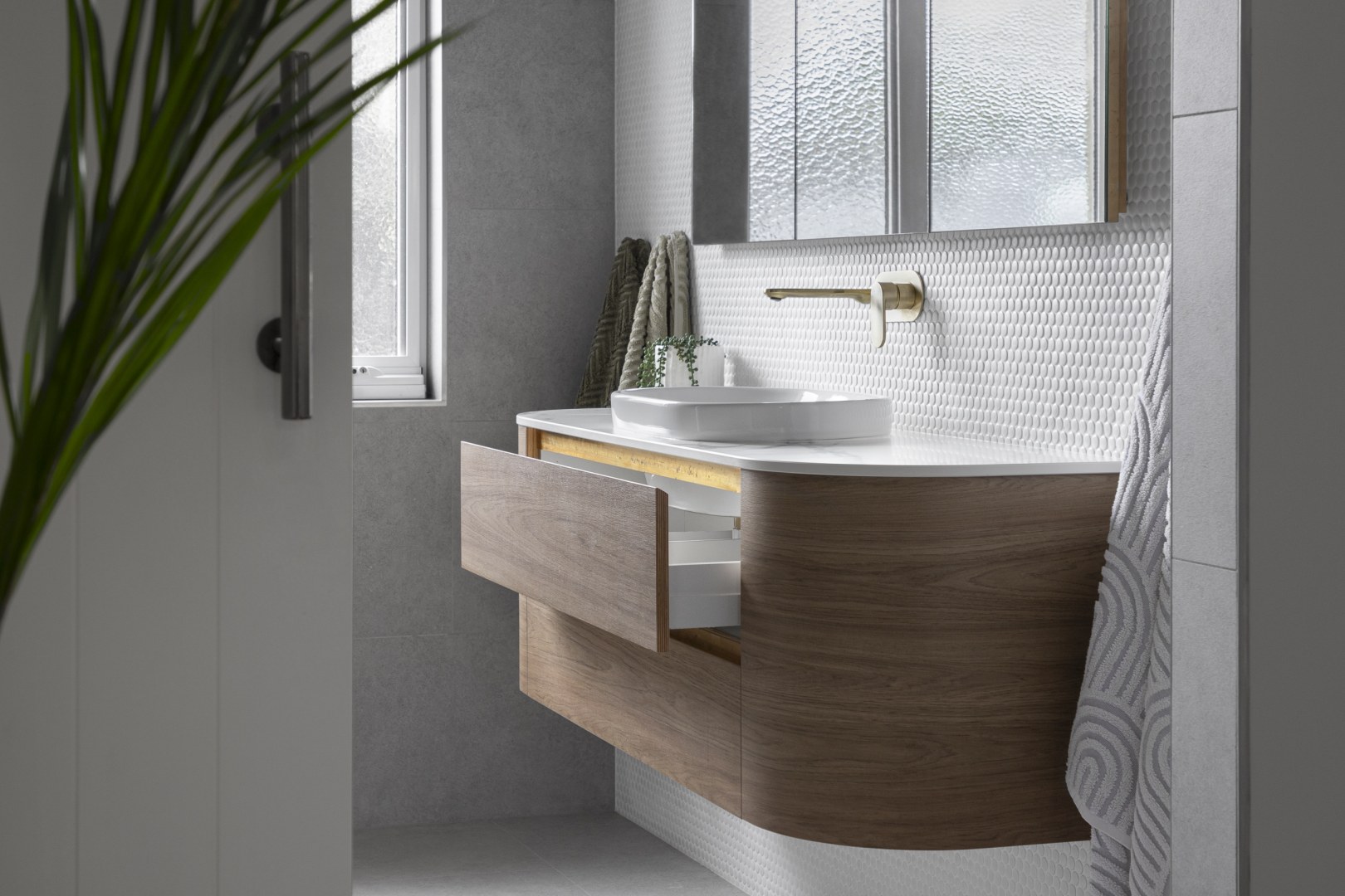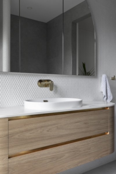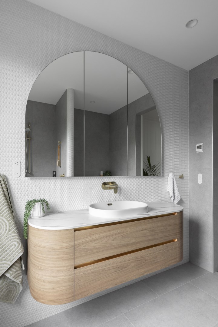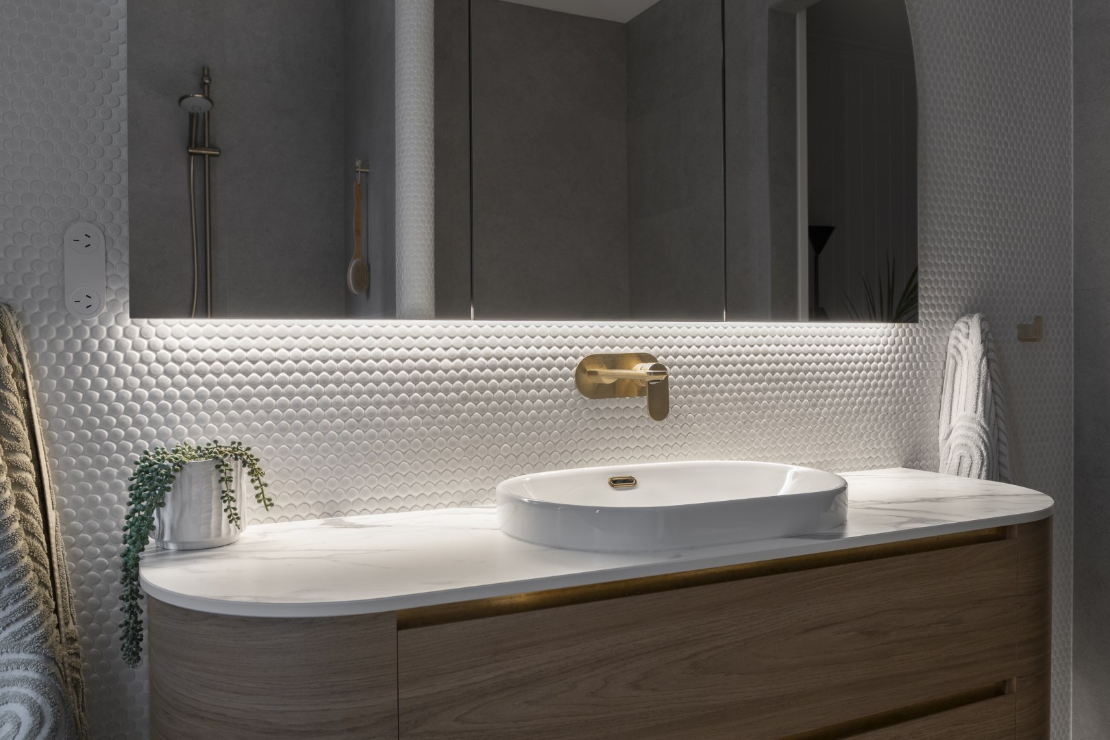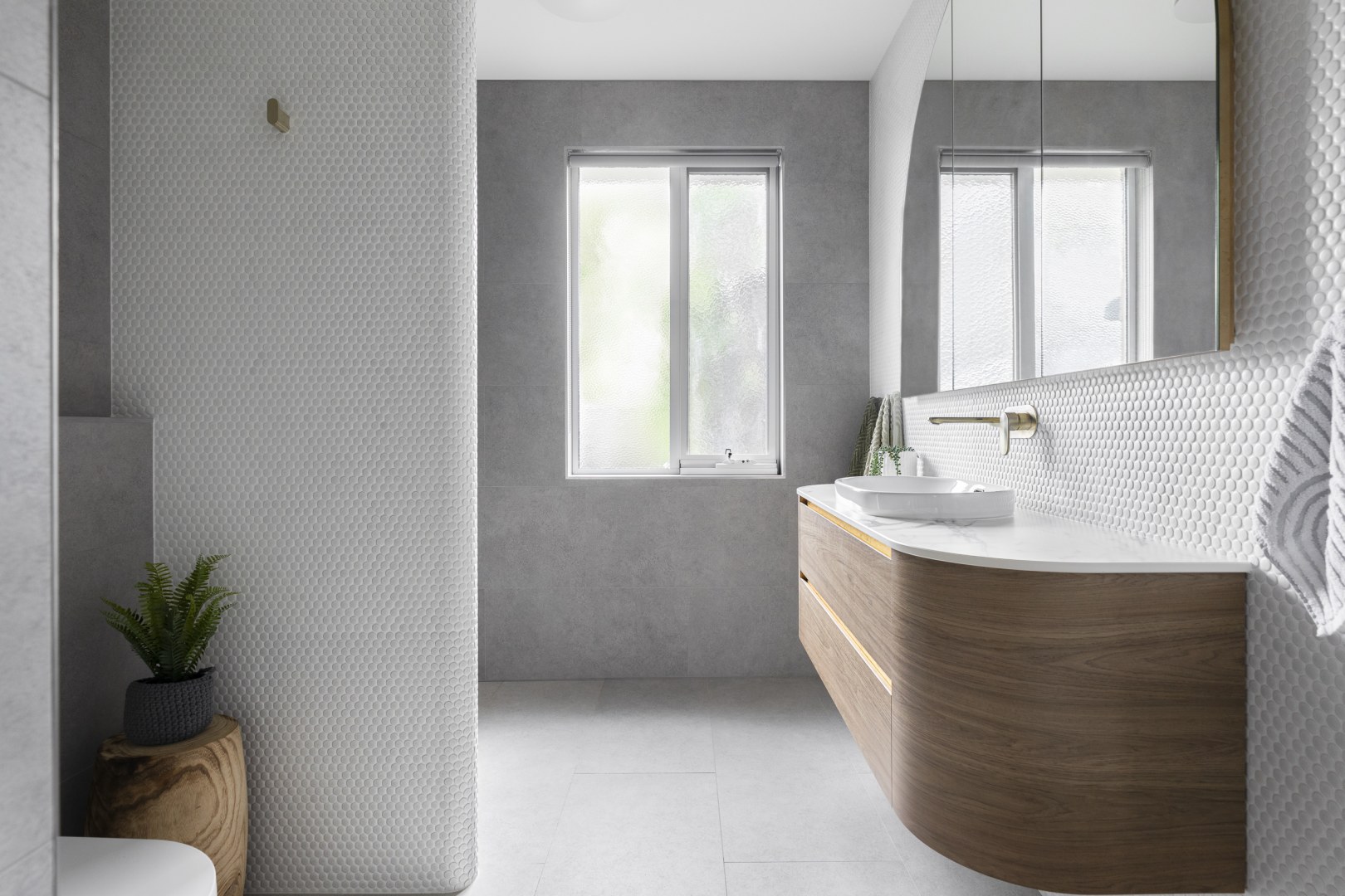 Below the surface of this serene sanctuary features an array of high spec assistive tech from sub floor up, Designed to comfortably cater to a disabled person his carer & siblings. Escaping to this sensory delight imparts quiet euphoria during daily rituals. In a nod to ergonomics and its Art Deco architecture, soft curves, tactile porcelain tiles warmed by timber & metallics to delight the senses. Abundant storage, a subtle array of lighting, underfloor heating, all elevate sense of wellbeing.
