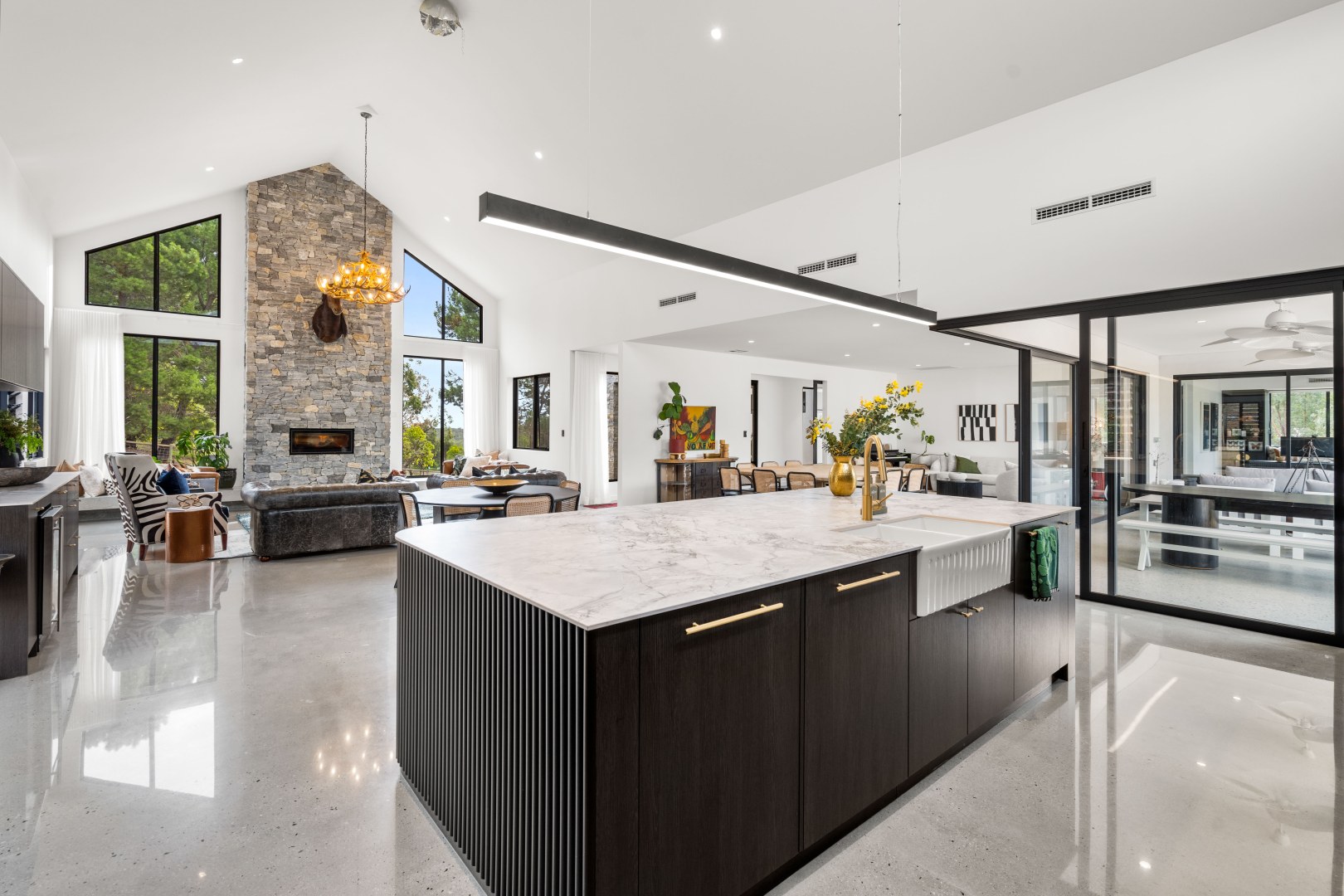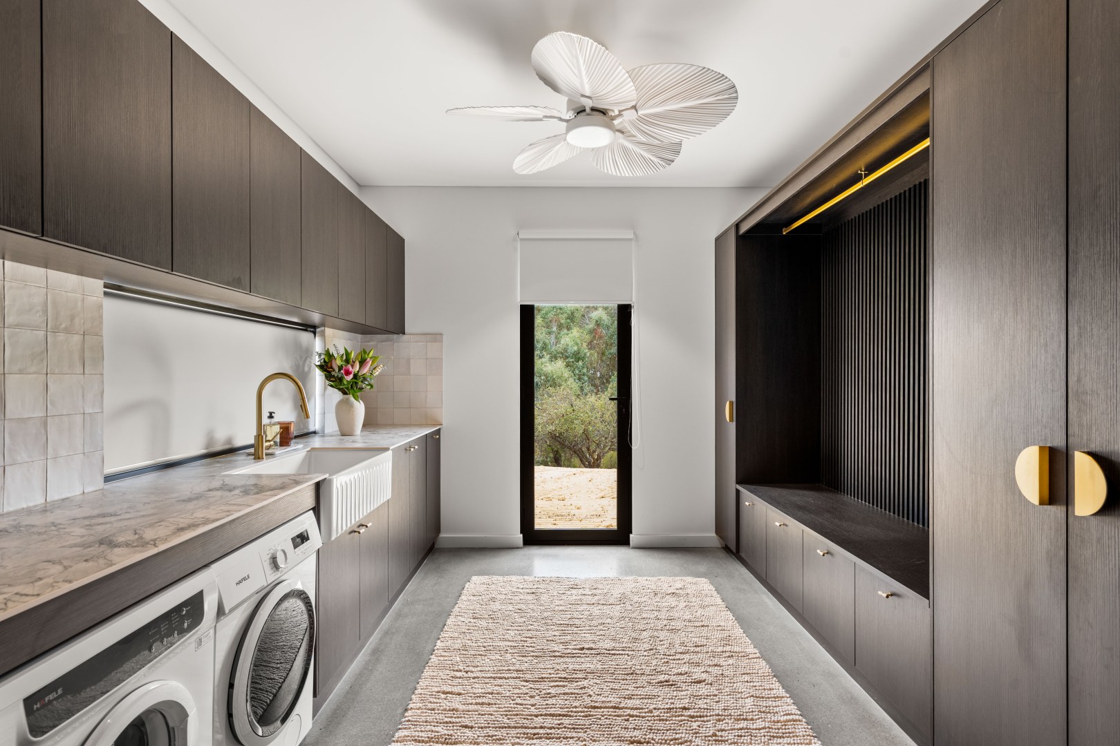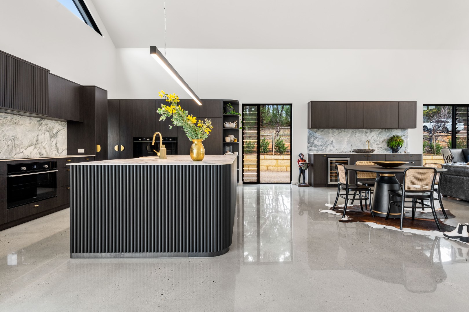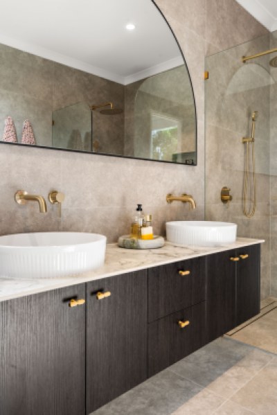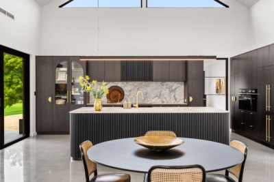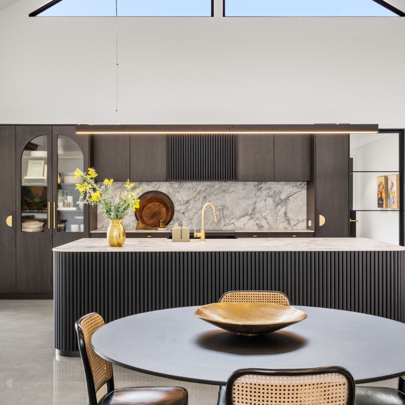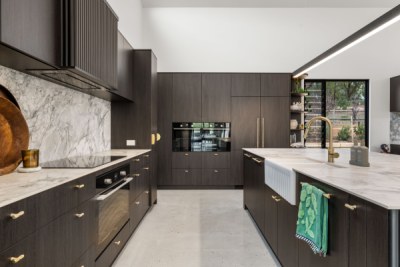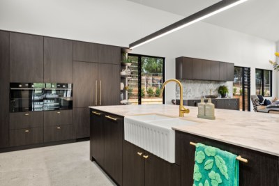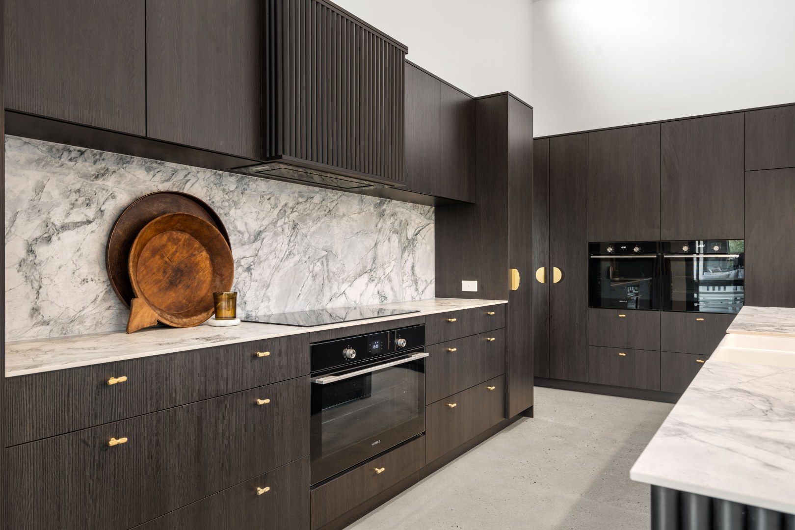 polytec's Black Wenge Ravine is complimented beautifully by the warm tones of the brass hardware & boldness of Vasari Super White porcelain. Together they form a stunning, bold, but elegant design.