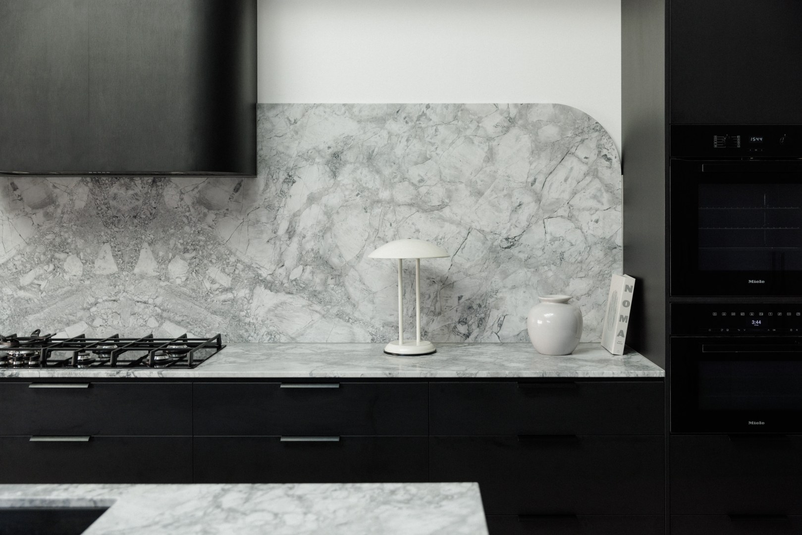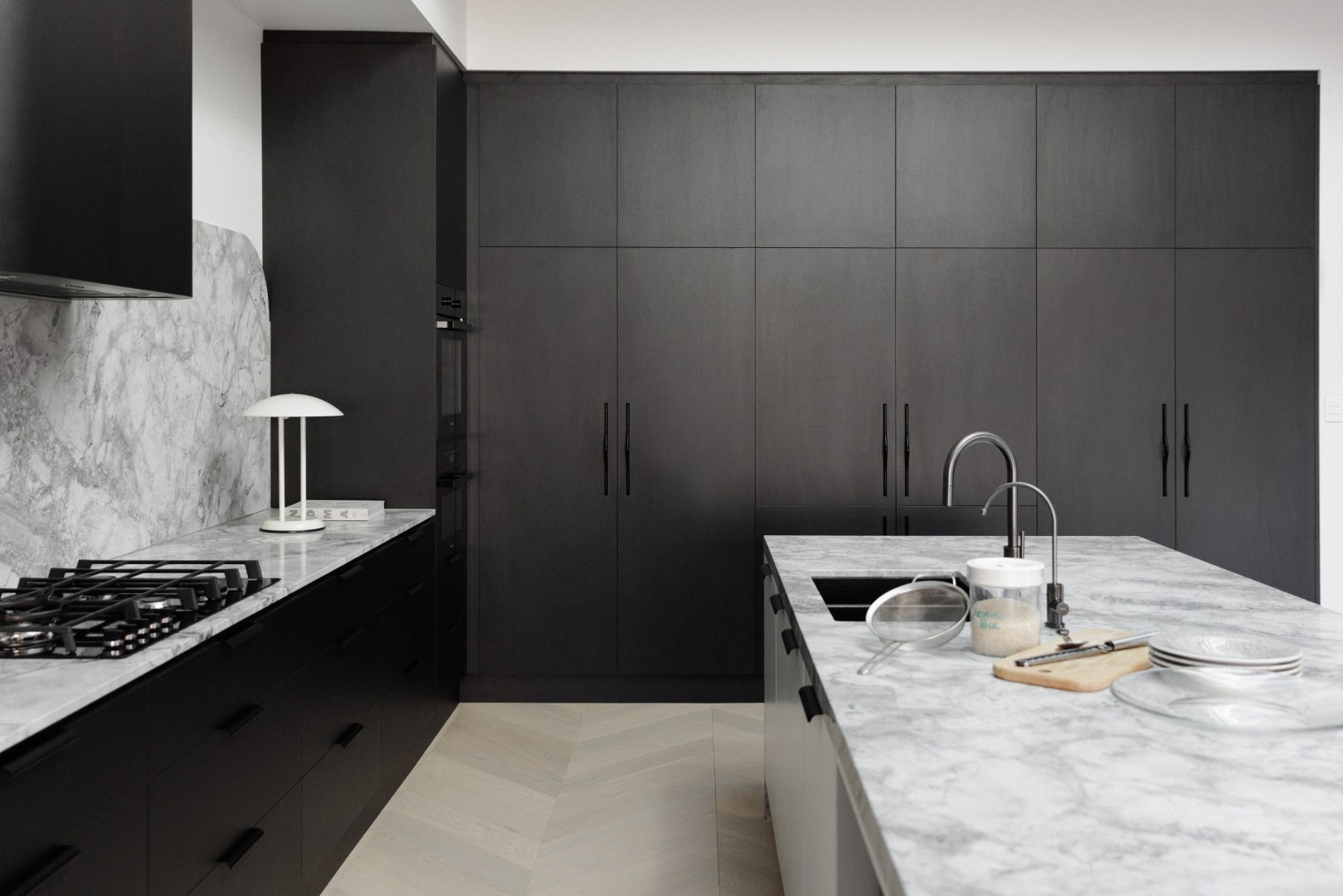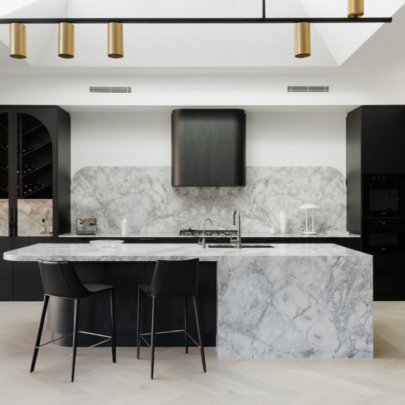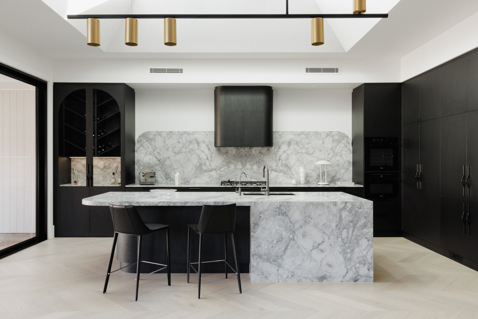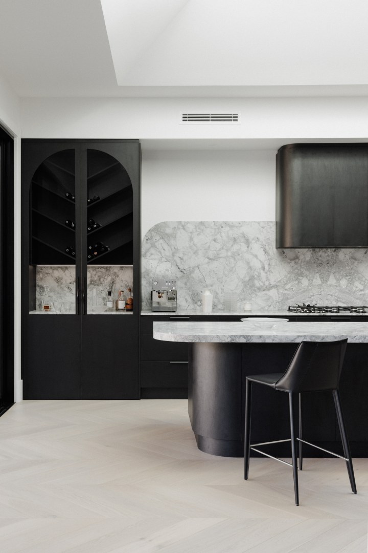 The kitchen embodies monochrome elegance with clean lines, striking features catering to both style and practicality. With ample natural light Permitted for bold design choices; polytec Black Woodmatt melamine joinery fronts, contrasting beautifully with Super White marble. To enhance contrast, polytec Classic White Matt melamine was artfully incorporated on the island's internal side. Every detail is carefully considered to ensure a harmonious blend of form and function throughout the home.