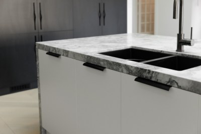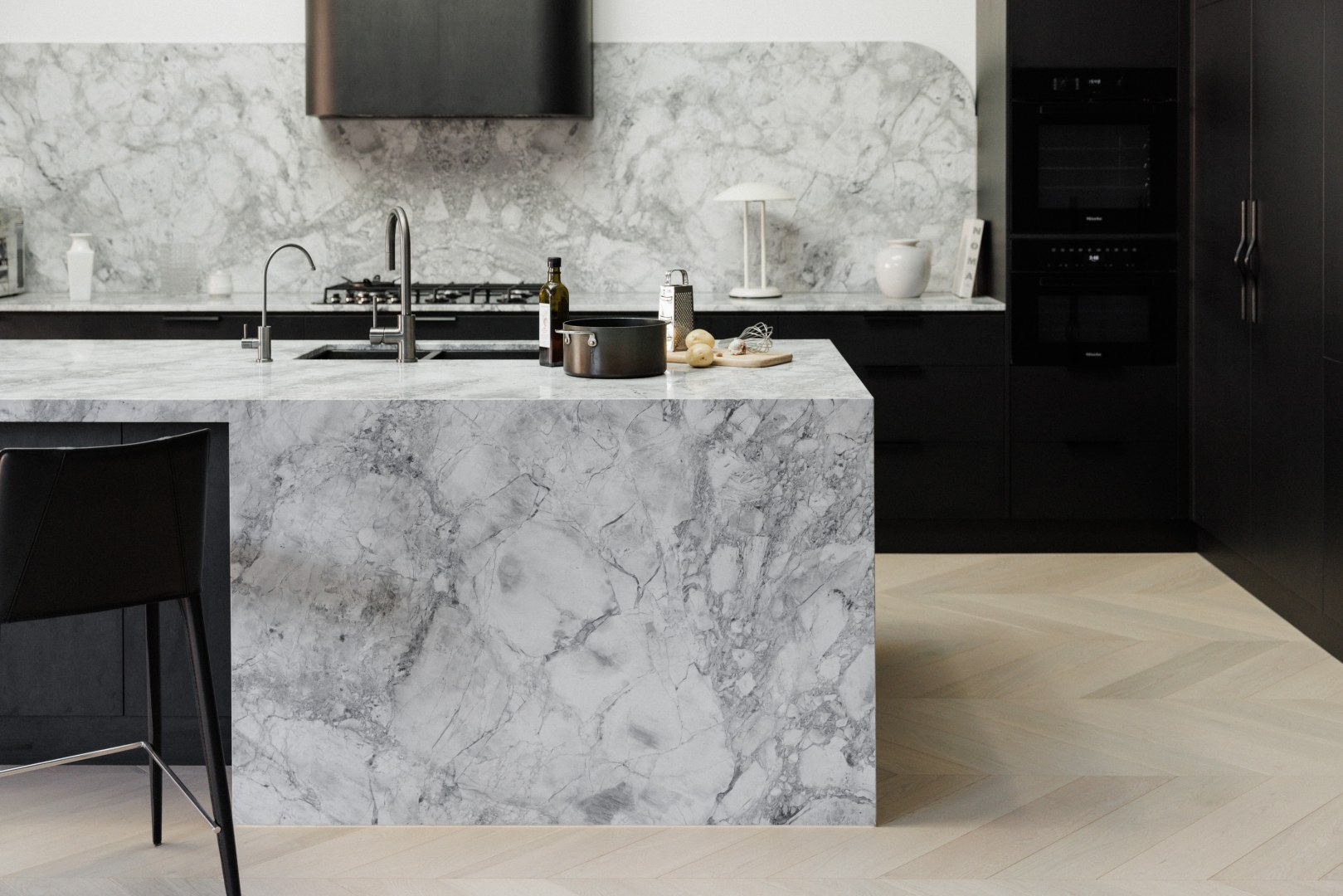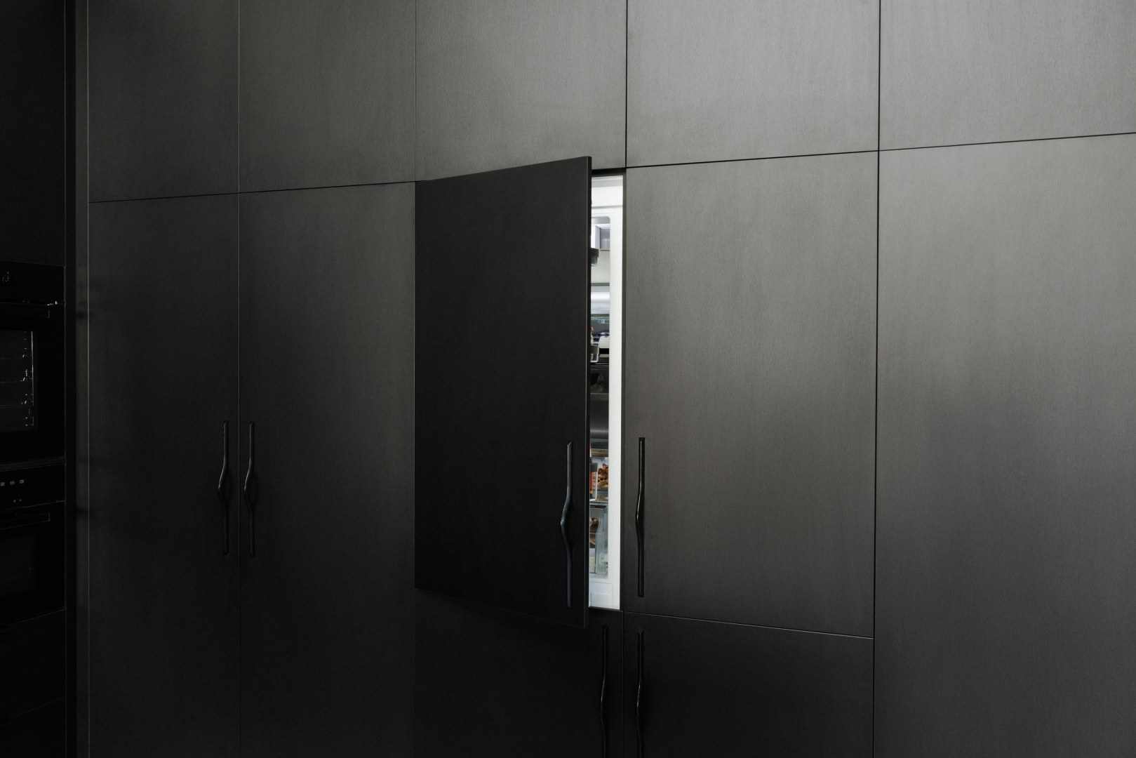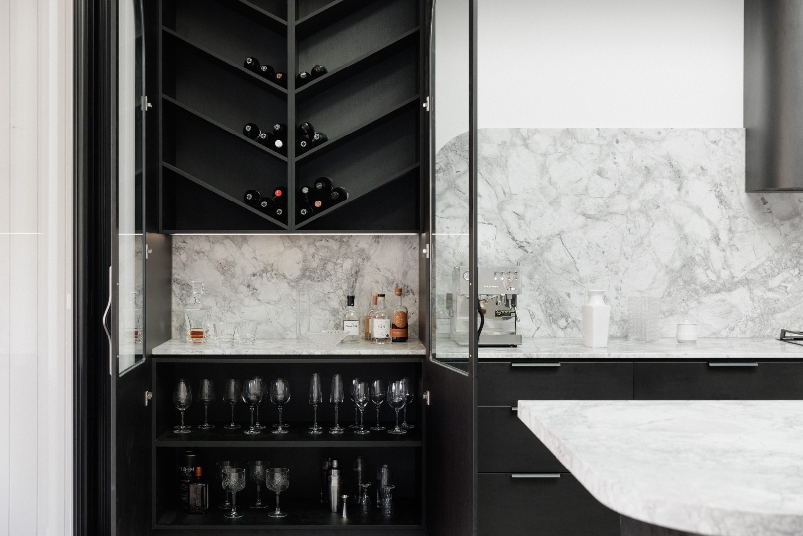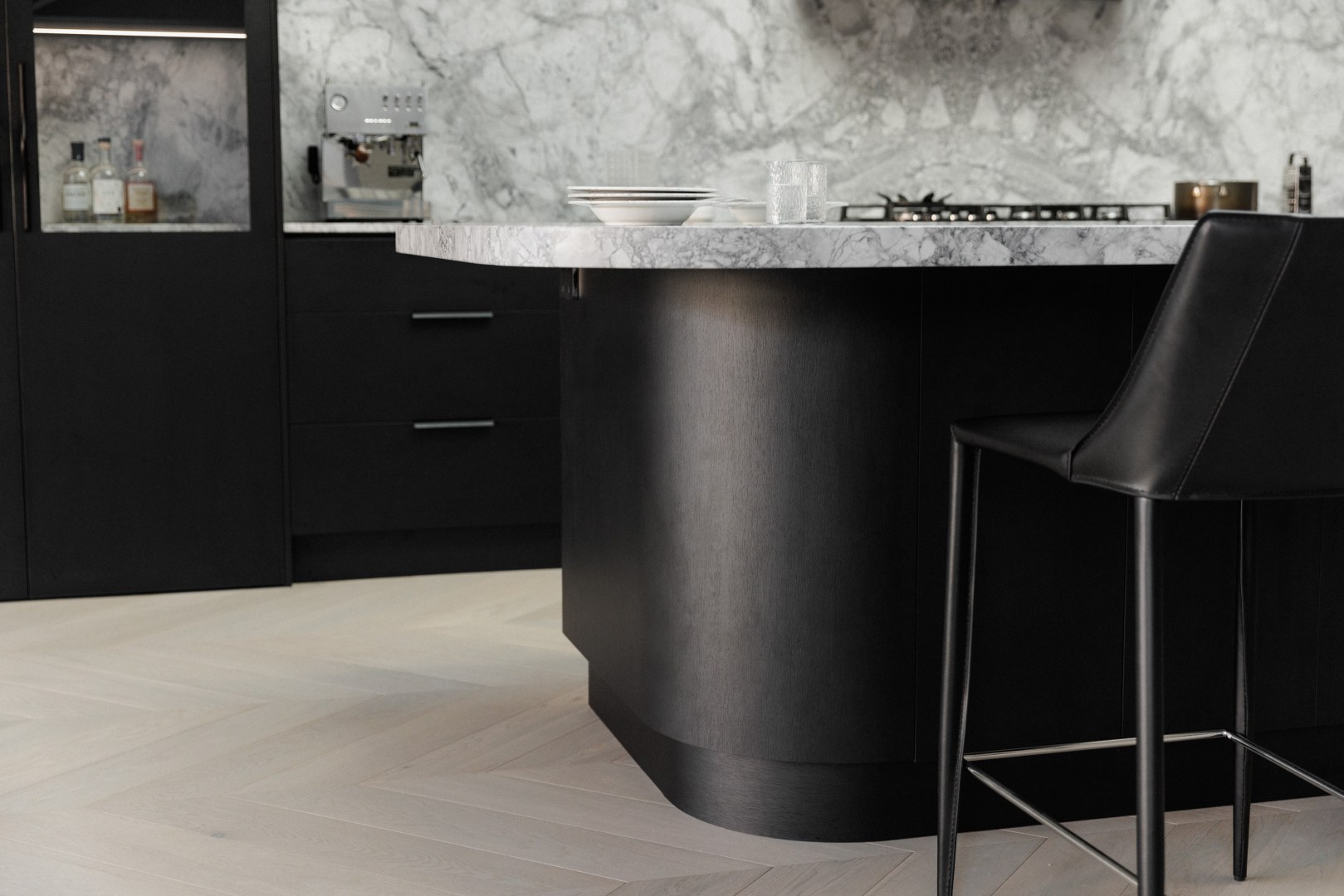 The kitchen embodies monochrome elegance with clean lines, striking features catering to both style and practicality. With ample natural light Permitted for bold design choices; polytec Black Woodmatt melamine joinery fronts, contrasting beautifully with Super White marble. To enhance contrast, polytec Classic White Matt melamine was artfully incorporated on the island's internal side. Every detail is carefully considered to ensure a harmonious blend of form and function throughout the home.