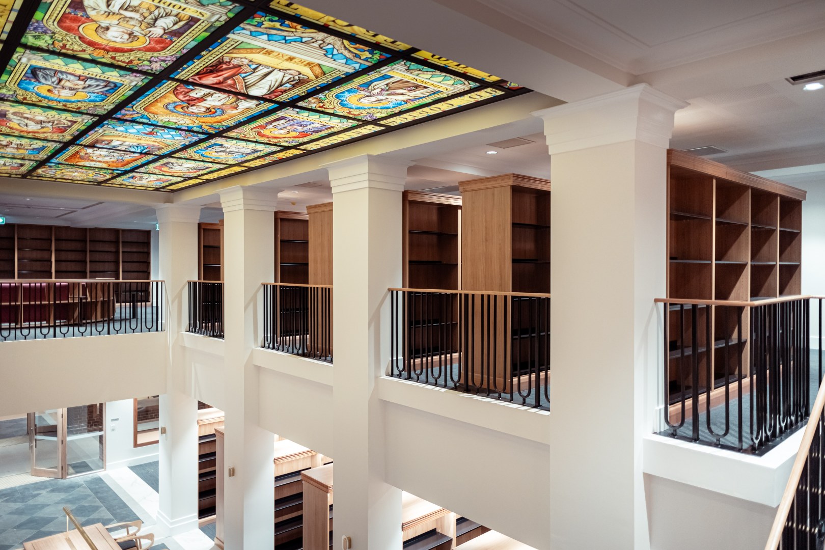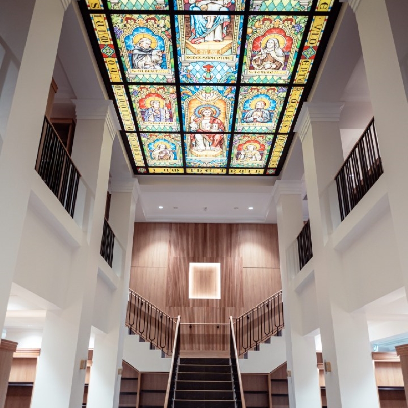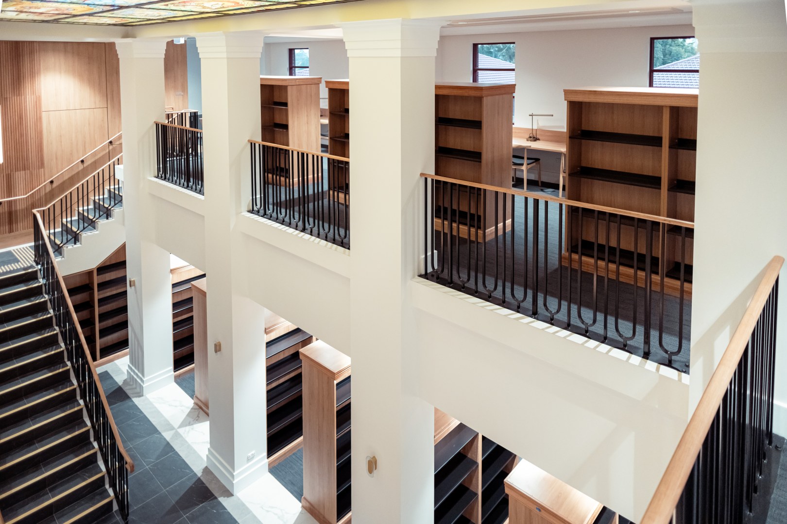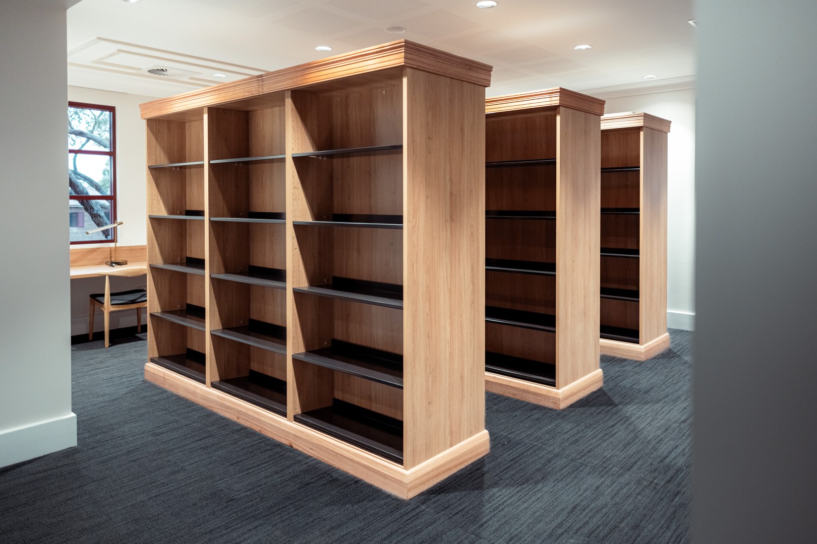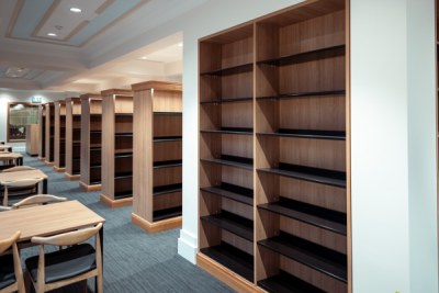The Campion College in Toongabbie Sydney received funding to construct a new Library space and worked with WMK Architecture and Reitsma to design and construct this project. IntraSpace was approached by Project Strategies (the Project Managing company) to assist them with the supply and installation of the Library Shelving and Seating. We took the initial concept render and the architectural plans and brought the project to life with prototypes and samples and final design work. Our manufacturing division Buro Interiors manufactured all the joinery and the complete bespoke shelving project was installed in full and on time. The materials used were polytec Tasmanian Oak with real Tasmanian Oak timber mouldings.