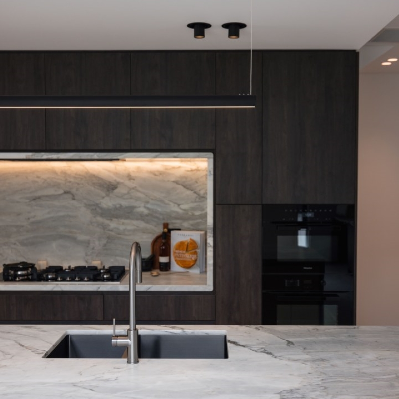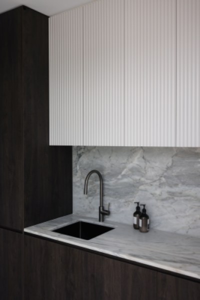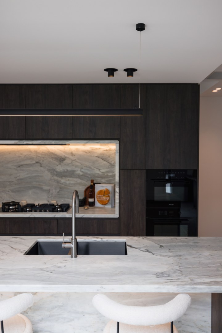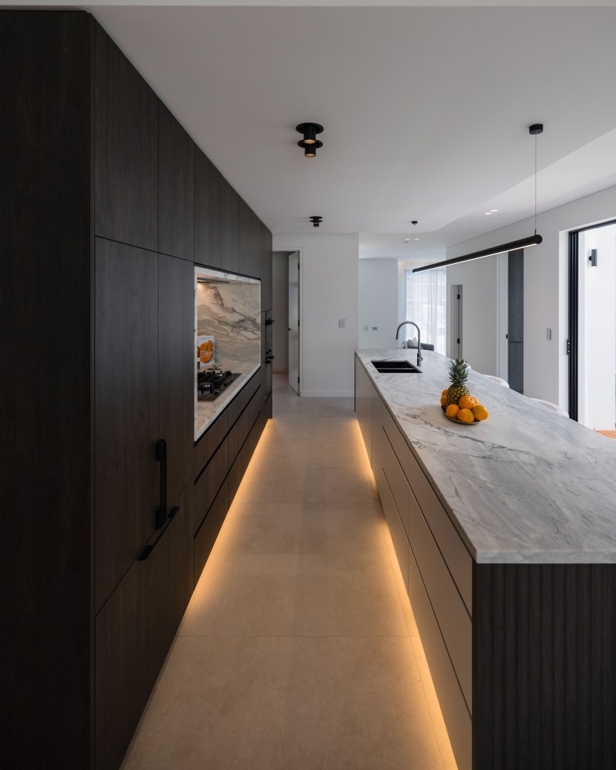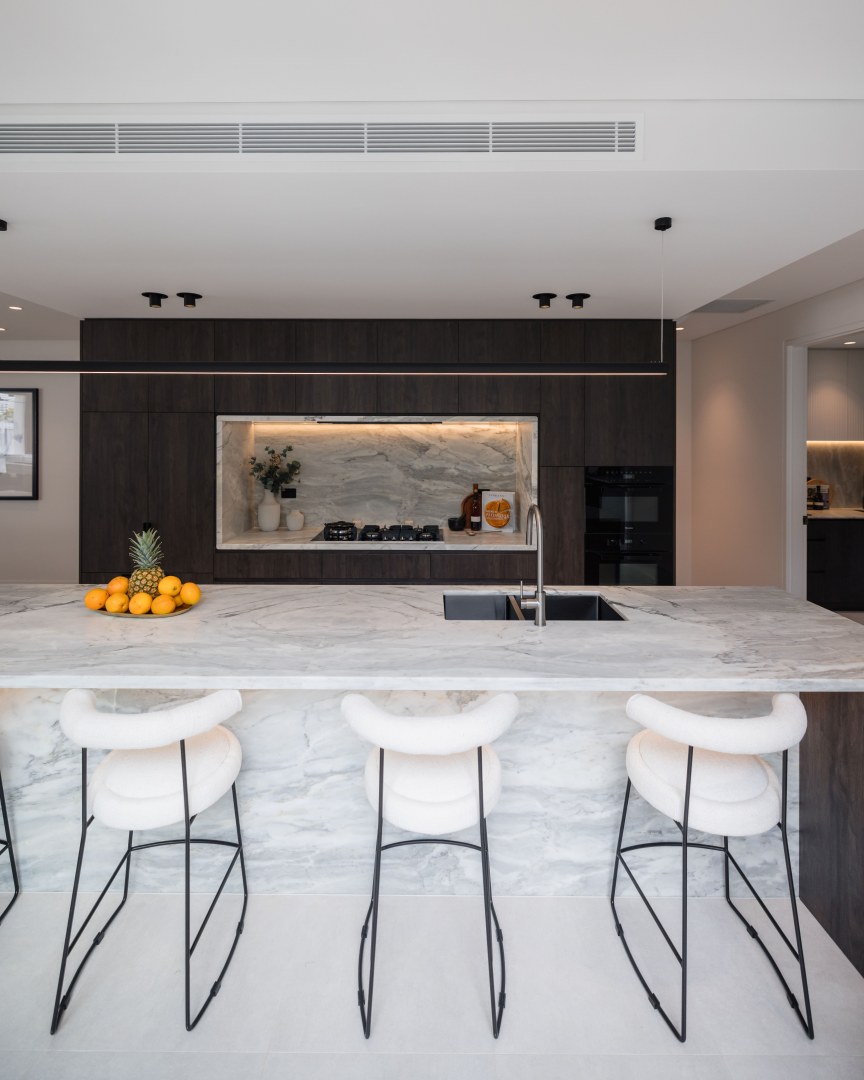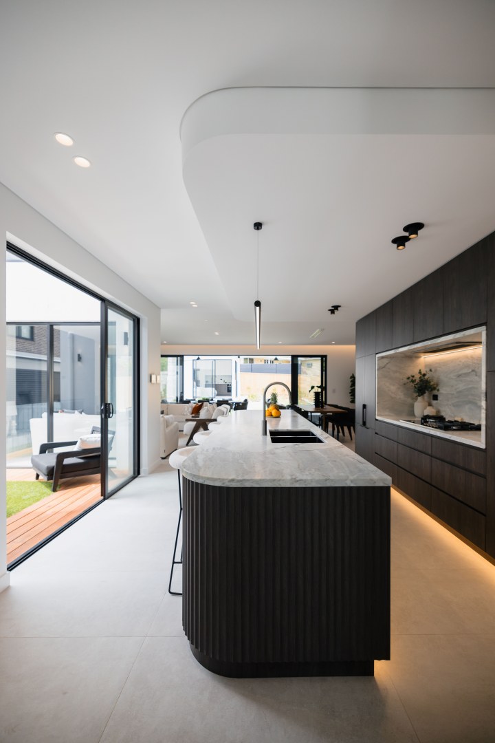 Bespoke joinery that incorporates contrasting shades of grey marble and rich timber placed luxury at the forefront. A grand entrance that features floor-to-ceiling textured wall panelling guides visitors into the heart of the home—the kitchen. The fireplace, serving as a striking statement piece clad in dark timber and marble, extends to the outdoor entertaining area, thereby narrating the design passage throughout the property.