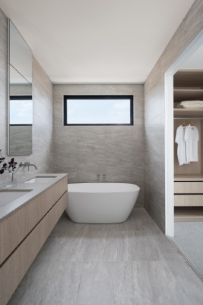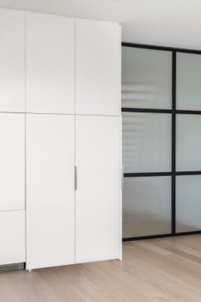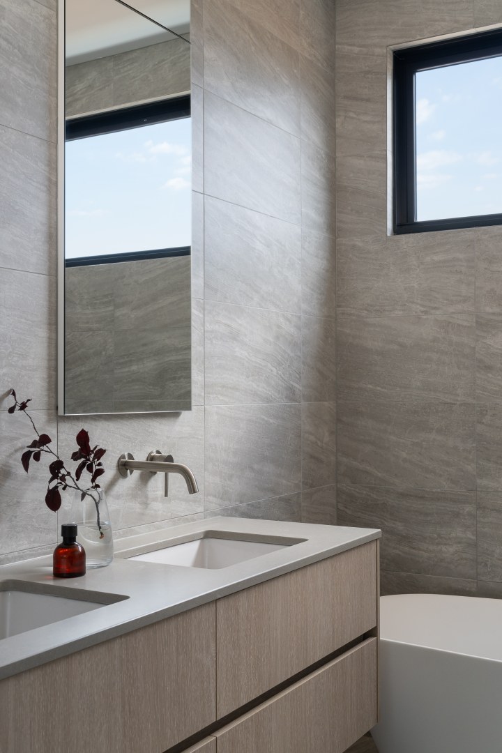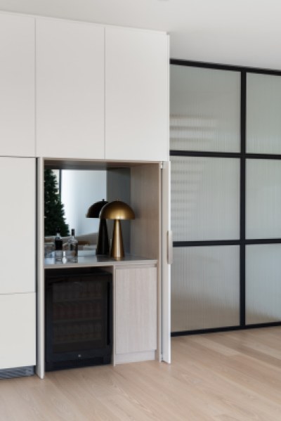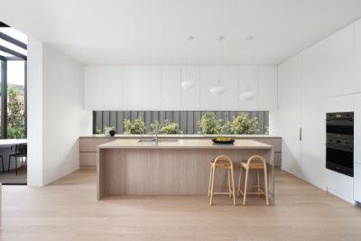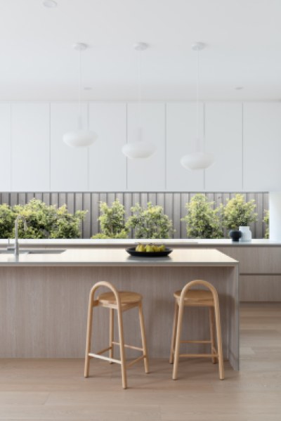 Chatsworth Townhouse showcases contemporary design using polytec’s Coastal Oak Woodmatt and Ultra White Venette finishes. The open-plan living area, with high ceilings and large windows, is bathed in natural light year-round. The kitchen, ideal for relaxation and entertaining, features a central island with stone benchtops and waterfall sides. Ample storage includes lower drawers and ceiling-height cupboards. A built-in wet bar nook adds to the kitchen’s functionality.