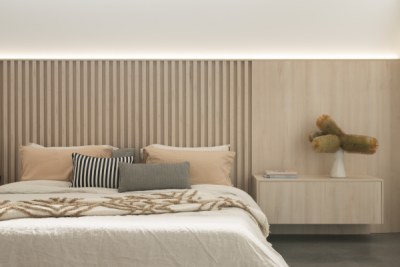 The brief for this cabinetry was to keep the design asymmetrical and to incorporate different products with the same finish. The end result was achieved by using Nordic Oak Woodmatt and 31x31 Steccawood battens, with the addition of lighting behind the bedhead to create an ambiance feeling.