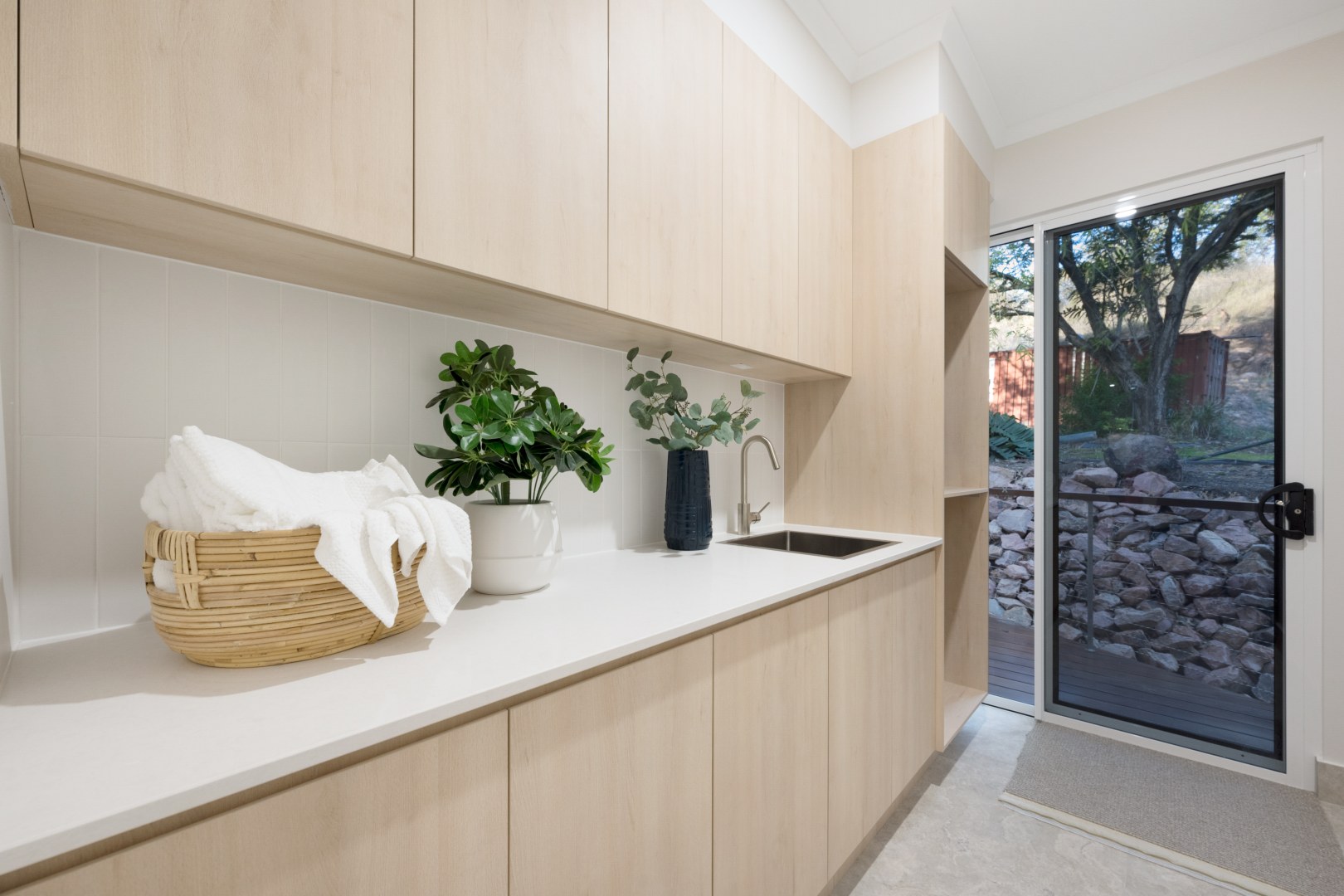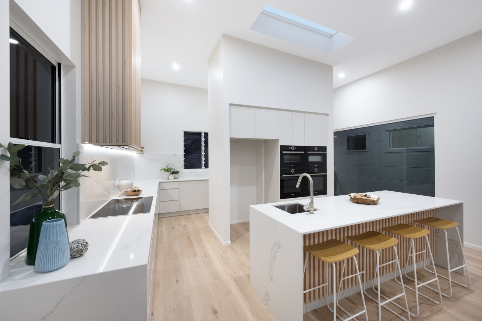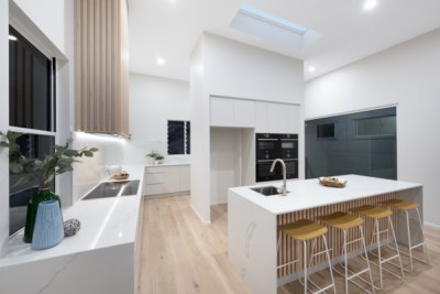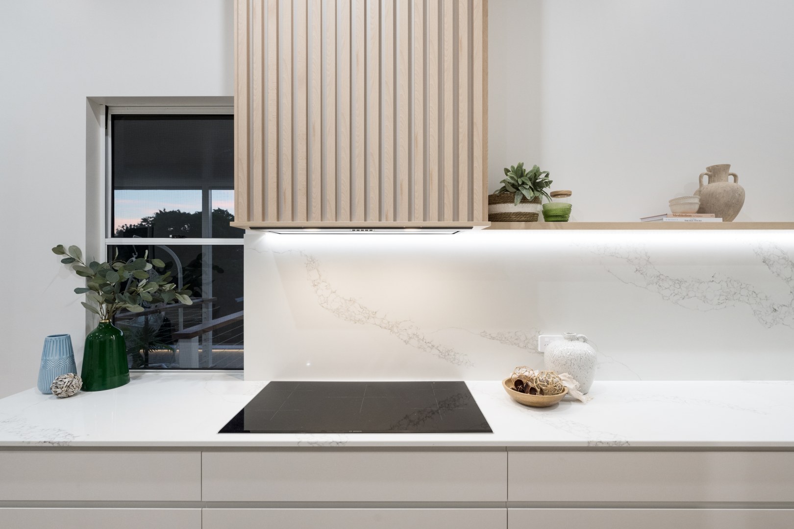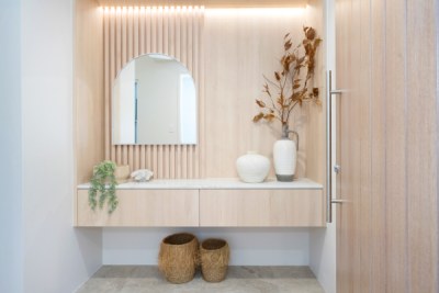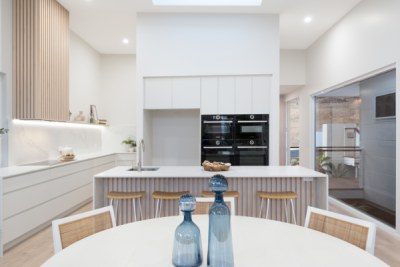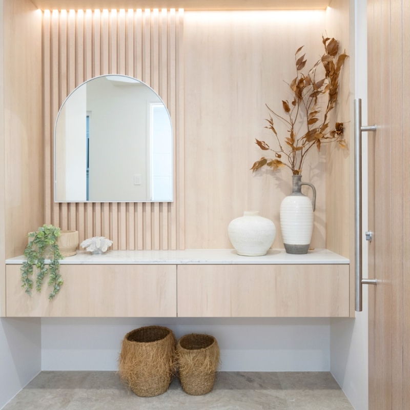 This project is clean-lined and tranquil, offering the essence of a modern Scandi home. It features pale timber with distinctive batten details, creating a blend of minimalism and comfort. The bathrooms are adorned with warm stone-look tiles, evoking a spa-like retreat. Unique joinery throughout the home marries form and function seamlessly. It's a space that embodies simplicity and elegance, offering a tranquil sanctuary for modern living in true Scandi style.