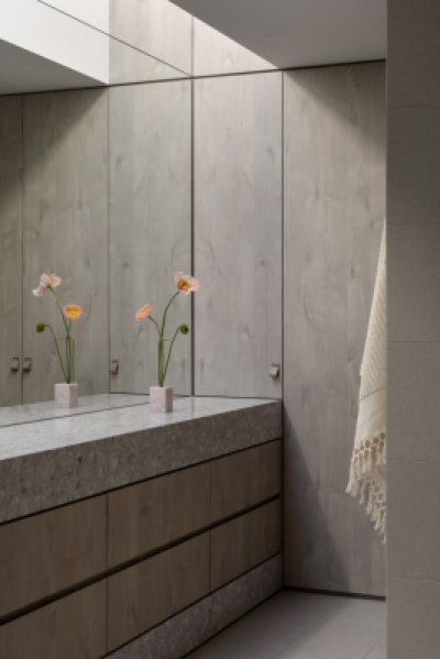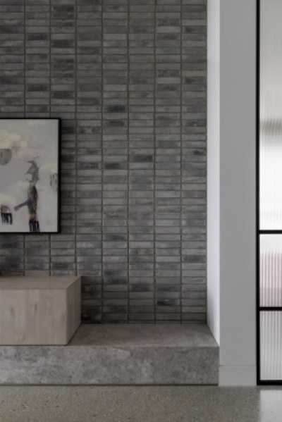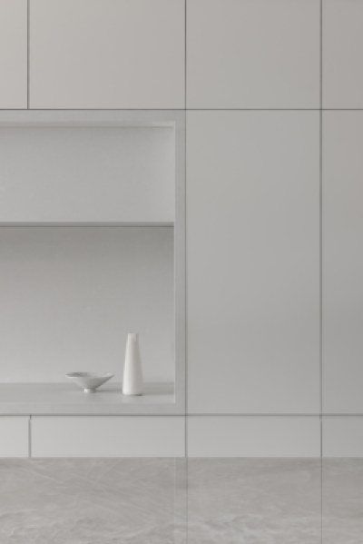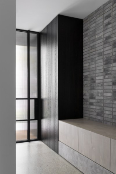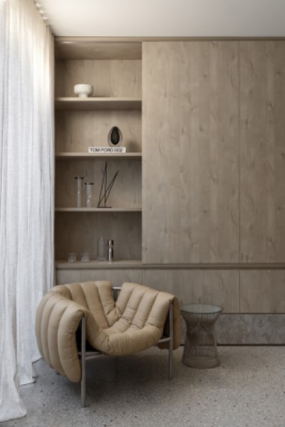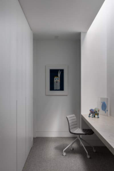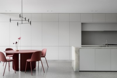 Designed to imbue warmth and tactility whilst being practical and functional for a young family. The design incorporates a paired back aesthetic. The kitchen features an expansive island bench, crystalline benchtop and seamlessly integrated appliances. The white cabinetry provides a homogenous backdrop to appreciate the clients accent table and pendant light in the foreground. The primary ensuite and walk-in-robe, entry, study and sitting room all feature crafted Angora Oak joinery.