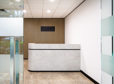 A stunning curved reception desk greets visitors as they enter. The desk is created from polytec Portofino Stone Smooth with a Black Venette shadowline. Behind is a gorgeous feature wall using polytec Steccawood in Natural Oak Ravine, making this the perfect first impression for customers.