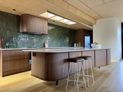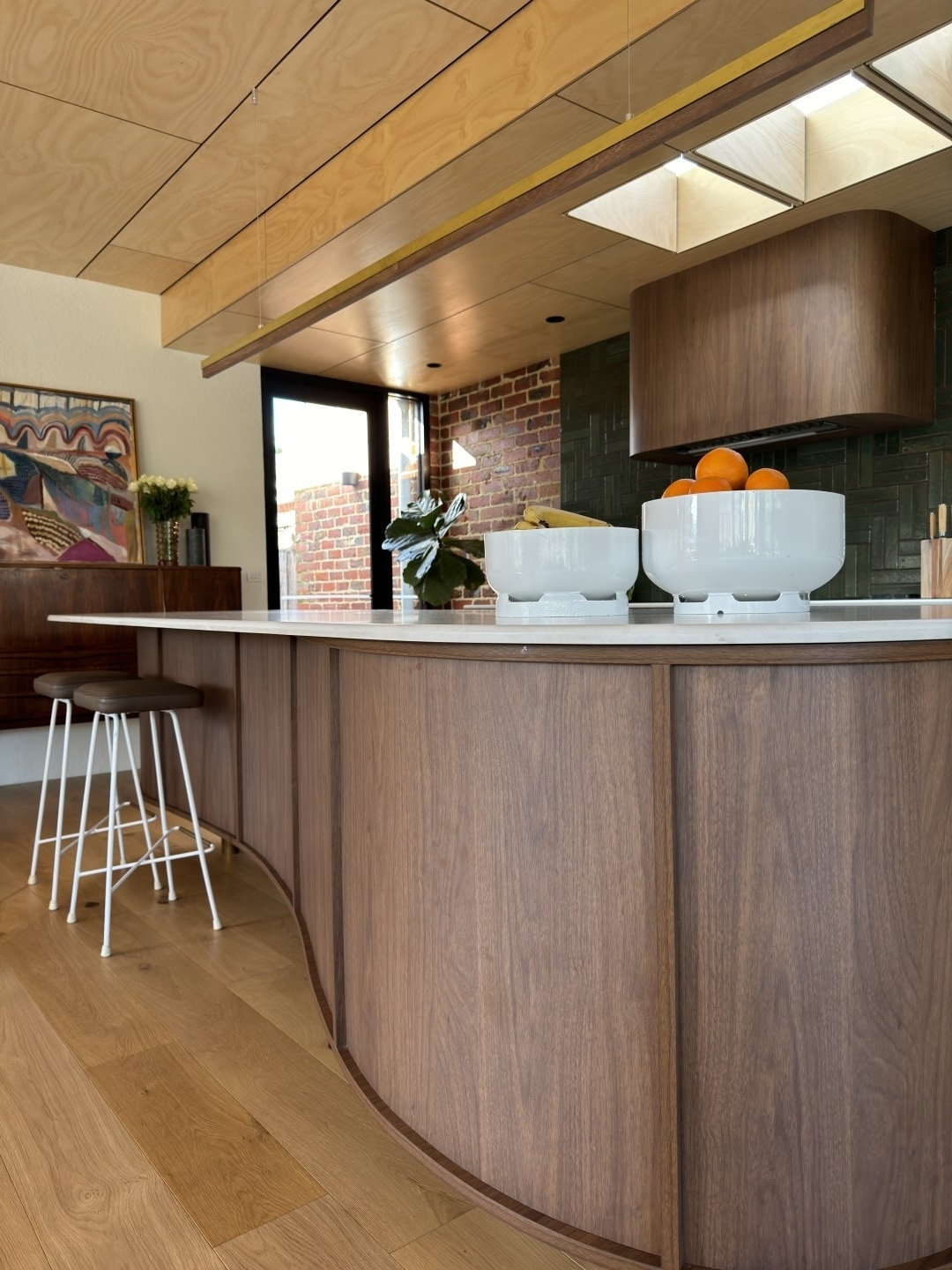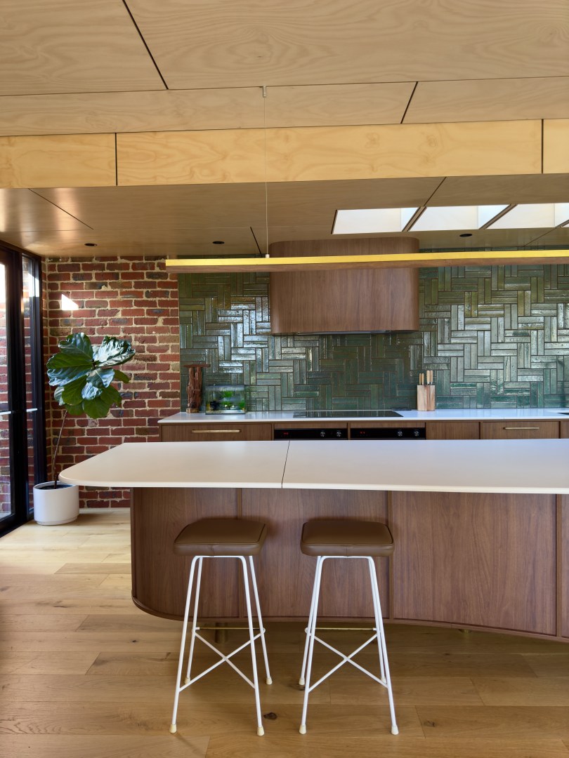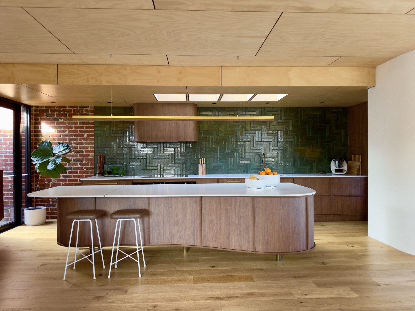 This amazing project involved a large, modern renovation/ extension on the back of an existing 1950’s clinker brick house. The clients requested the incorporation of curves, clean lines, natural light and a warm colour palette in the open plan kitchen/ living to complement the use of hoop pine ply throughout the extension.