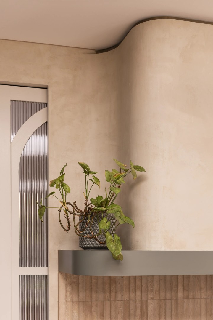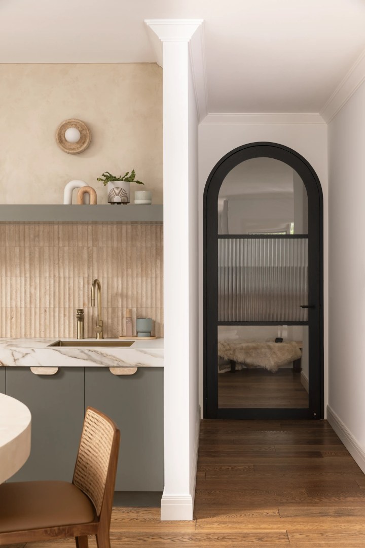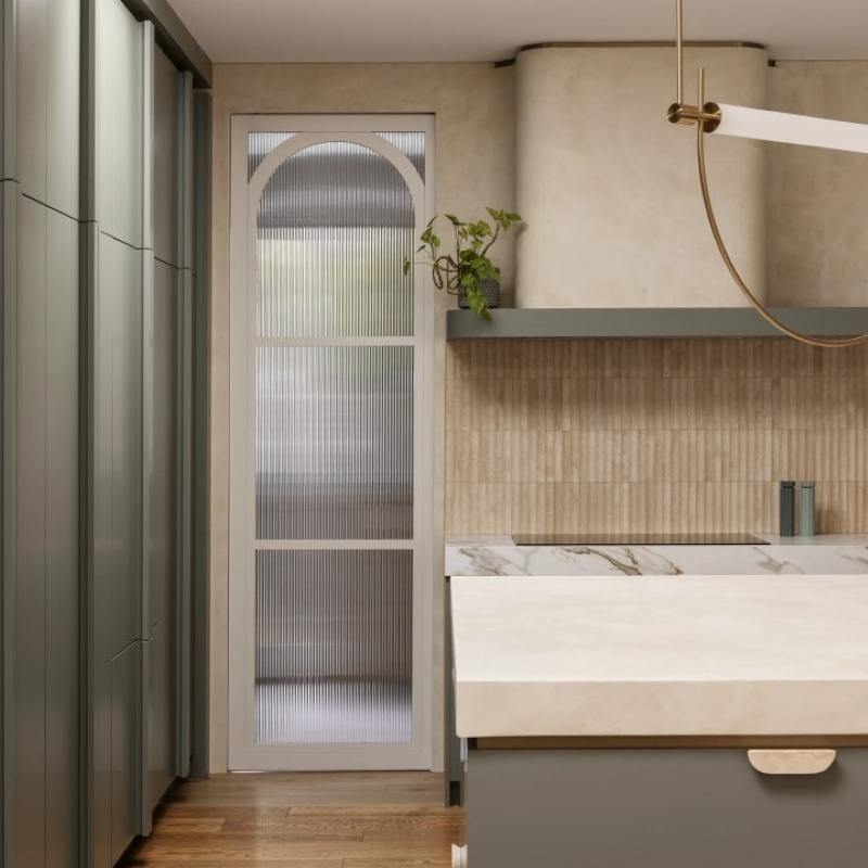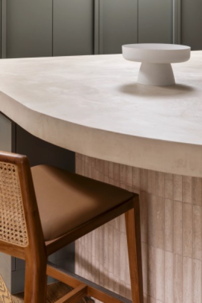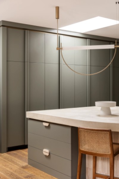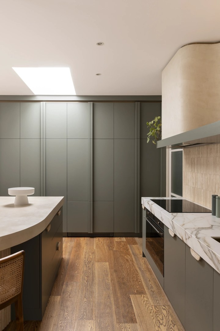 This project is for a family home in Hampton, the kitchen has a deco twist! The client wanted a warm, inviting entertainers kitchen and mostly she wanted to use green joinery. We have used micro cement benchtops, and rangehood joinery colour selected to bring through the warmth of the natural travertine tiles. We have custom joinery handles made to suit, as well as brass shadowline detailing to the ceiling. Lots of detail in this one!
