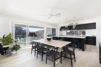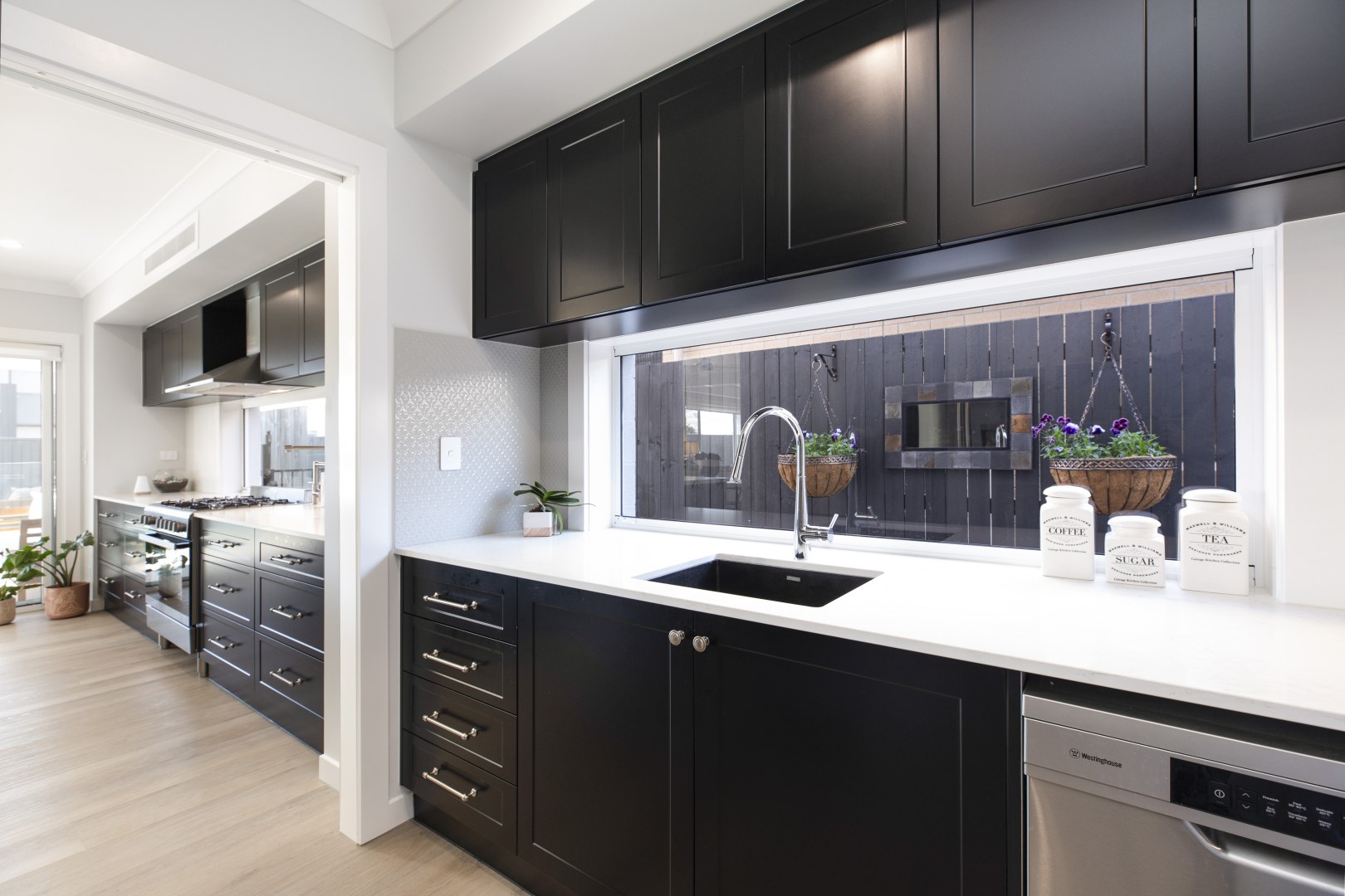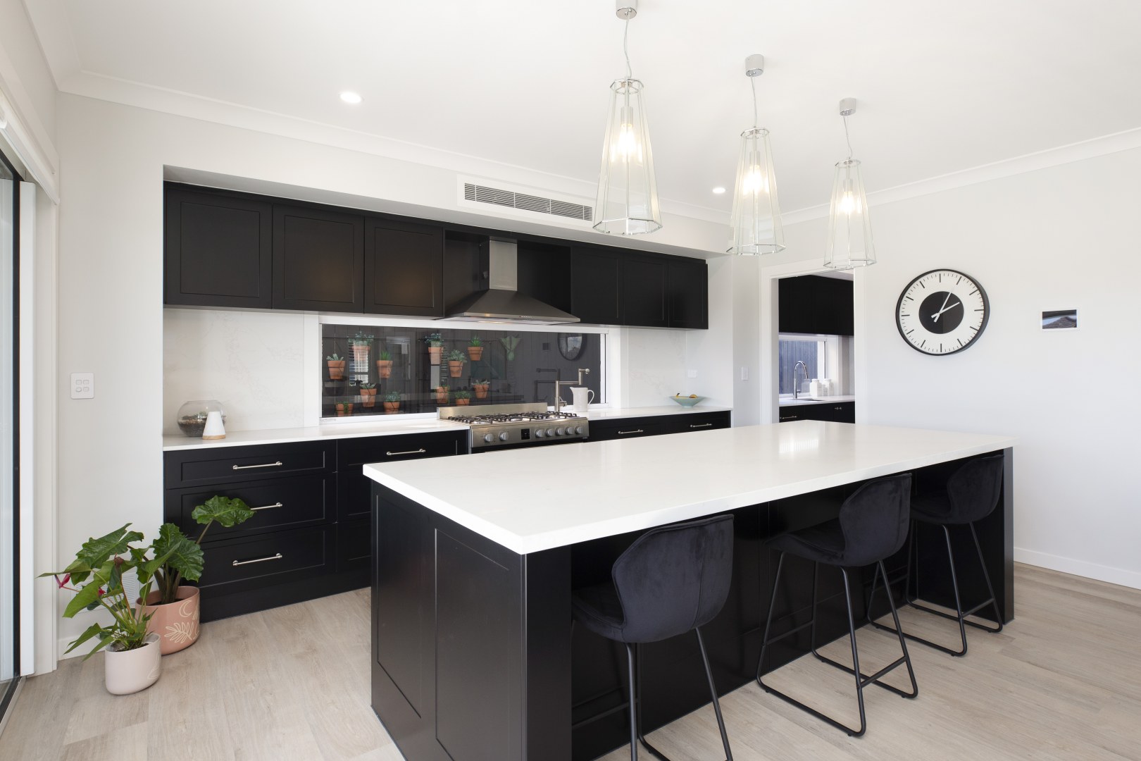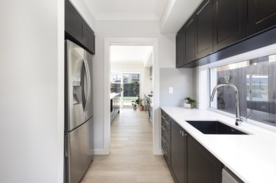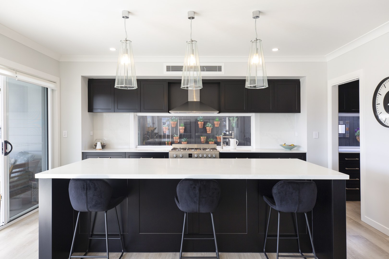 This spacious Hamptons kitchen exudes elegance with its sleek black matt cabinetry, creating a striking contrast against the bright and airy backdrop. The large island serves as a focal point, perfect for both meal prep and casual dining. The kitchen seamlessly flows into a generously-sized butler's pantry, offering ample storage and additional prep space. The combination of luxurious finishes and functional design makes this kitchen an ideal space for both everyday living and entertaining.