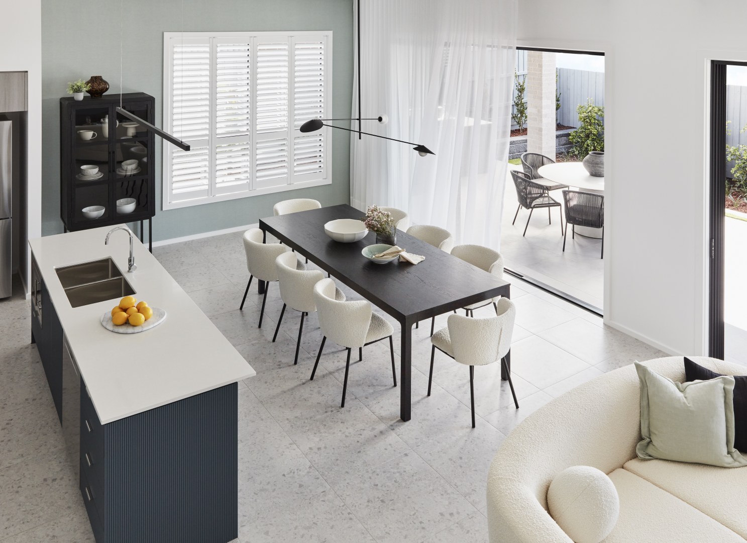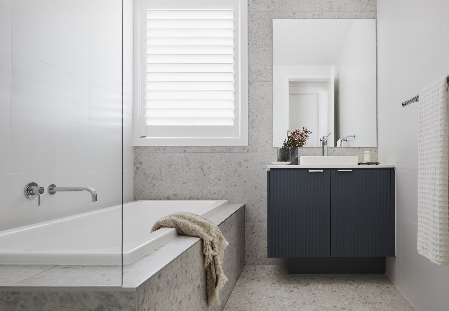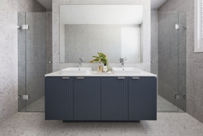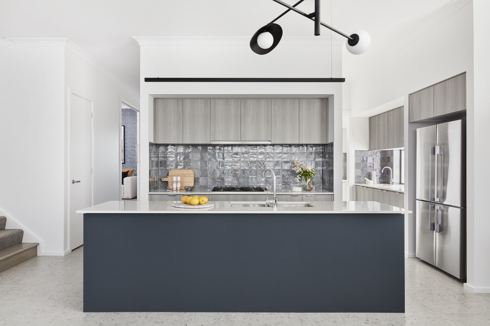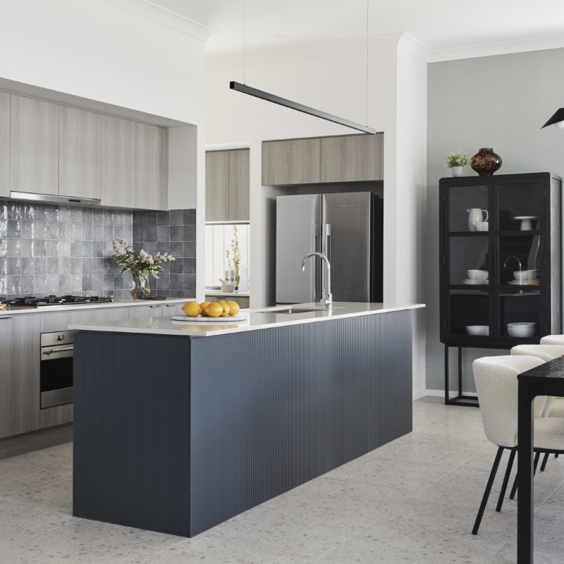 A double storey contemporary home with a study/home office to the ground floor enabling a work-from-environment, or the alternate usage as a bedroom with adjacent bathroom, suitable for optional family living or guest accommodation. Colours and finishes were kept to a simple, cool palette of greys and blues with hints of tan and black providing a relaxed interior with a minimalist vibe.
