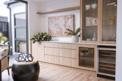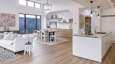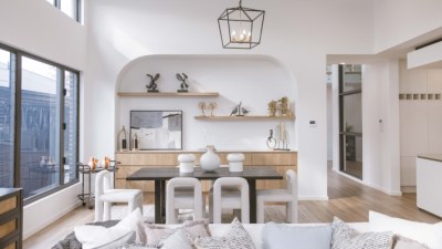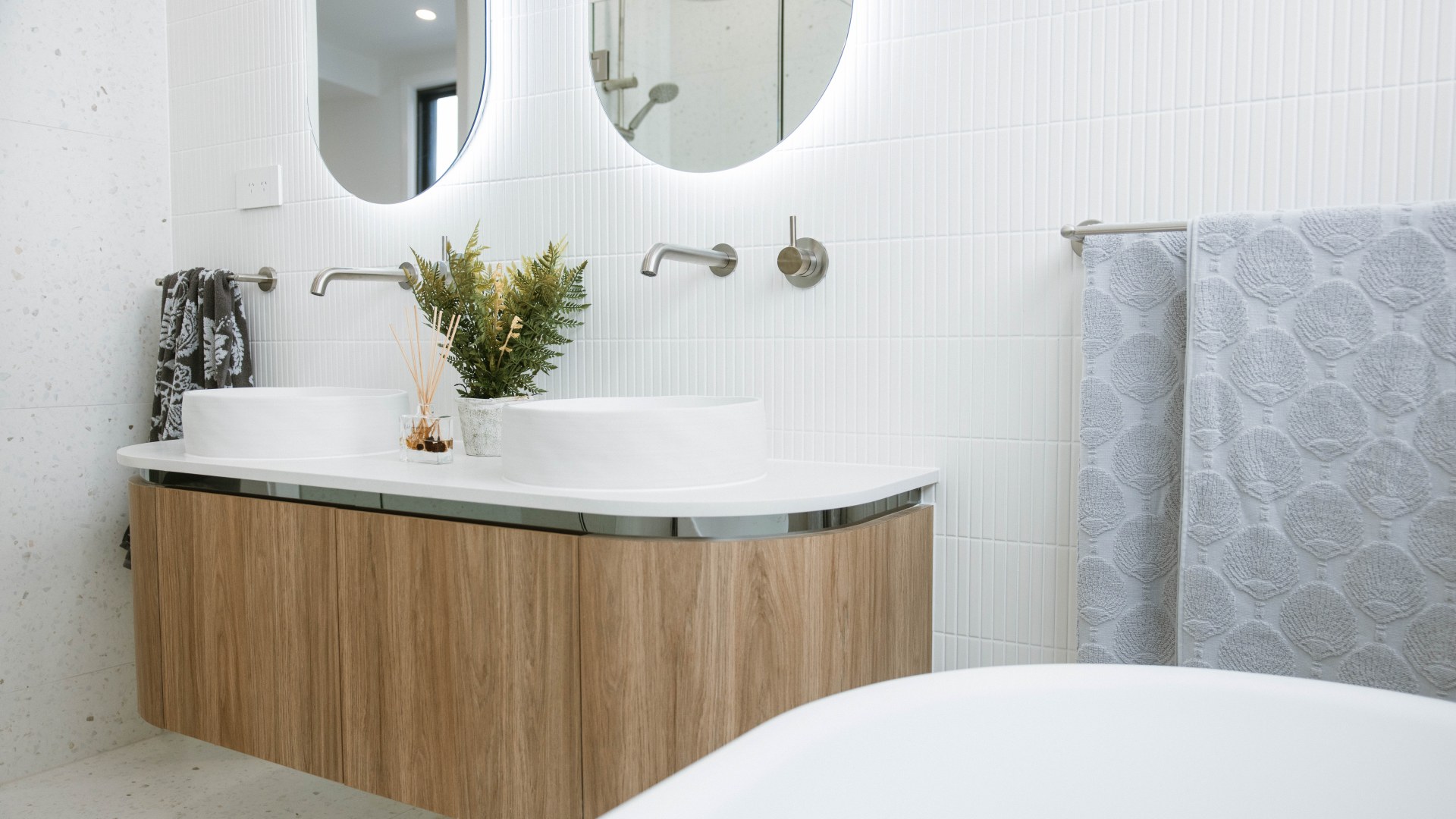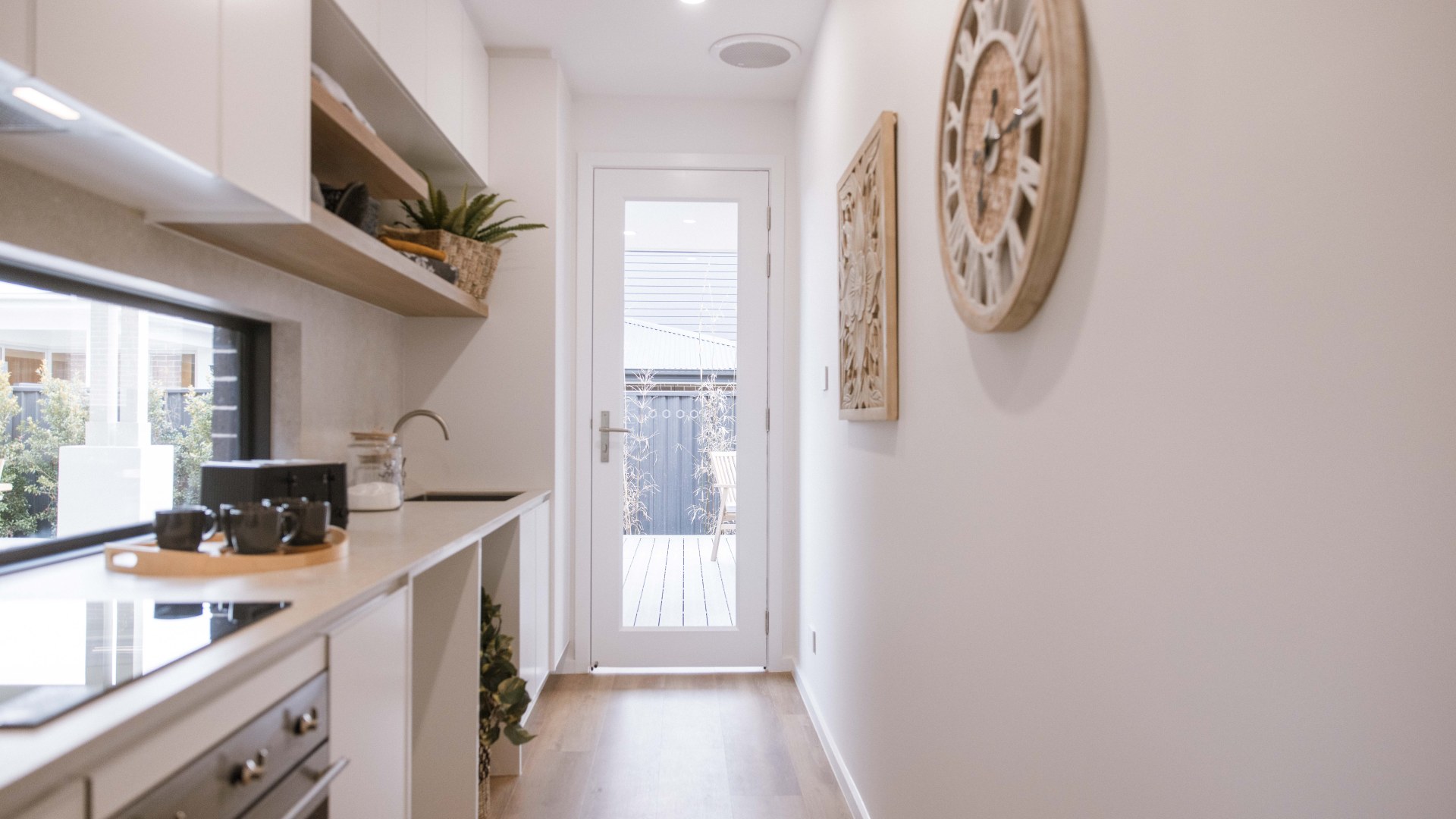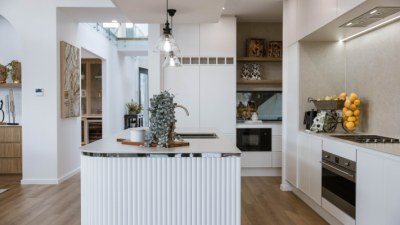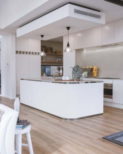 Modern family home oozes unrivalled sophistication and luxury. elegant features were used to achieve the overall design of the kitchen, Butler's, WIR & Vanities include bright white cabinetry ultra-thin profile in Thermolaminate Chifley Profile Blossom White, timber look in polytec Prime Oak Woodmatt and a 12mm porcelain b/top & splashback. The island mimicking the curve of the façade uses Steccawood 17x34 Half Round, whilst the kickboard & shadowline feature a mirrored effect.