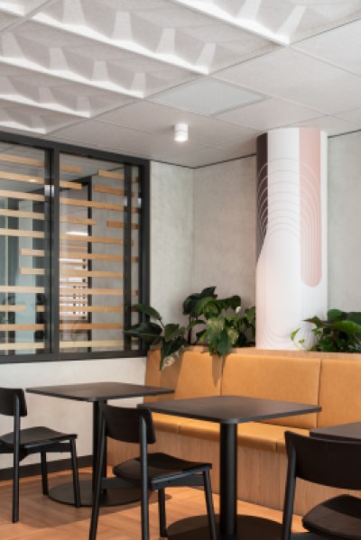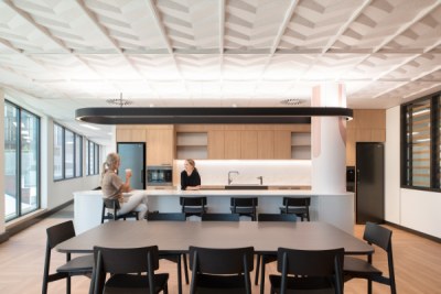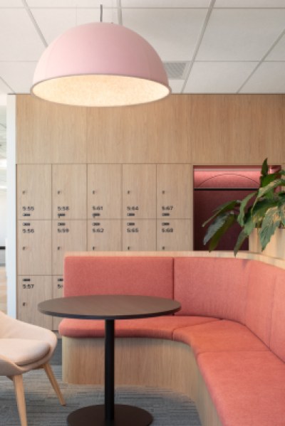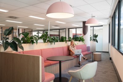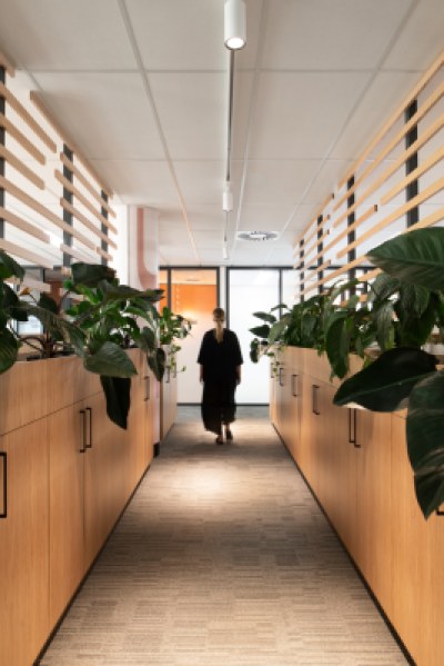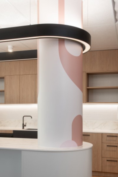 The new Hospital Services Hub embodies an adaptable and inclusive workplace model providing staff with a cohesive, dynamic, and flexible workspace. The placement of built form optimises natural light creating vibrant and energetic open work and collaboration spaces. The design incorporates warm timber tones, textured finishes and feature lighting, establishing an inviting ambiance. Strategically placed colours inject energy and warmth into the space, while providing a sense of identity.