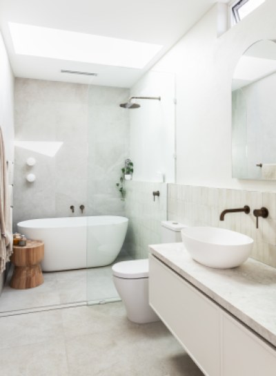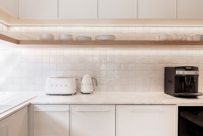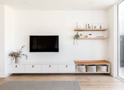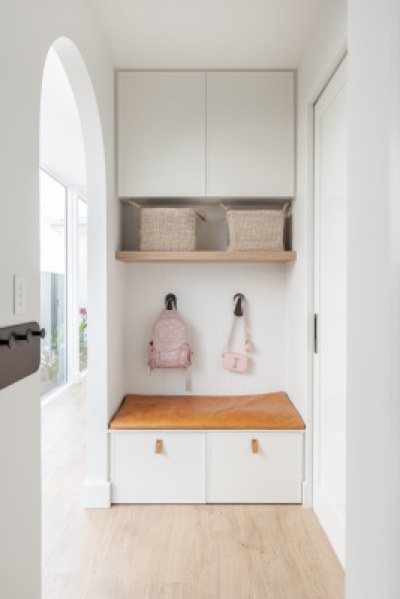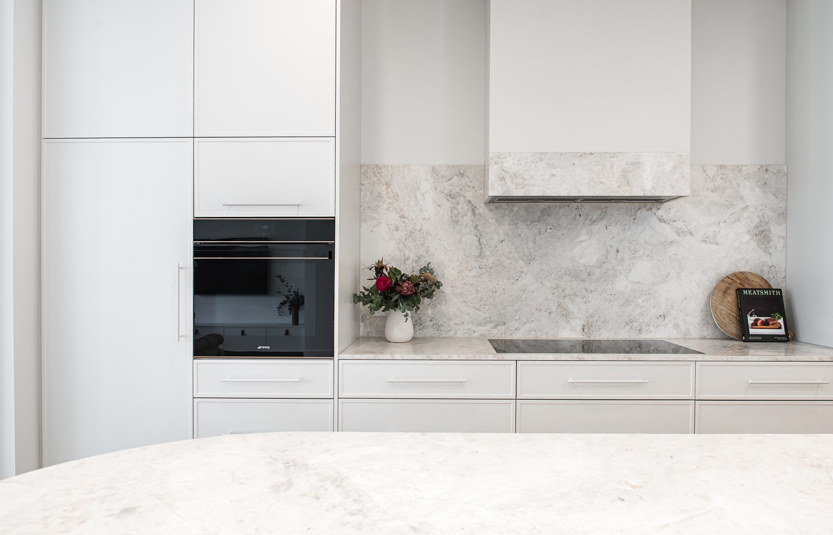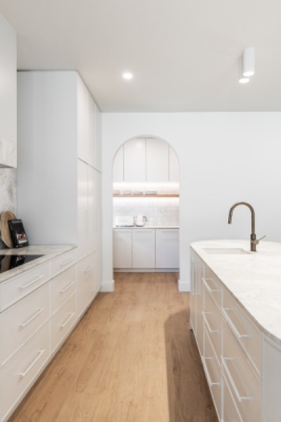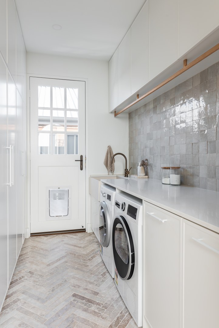 This light, family home plays with texture and layers white to create a fusion of modern Australian coastal and modern Mediterranean style. polytec Thermolaminated doors in the "Sussex" profile were used throughout with Boston Oak Woodmatt shelves as an accent.