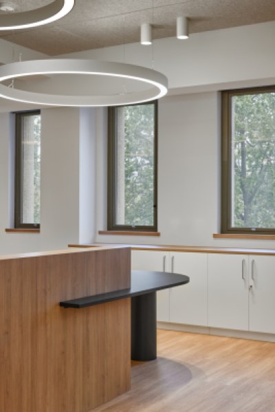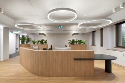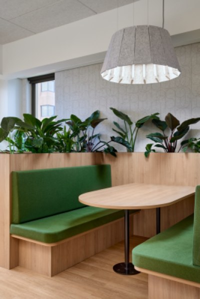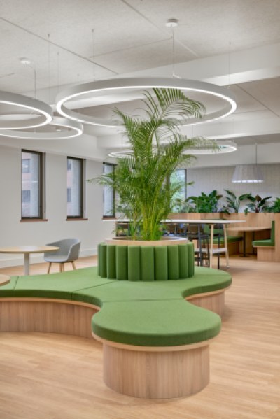 The predominate design feature of the space was the organic form of the central seating and help desk, highlighted by the high ceiling and feature lighting. Warm and neutral tones were used with hints of green maintaining the cohesive colour palette throughout the Hydro building.