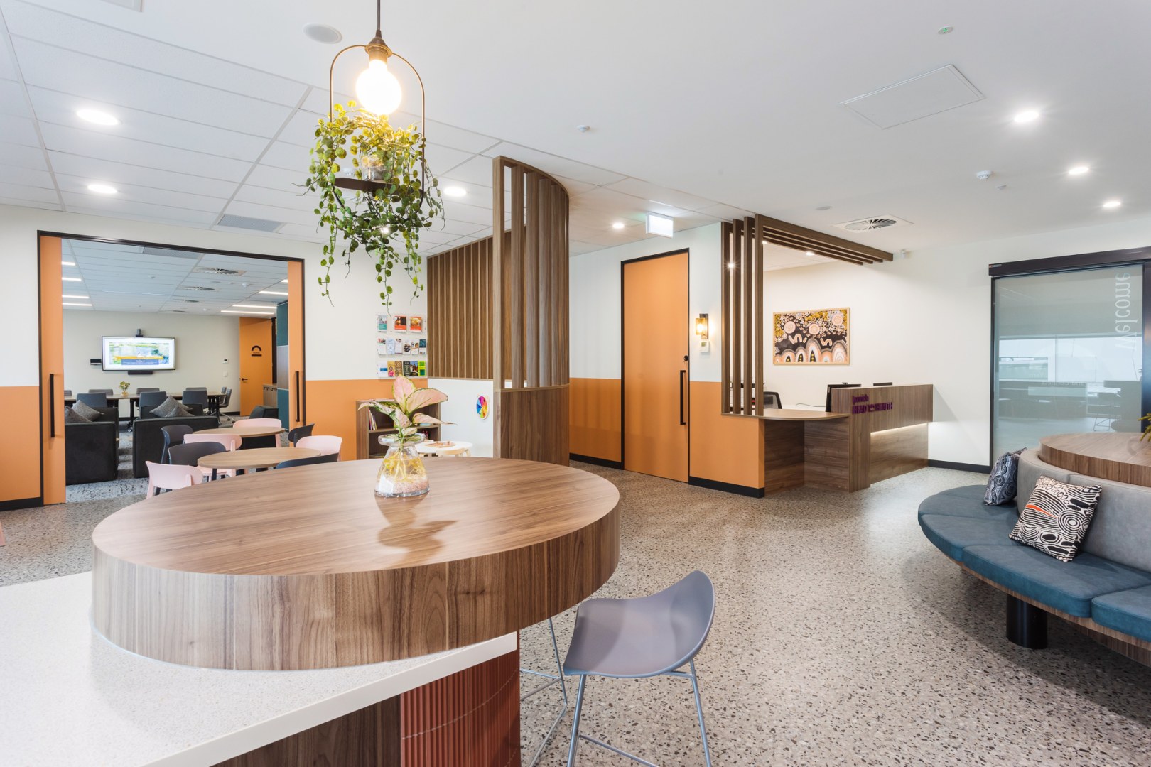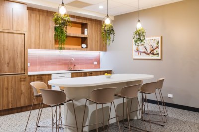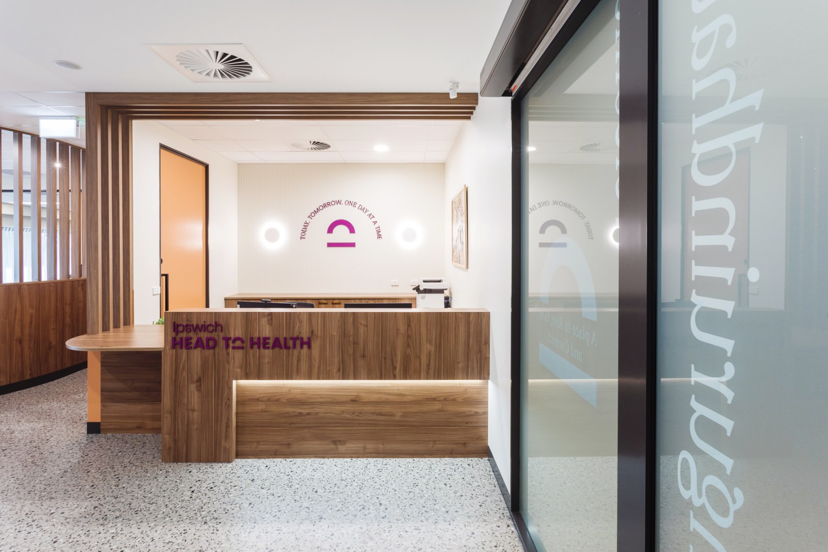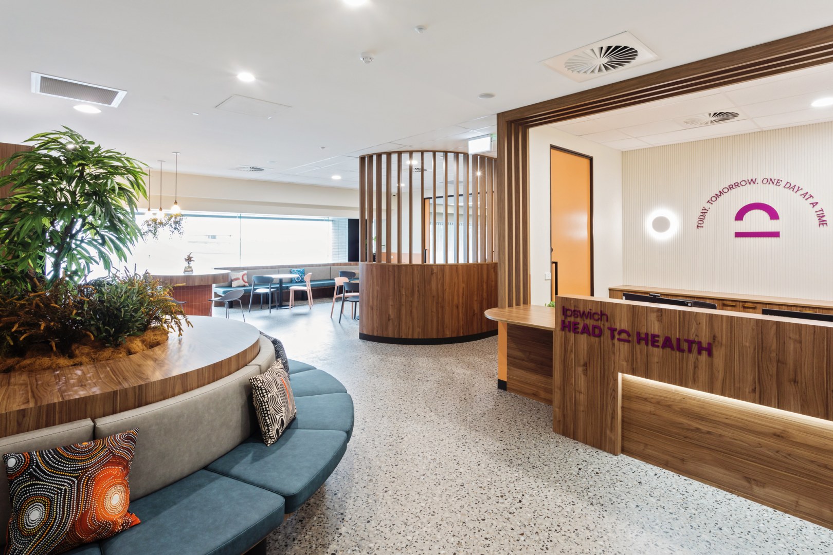 Ipswich's Head to Health aspires to establish a welcoming mental health center that provides psychosocial services & support within the community. Its thoughtful design ensures smooth flow, clear organisation, and ample natural light through full-height windows. The use of natural materials, warm timber tones from polytec, plants, lighting, First Nations art, and soft furnishings creates an inviting, functional space. The goal is to enhance lives by fostering a supportive mental health community.