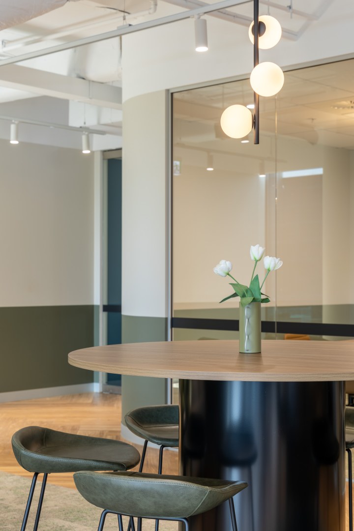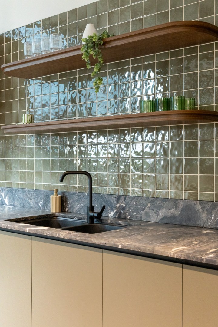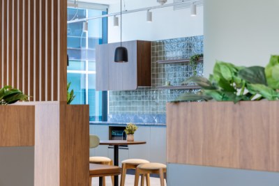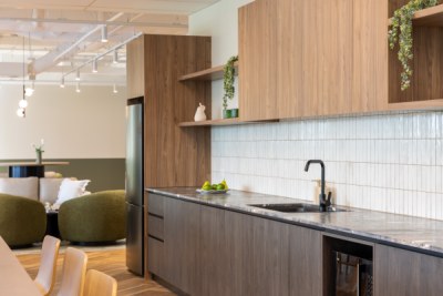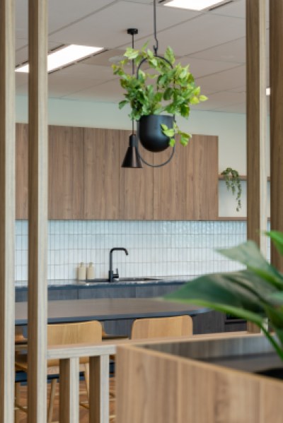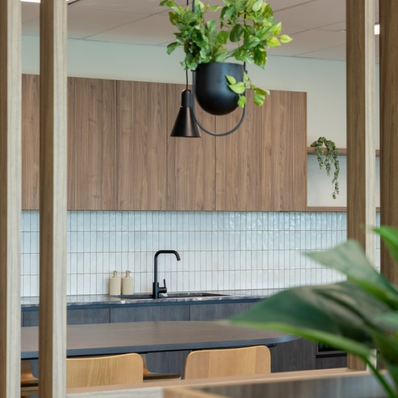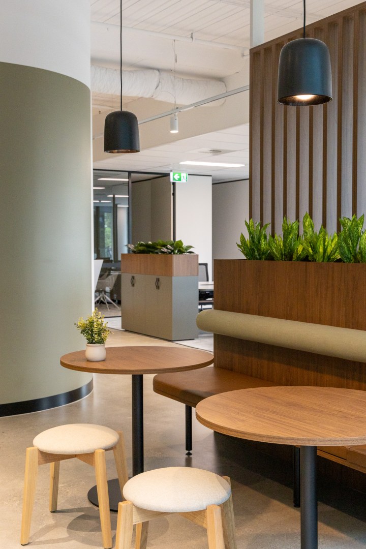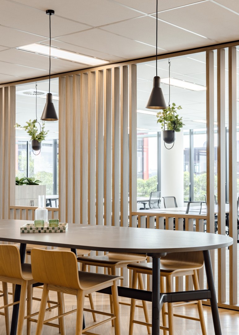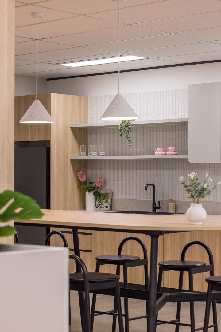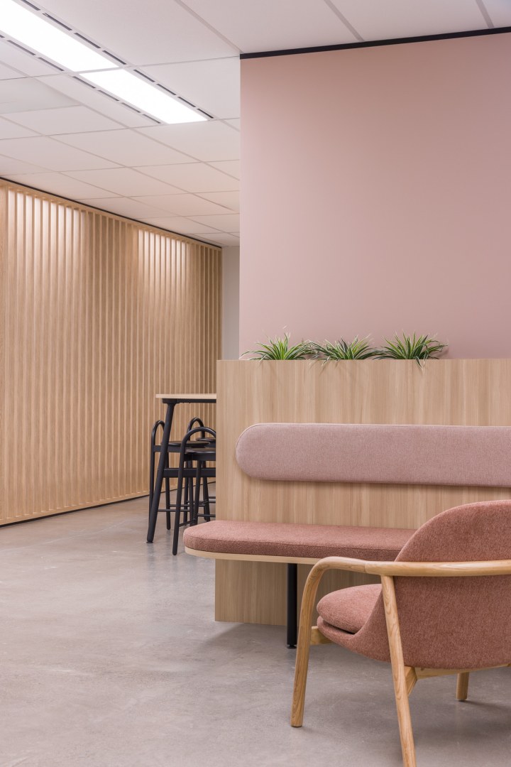 Sheldon’s teams worked collaboratively and nimbly to tackle the scope of this project. The design of each suite is inspired by its connection to the local environment, which shines through in each colour palette. From soft pinks to tonal greens, these colours offer a calming working environment that encourages focus work. Each space features custom Sheldon-manufactured joinery, making a striking impression in timber battening that divides kitchens from the open plan work points.