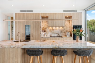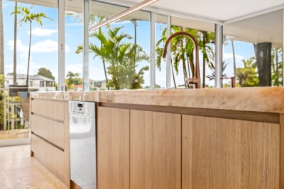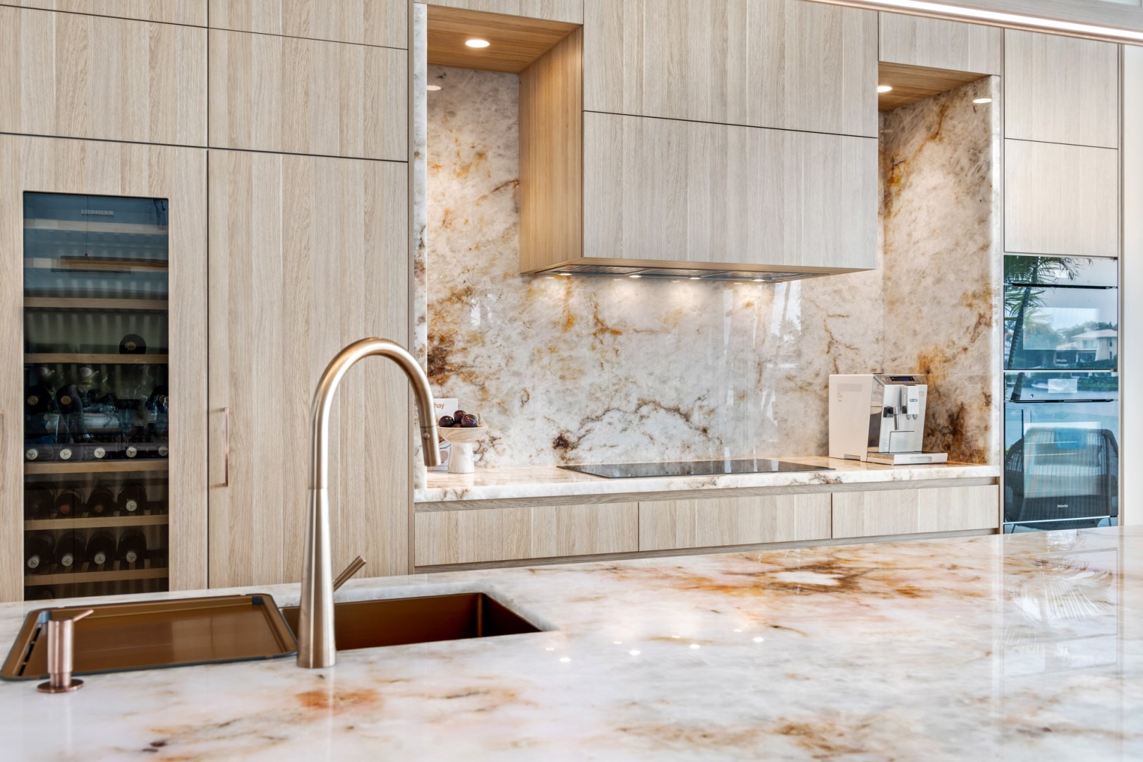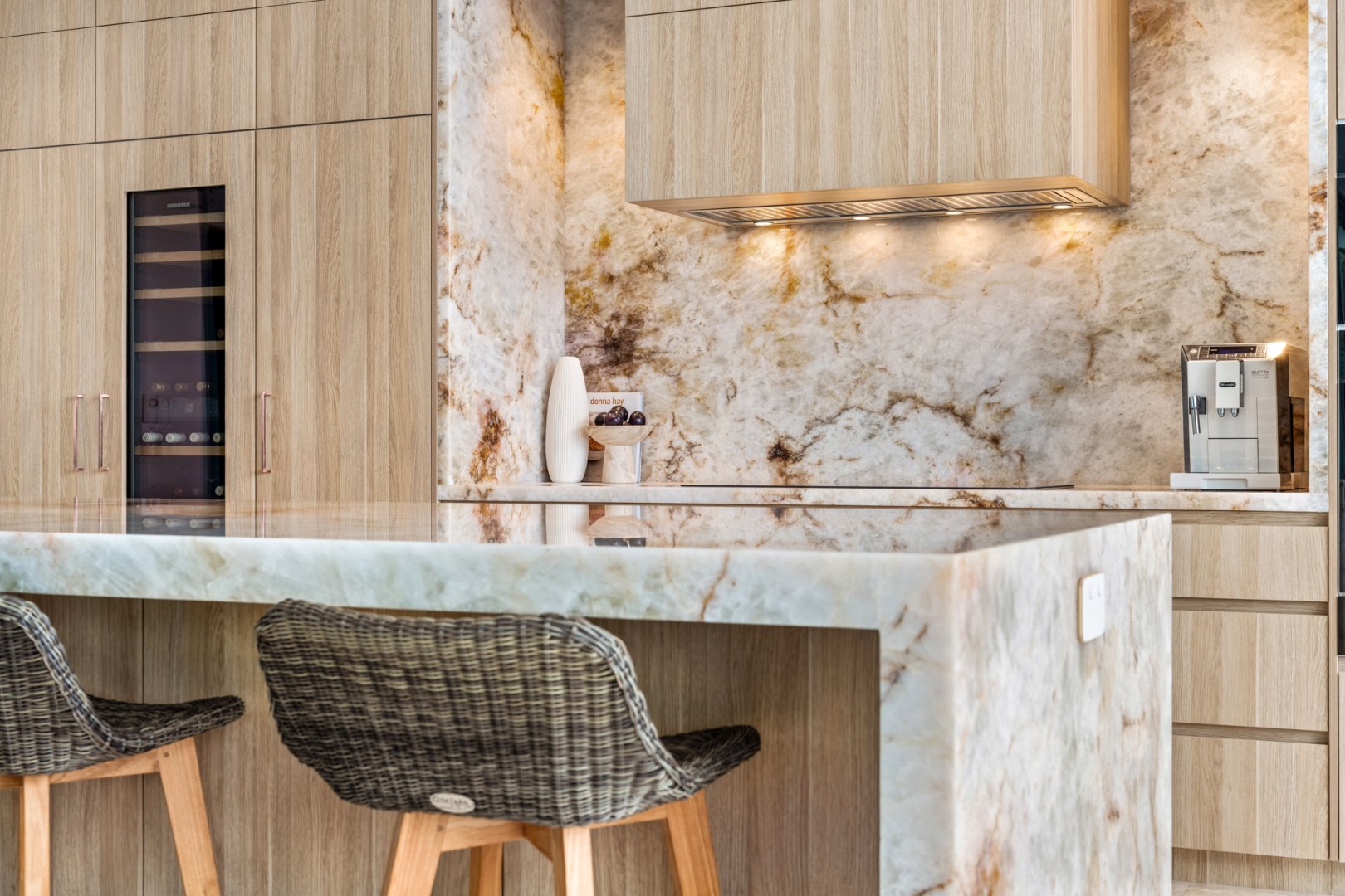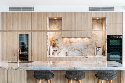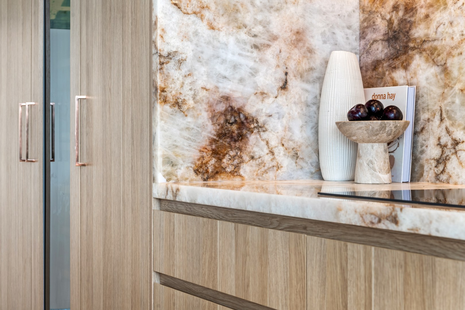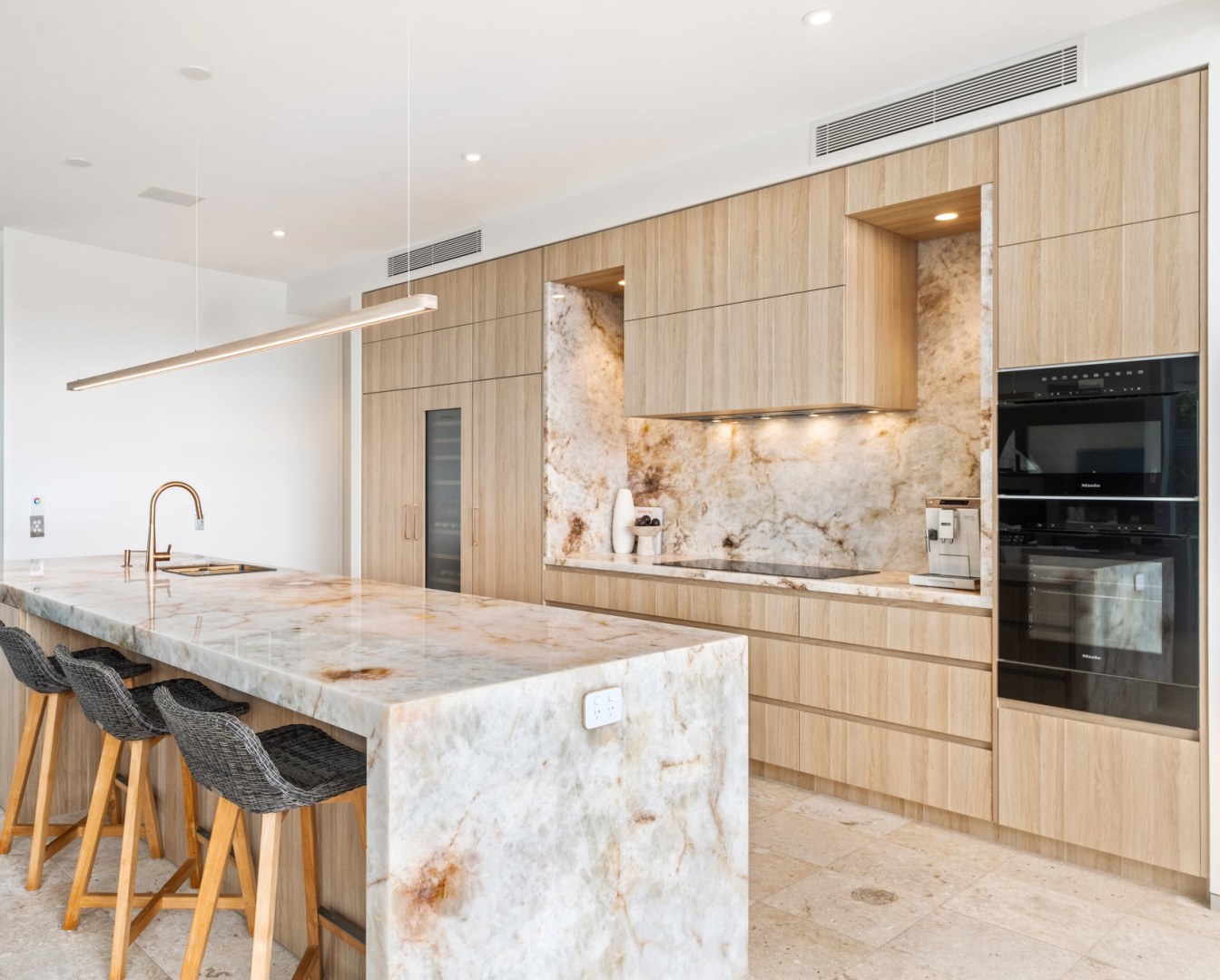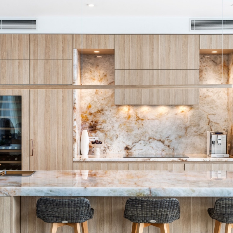 This Kitchen project aimed to uplift the residence to match surrounding property values. Client sought a blend of contemporary and timeless aesthetics. polytec Natural Oak Ravine was chosen for its seamless integration with existing travertine flooring and compatibility with existing timbers. Its tactile refined finish elevated the cabinetry to match the elegance of the selected natural stone to provide the WOW the client wanted. Enhanced by brushed copper accents, LEDs & Blum Servo Drive.