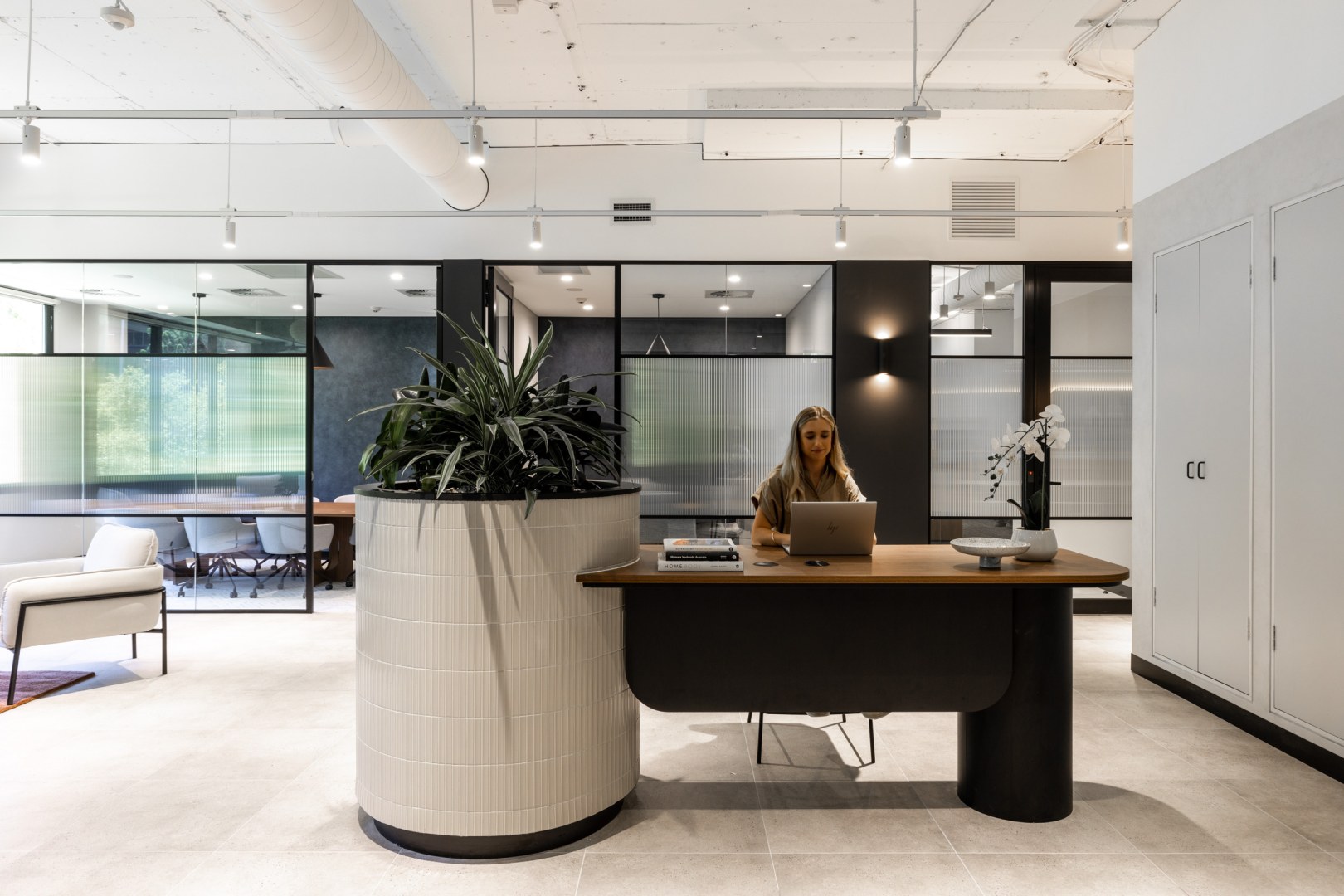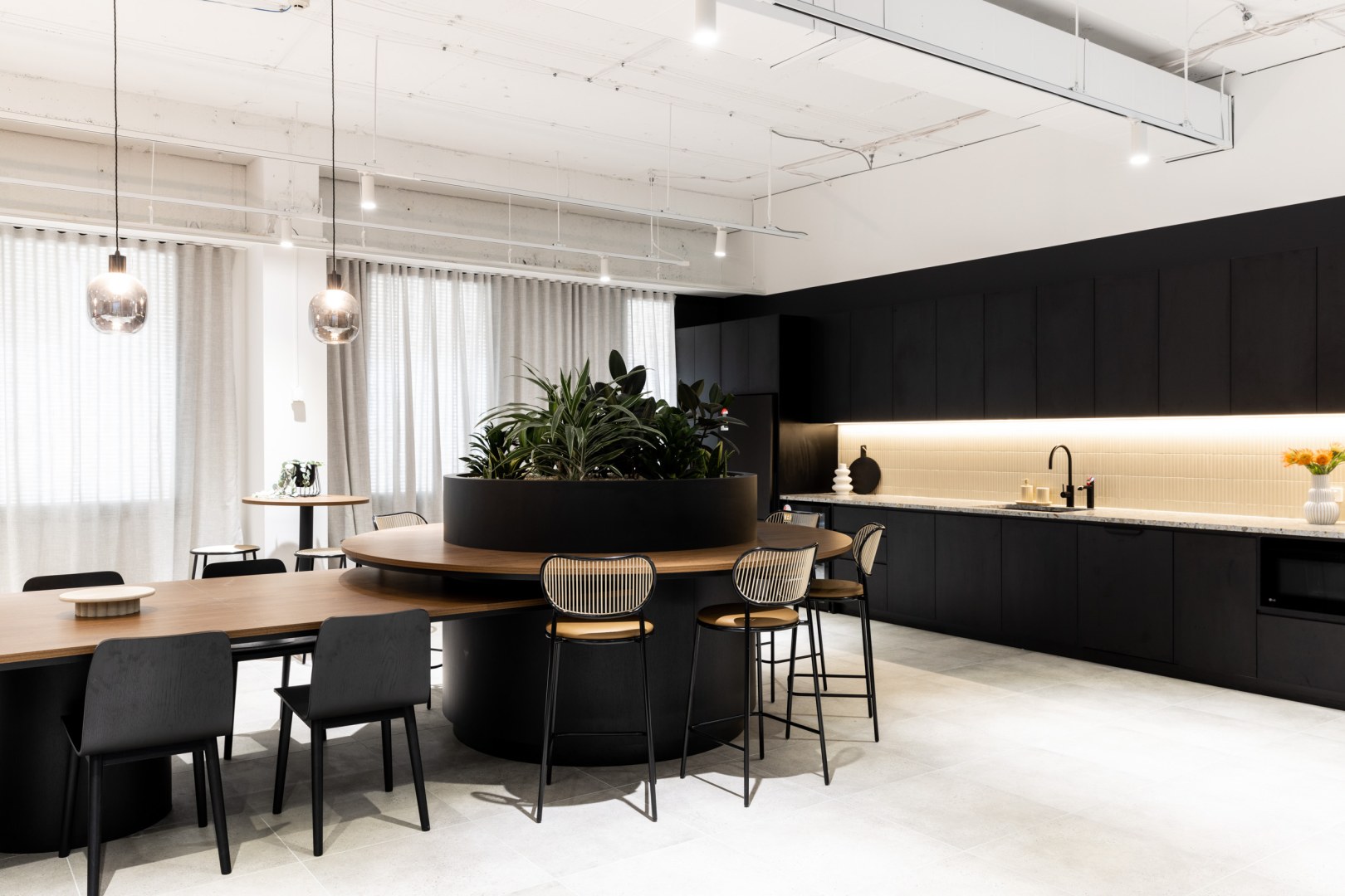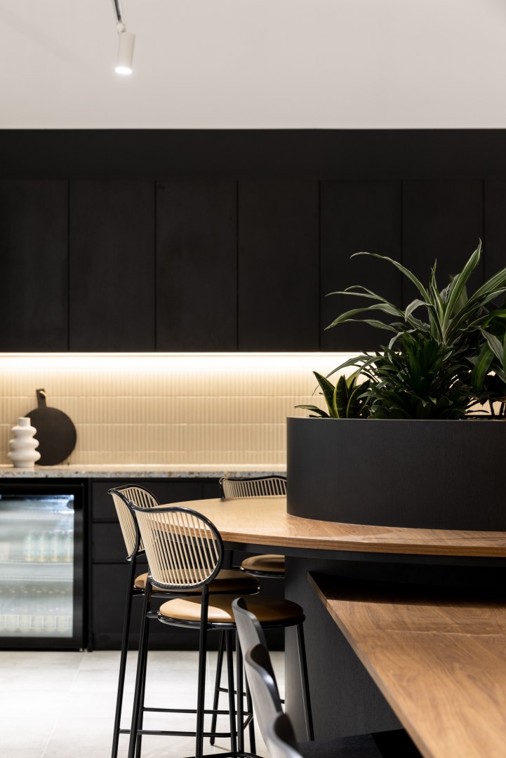 Surrounded by parkland in Sydney CBD, Lawson Elliott’s workplace boasts elegance, taking notes from boutique art deco design. A nod to the art deco building is created though the bold colours and dramatic lighting. The custom joinery is testament to Sheldon craftsmanship, with bespoke features like an awards wall, shelving, and a unique, luxurious kitchen design. Soft residential furnishings, coupled with biophilic elements for wellbeing, enhance the comfort and atmosphere.