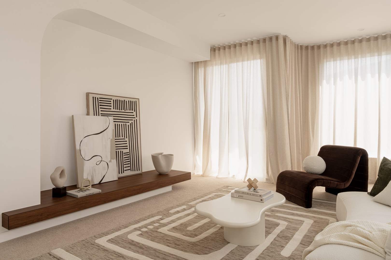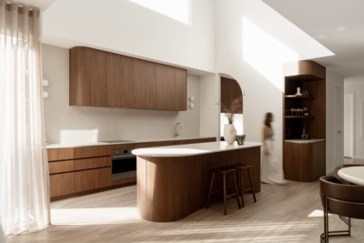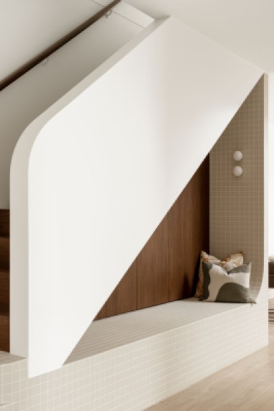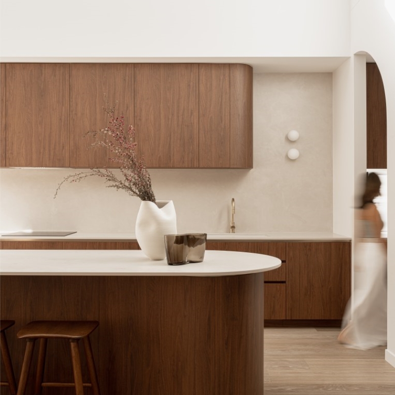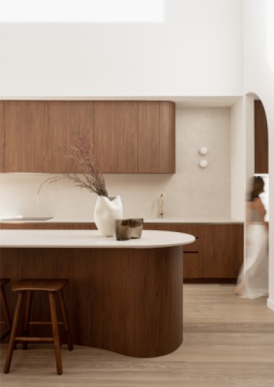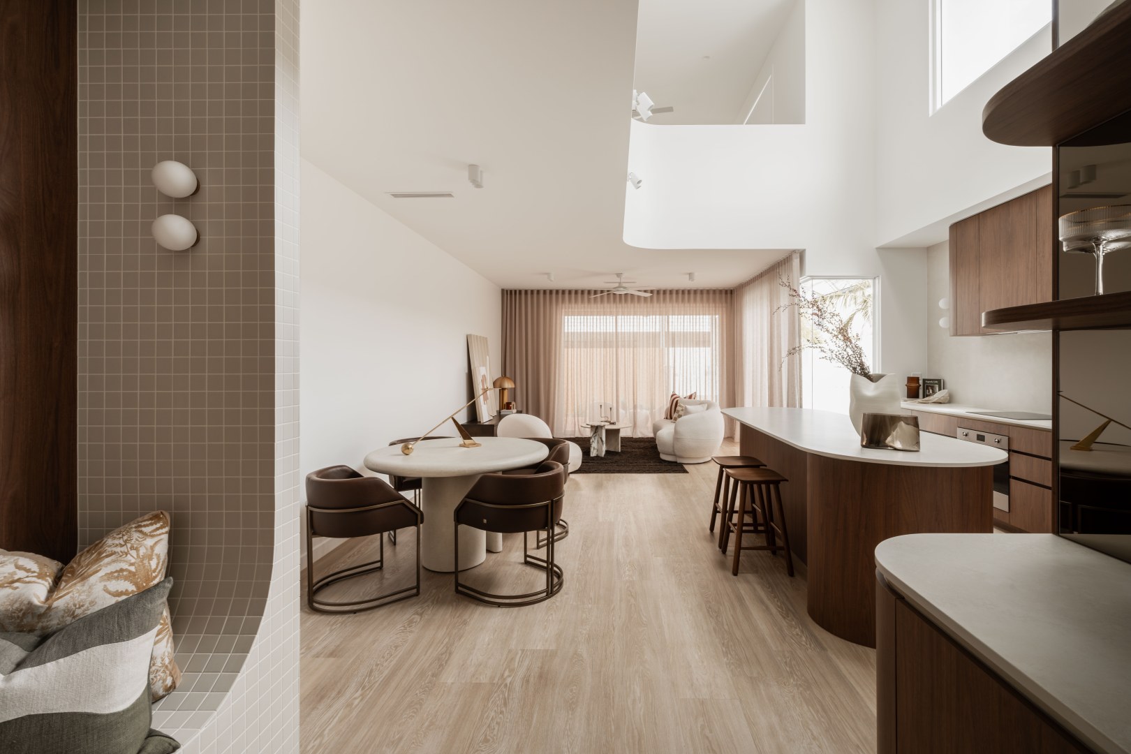 Layà Villas, inspired by Morotai Island's WWII role in liberating the Philippines, celebrate freedom & uniqueness. These dry block duplexes defy suburban norms. Villa B offers a sophisticated retreat. A blend of mid-century modern and art deco styles creates a hotel-like experience with organic curves, deep warm tones, and luxurious styling. Brass and bronze details further elevate the luxe vibe, making Villa B akin to a boutique hotel encouraging residents to leave their concerns at the door.