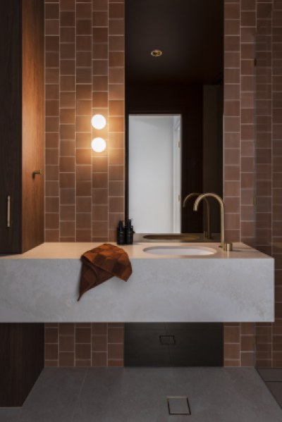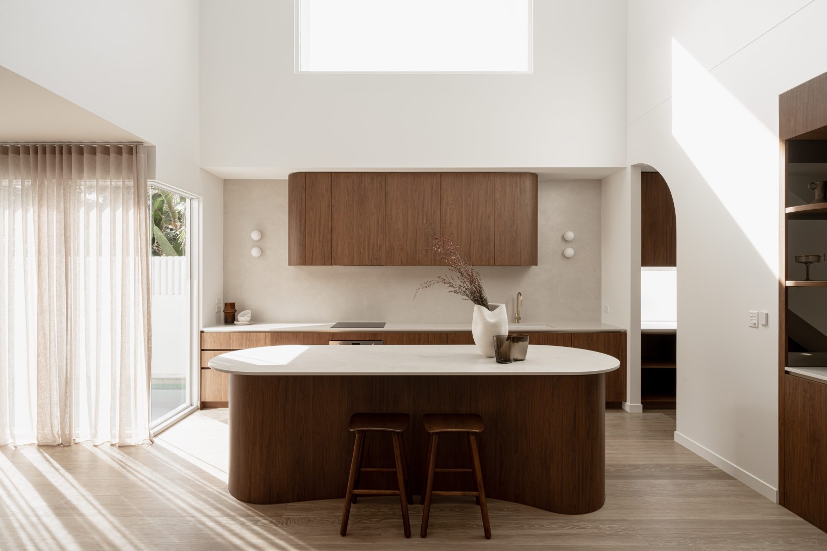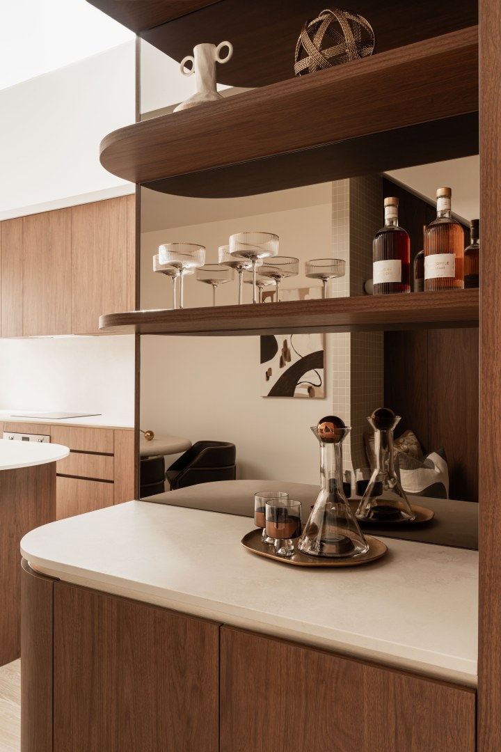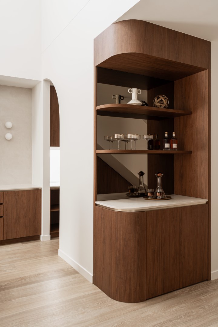 Layà Villas, inspired by Morotai Island's WWII role in liberating the Philippines, celebrate freedom & uniqueness. These dry block duplexes defy suburban norms. Villa B offers a sophisticated retreat. A blend of mid-century modern and art deco styles creates a hotel-like experience with organic curves, deep warm tones, and luxurious styling. Brass and bronze details further elevate the luxe vibe, making Villa B akin to a boutique hotel encouraging residents to leave their concerns at the door.