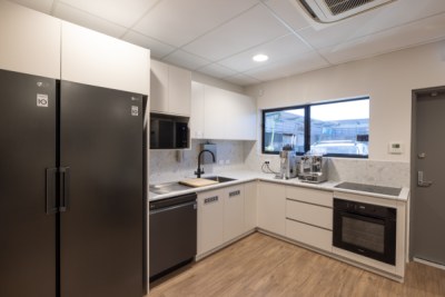 Lumina Eye Centre redefines the medical experience. Florentine Walnut Woodmatt by polytec takes centre stage, creating a warm and inviting atmosphere. Rich walnut cabinetry is complemented by sleek, warm grey marble accents and a lighter timber floor, exuding a sense of high-end sophistication. This thoughtful design prioritizes both patient comfort and a premium aesthetic.