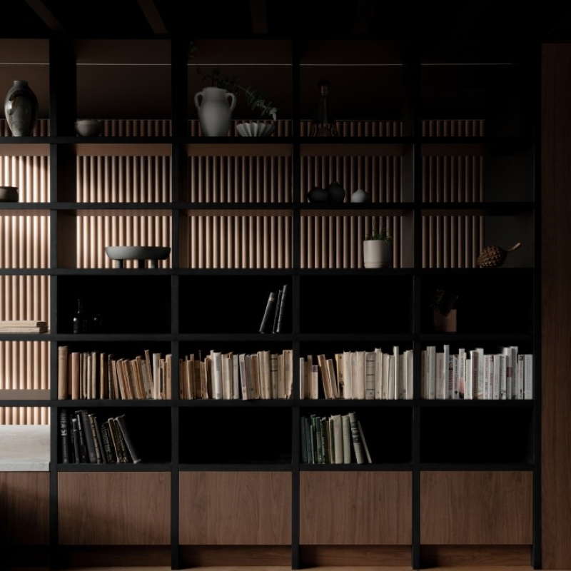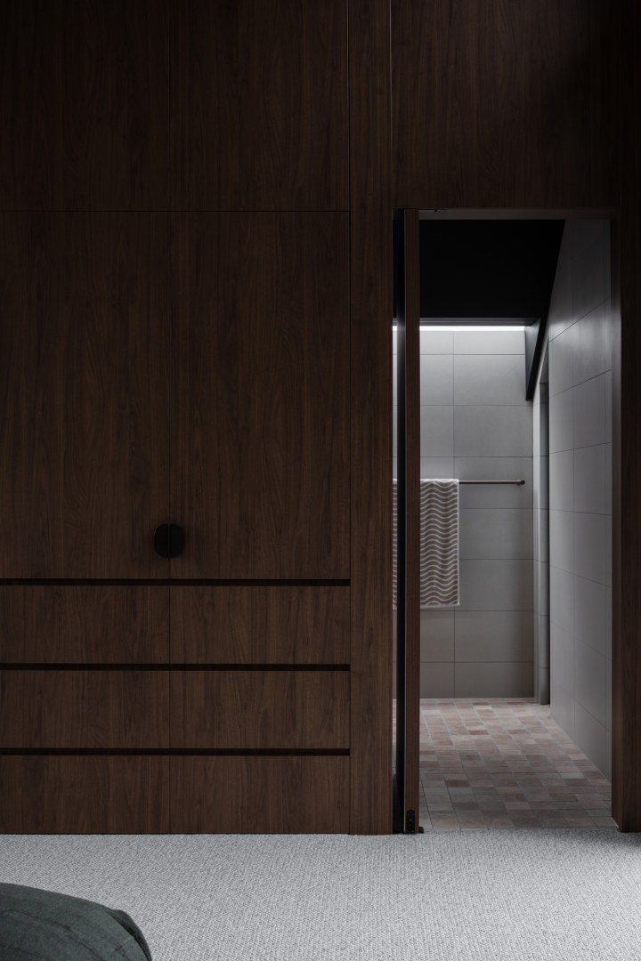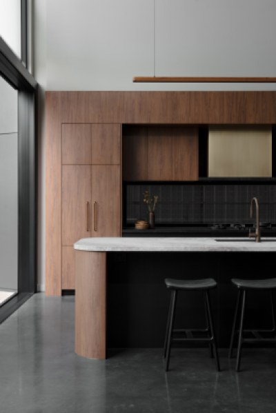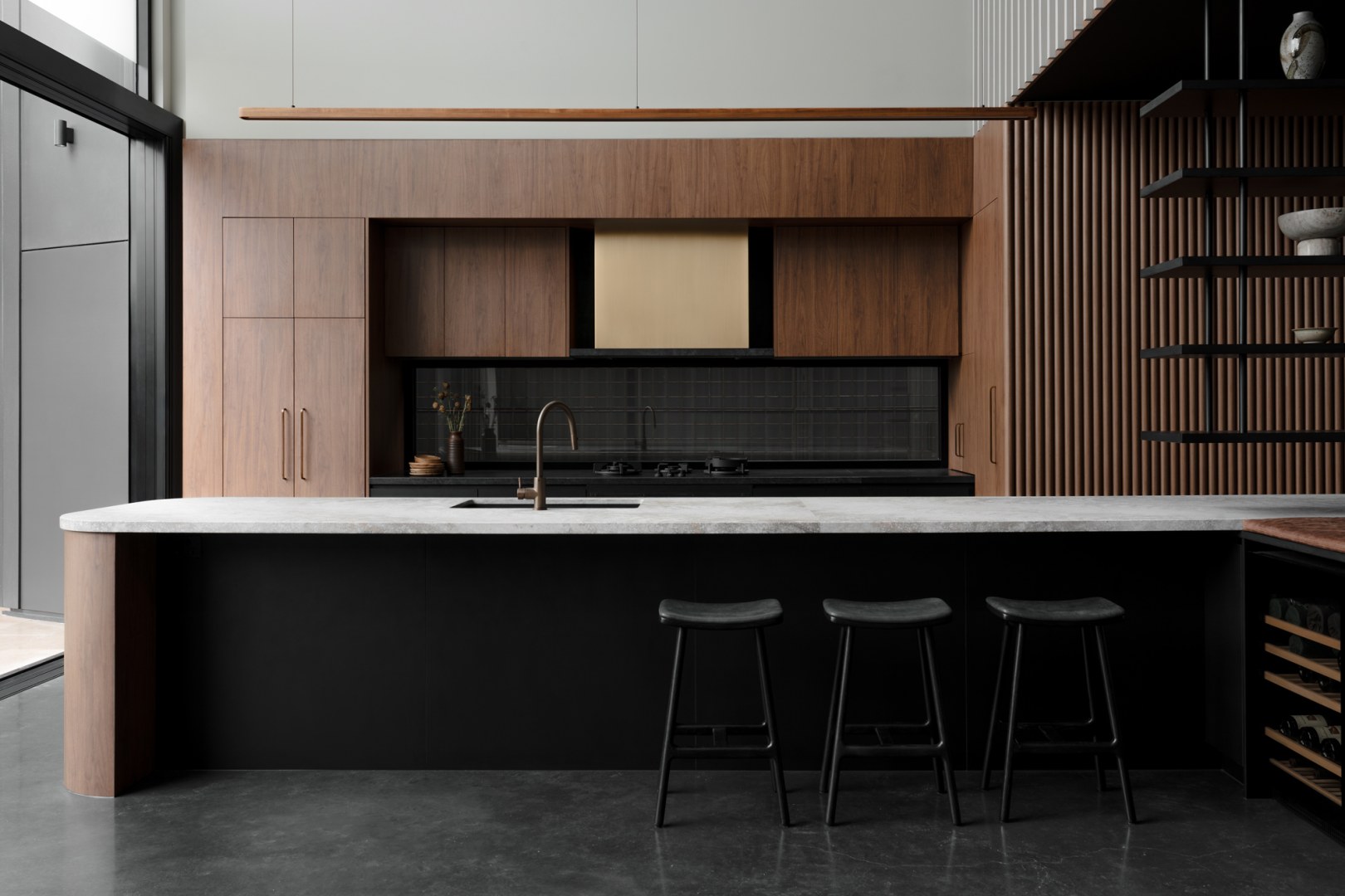 The design ethos behind this addition prioritised simplicity in both colour and material palettes. Hence, polytec was the natural choice, offering a diverse range of profiles (Decorative Board and Steccawood) unified by consistent finishes (Florentine Walnut Woodmatt, Black Woodmatt) across the kitchen, living area, powder room, and master bedroom. The versatility of profiles also played a pivotal role in concealing doors for the master ensuite and powder room, contributing to a seamless look and feel.