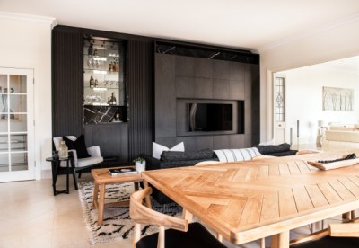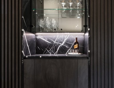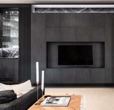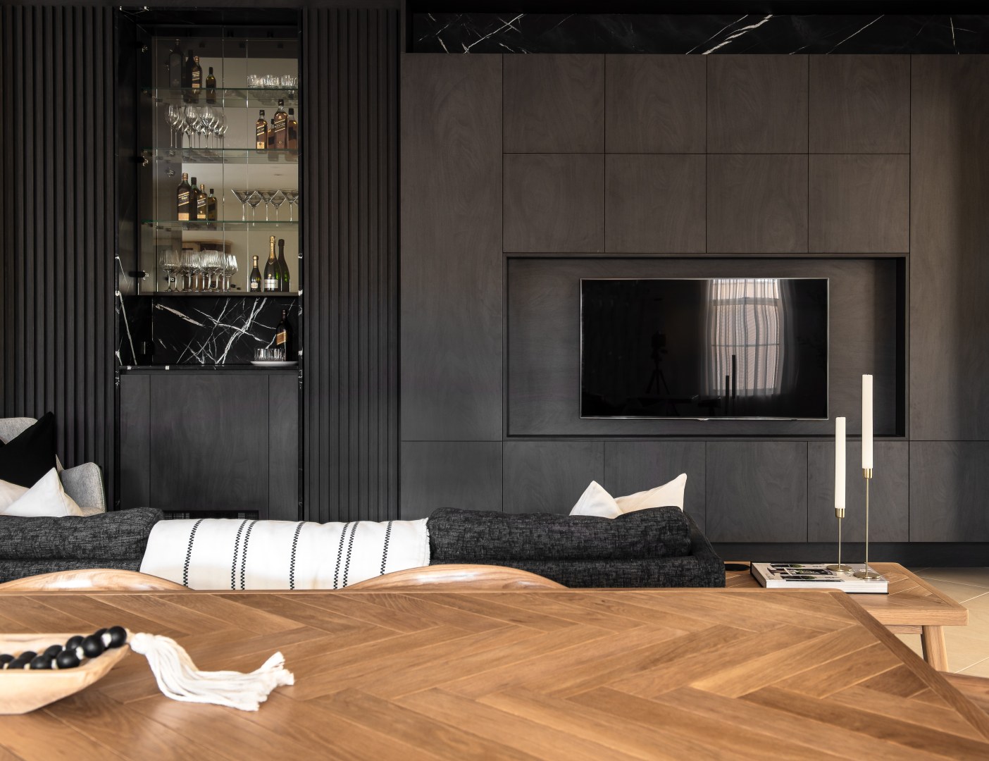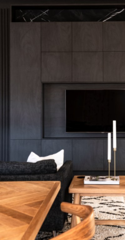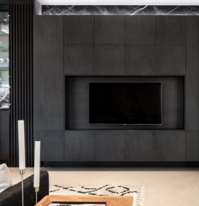 polytec Black Ply in Woodmatt finish sets the mood for this chic, sexy, joinery masterpiece. The cascading fins of the Black Ply highlight and showcase the exquisitely dynamic Black Caviar marble bar area, where it all comes to life with carefully applied lighting, display and glass finishes. The Black Ply portrays a look of masculinity with its dark subtle woodgrain but does not go unnoticed as it extends wall to wall, now being the 'Hero' to this living room space that was once bare.