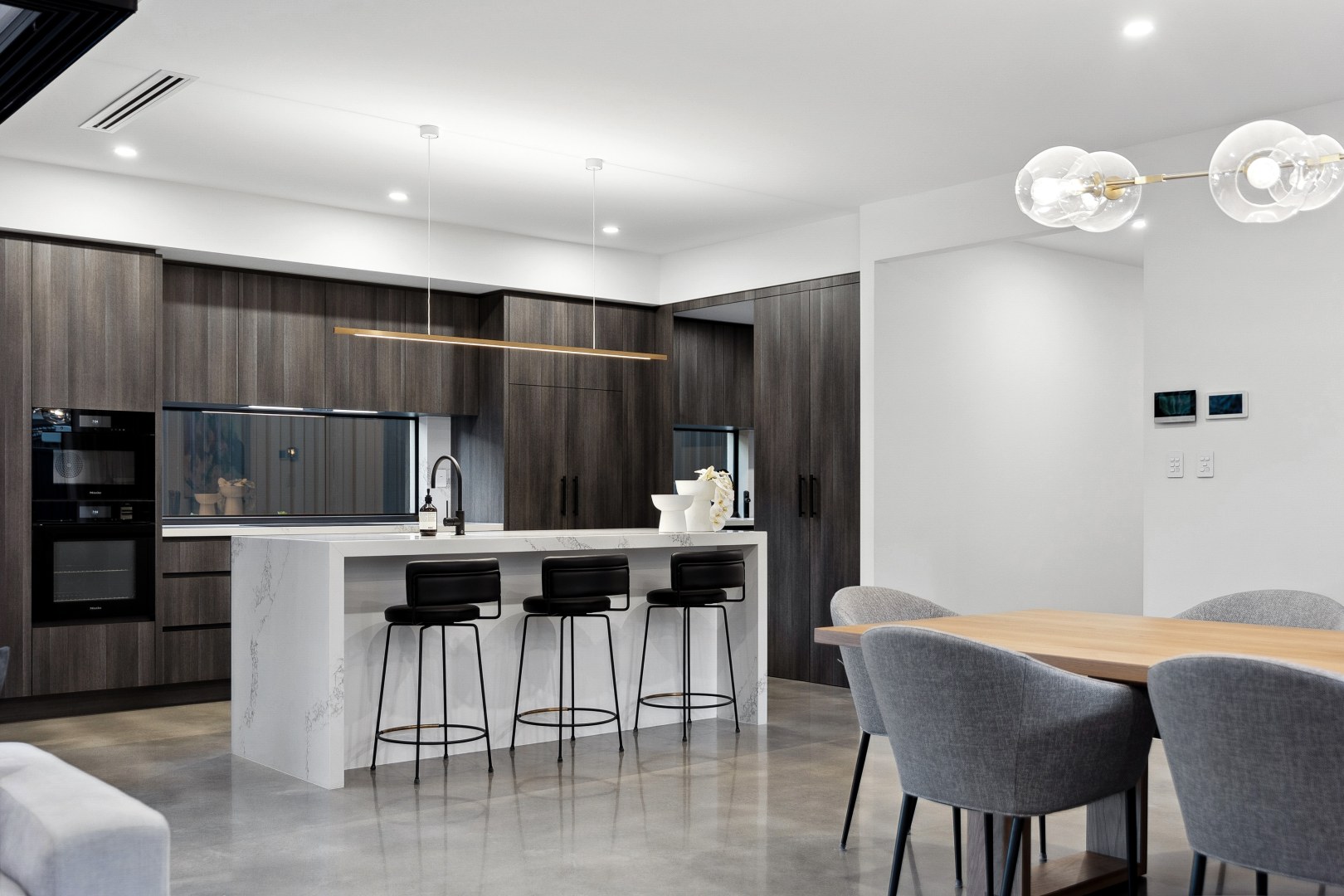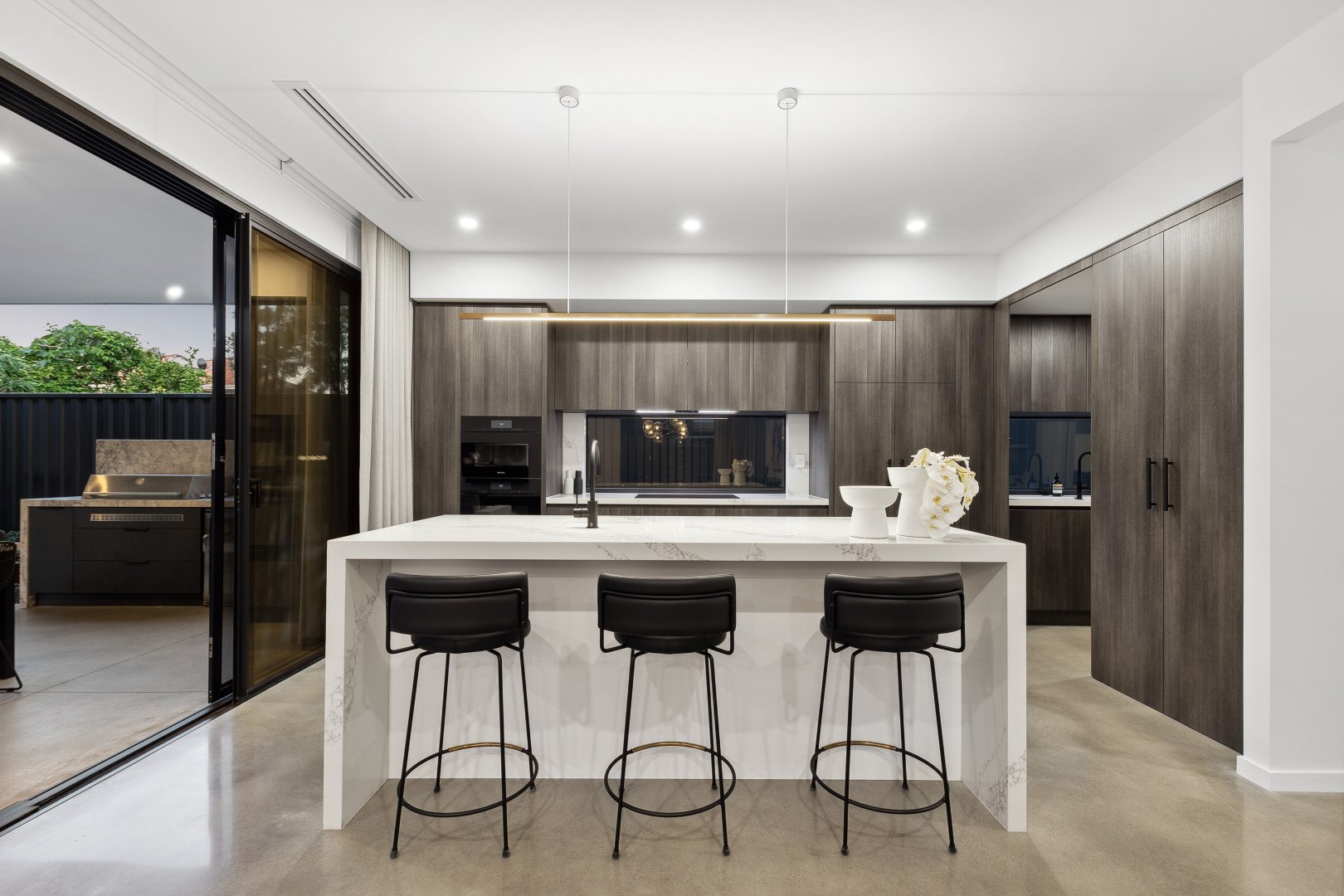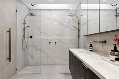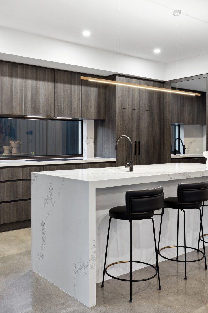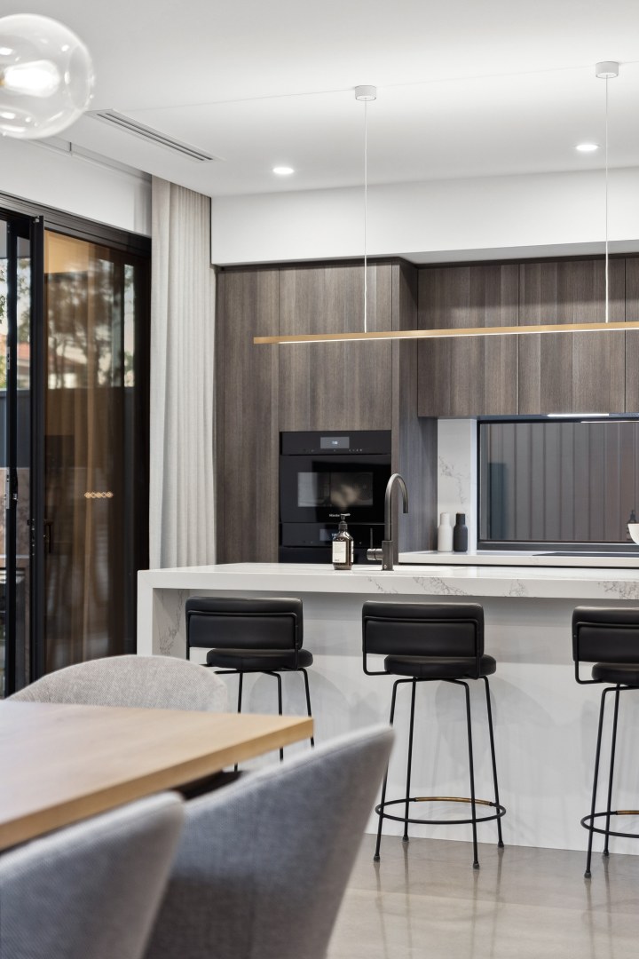 This gorgeous home by the Swan River is open plan living at its best! Offering a harmonious connection between the outdoor living space and the indoor kitchen, dining and living areas. The stone featured in the kitchen and bathrooms compliment the bespoke cabinetry, creating areas that are inviting and elegant.