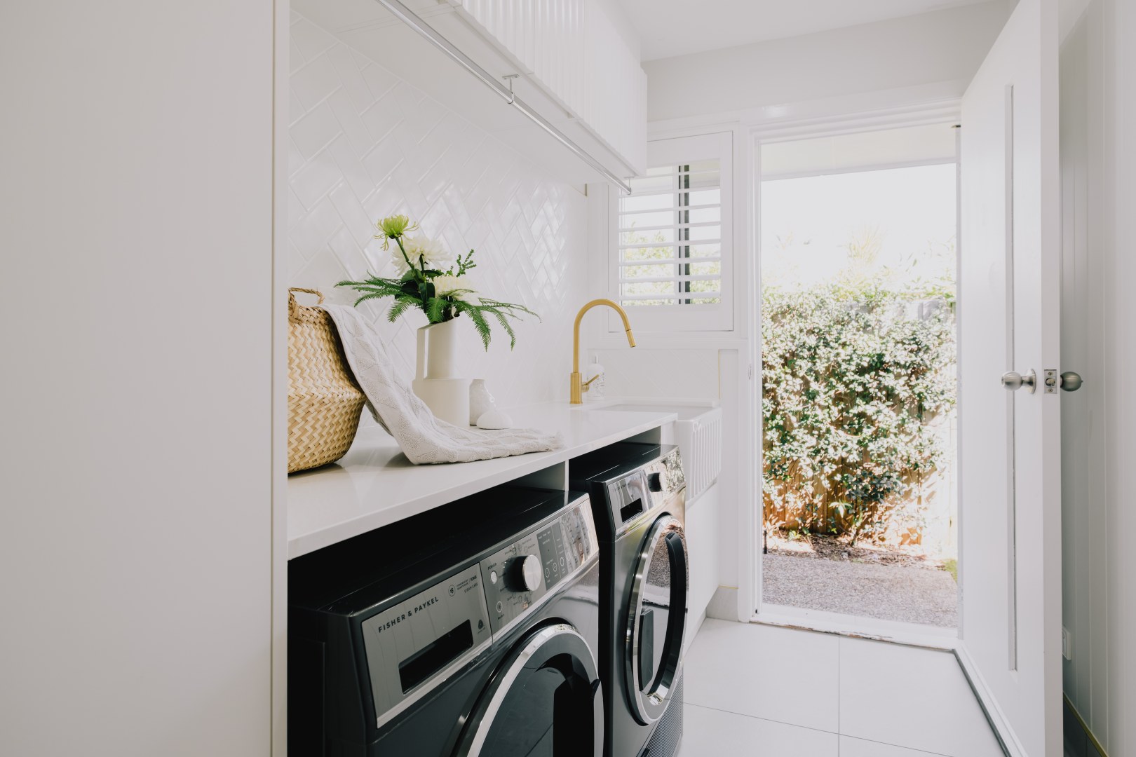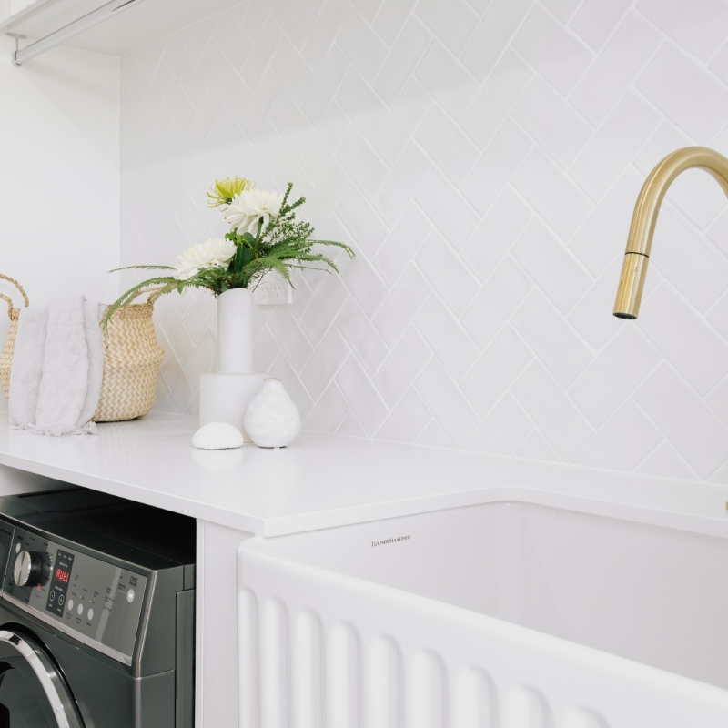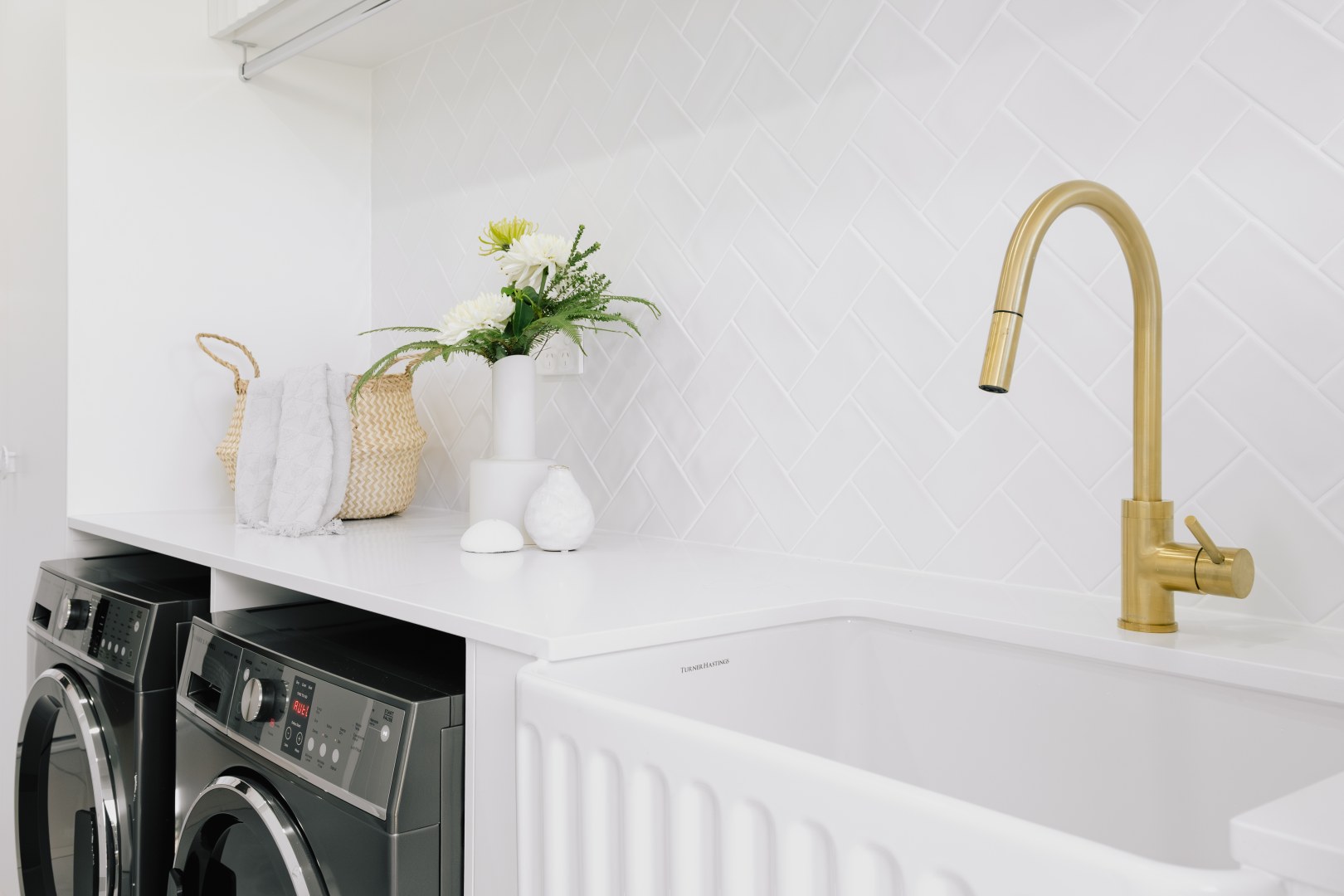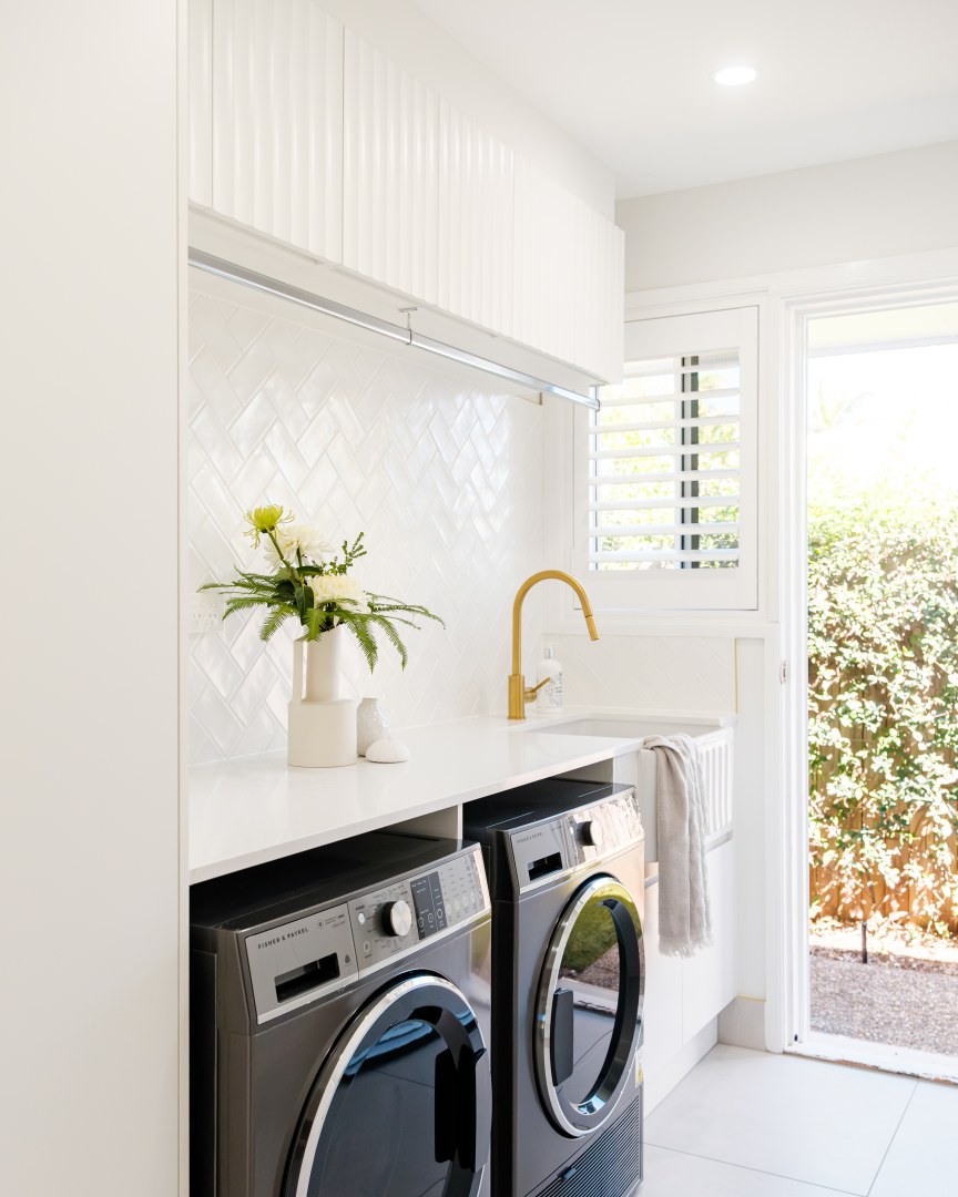 The laundry of our Mooloolaba Marmo renovation was designed to complement the Dolomite marble bathrooms- a clean and calming space for the eye to rest after the showstopping herringbone marble features elsewhere. We wanted the laundry to feel pretty, coastal and fresh, as well being practical and functional laundry.