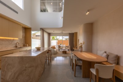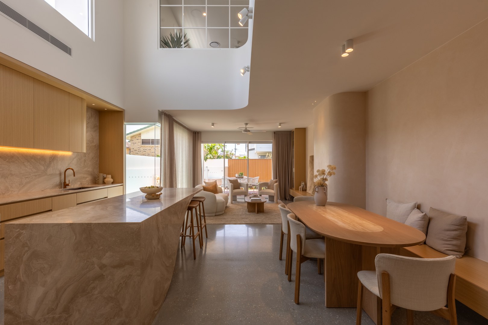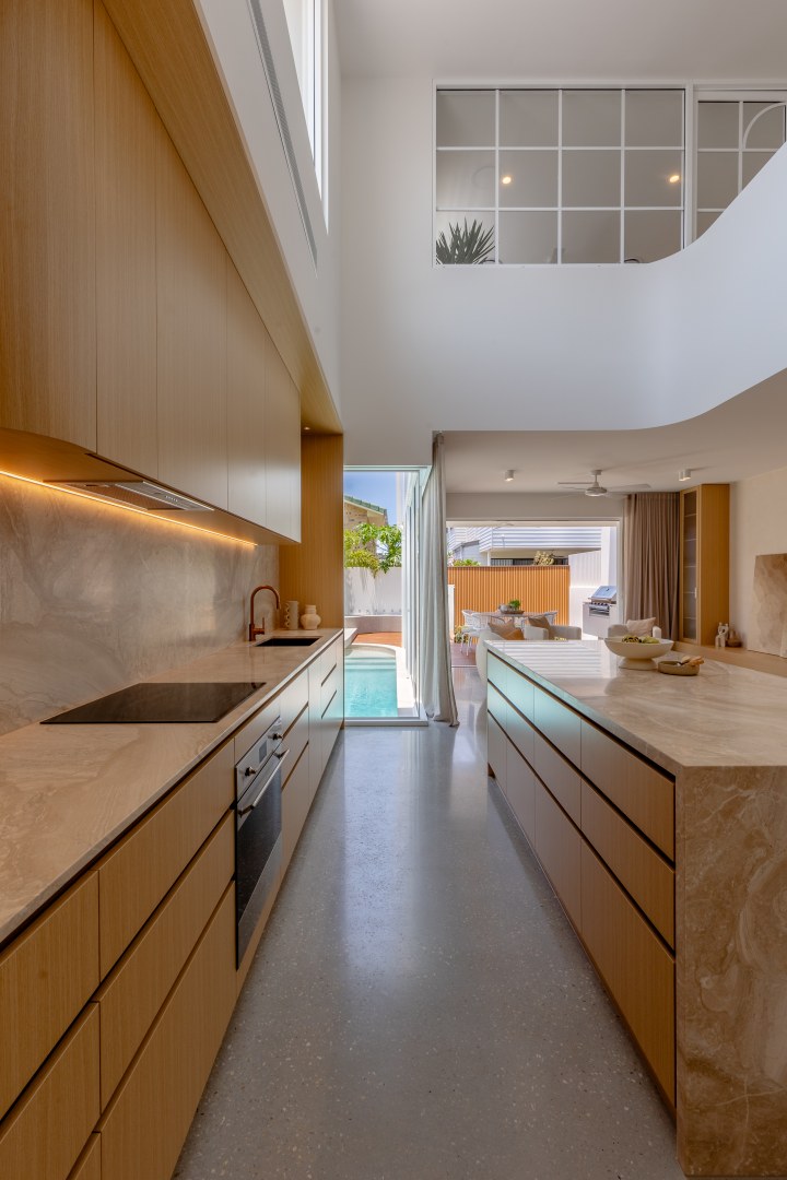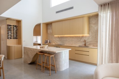 This brand new aesthetically pleasing design incorporates elegant curves with functionality to complete the contemporary look of this modern town house. We have used polytec Tuross Oak Matt board for the cabinetry.