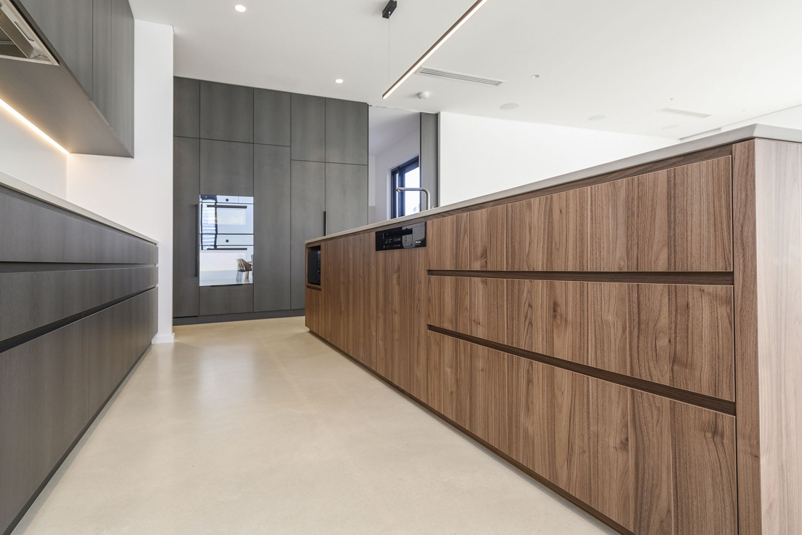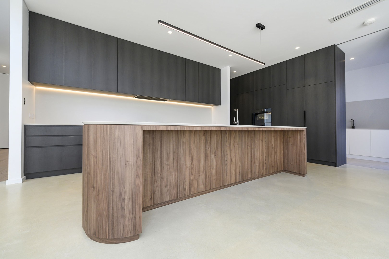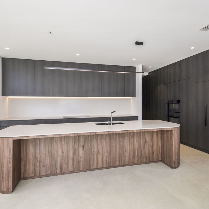Embodying dark tones and contrast timber woodgrain, together with feature curve ends to the island, and the integration of all major appliances has created a simplistic and minimalistic approach to Modern Living. Clever spatial planning and design with an abundance of natural light has resulted in this practical and visually stunning kitchen. Accentuated by sharp lines and soft curves. Selections include: polytec Empire Oak and polytec Notaio Walnut prefinished board