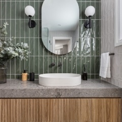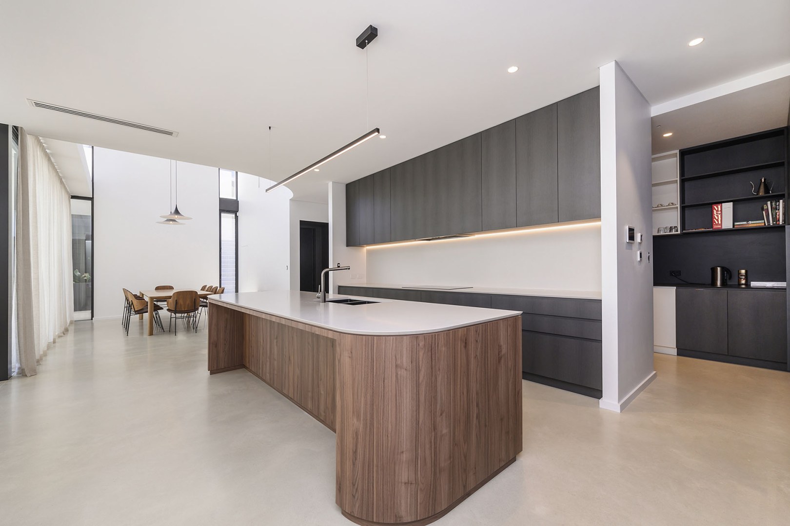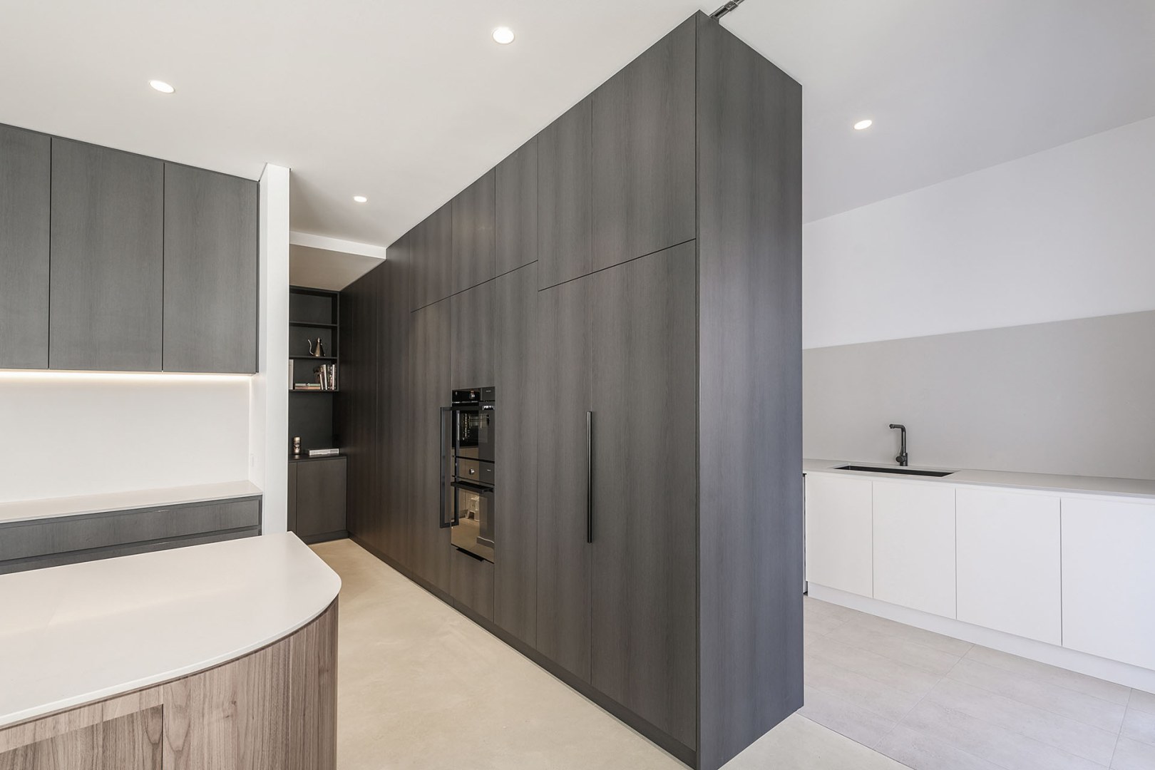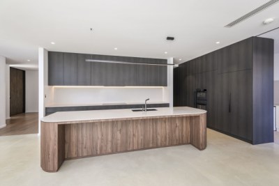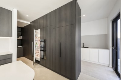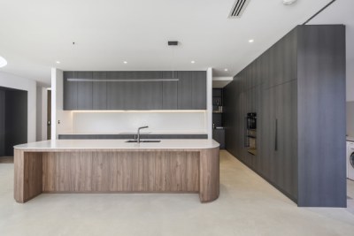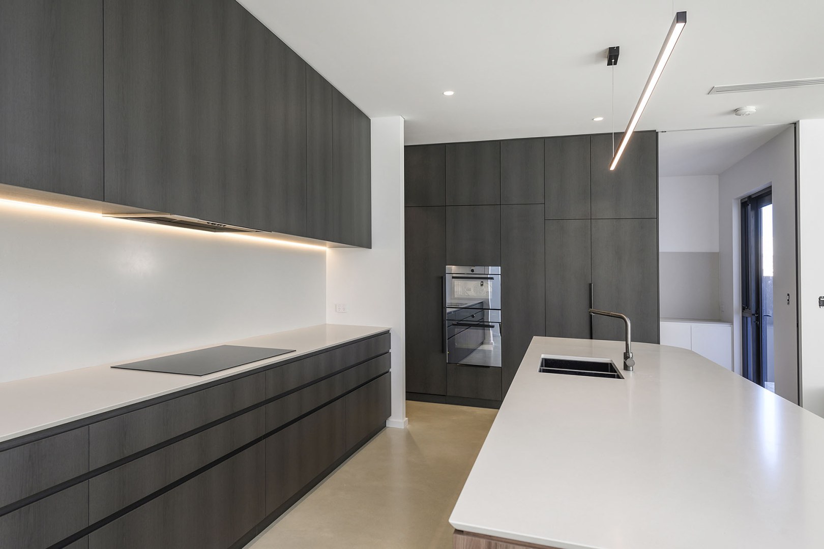 Embodying dark tones and contrast timber woodgrain, together with feature curve ends to the island, and the integration of all major appliances has created a simplistic and minimalistic approach to Modern Living. Clever spatial planning and design with an abundance of natural light has resulted in this practical and visually stunning kitchen. Accentuated by sharp lines and soft curves. Selections include: polytec Empire Oak and polytec Notaio Walnut prefinished board