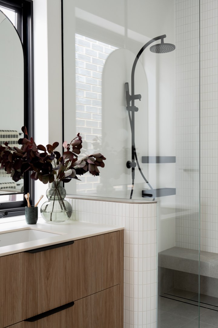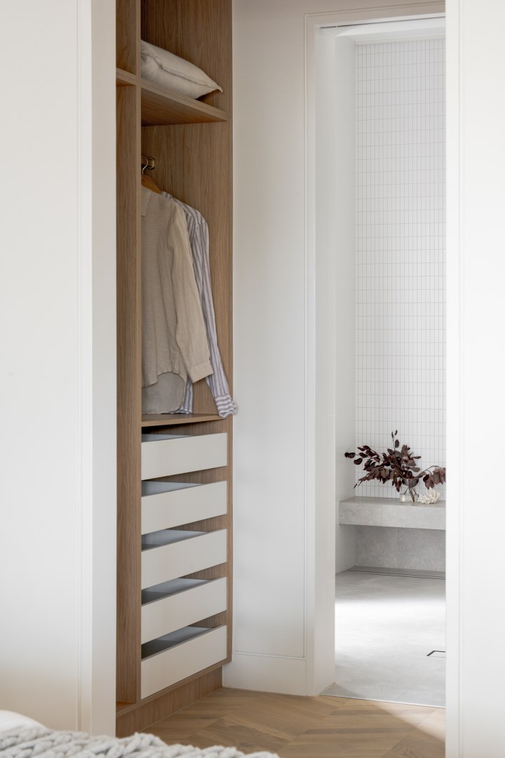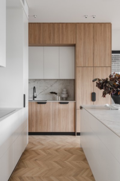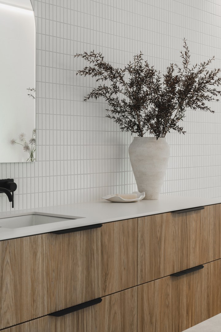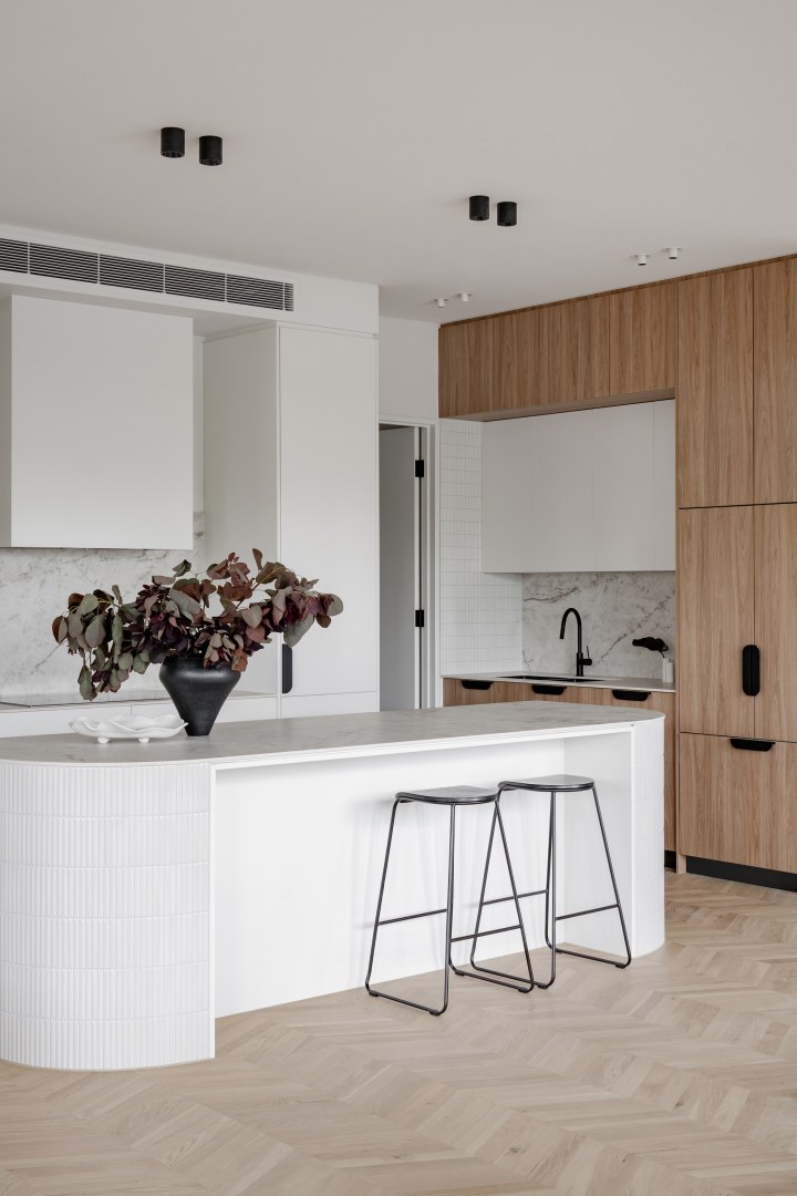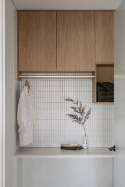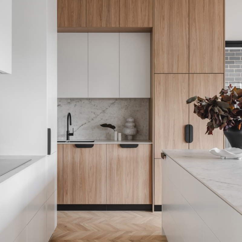 This project was a development to be sold as soon as complete. The main brief for the interior was to be warm and inviting, architecturally designed and to have high end material and finishes that would appeal to a broad demographic. Selection of warm oak and white laminates, and textural layers, all help to bring this interior to life.