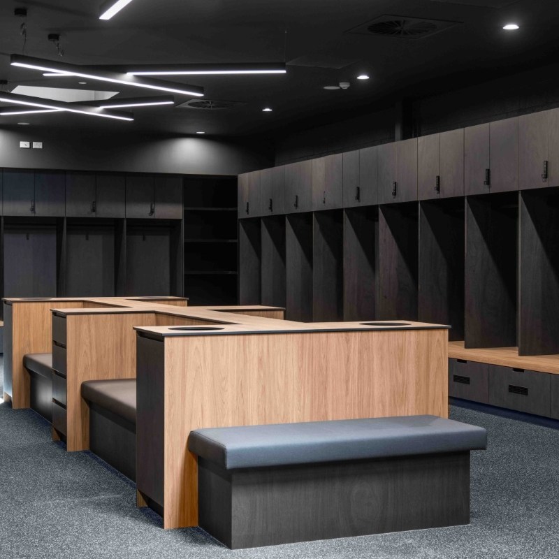 The Knights Centre of Excellence is the home base for the Newcastle Knights NRL team. This centre facilitates the development of skills in young and professional NRL athletes. We had the privilege of working on the change room and amenities in this centre, inspired by night club culture, with the aim to promote team comradery. This space required durable, robust finishes, so the combined use of Prime Oak and Black Ply Woodmatt was the perfect finishes to achieve this function.