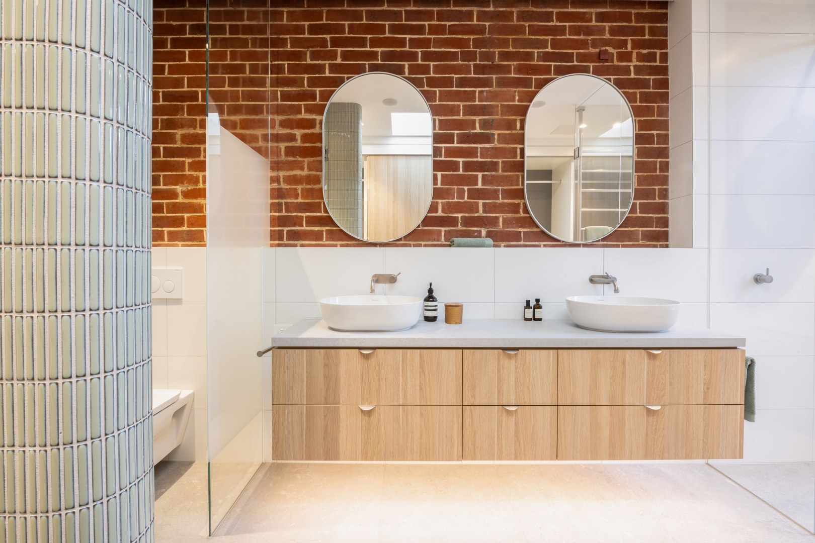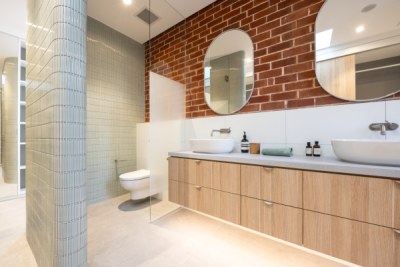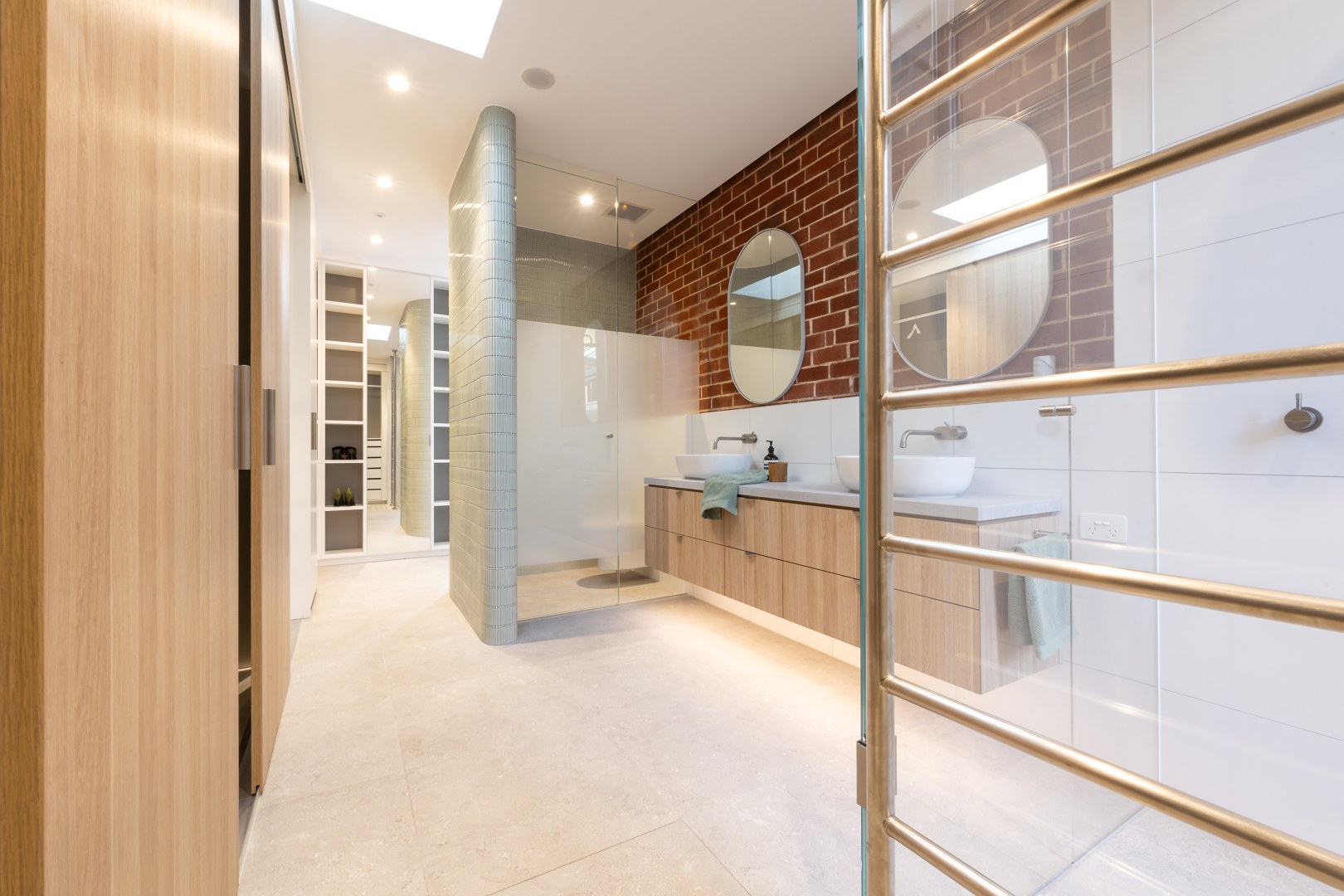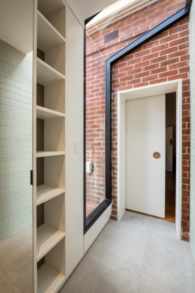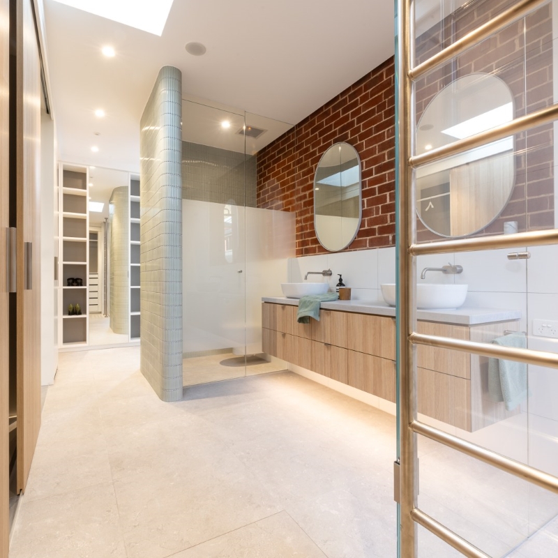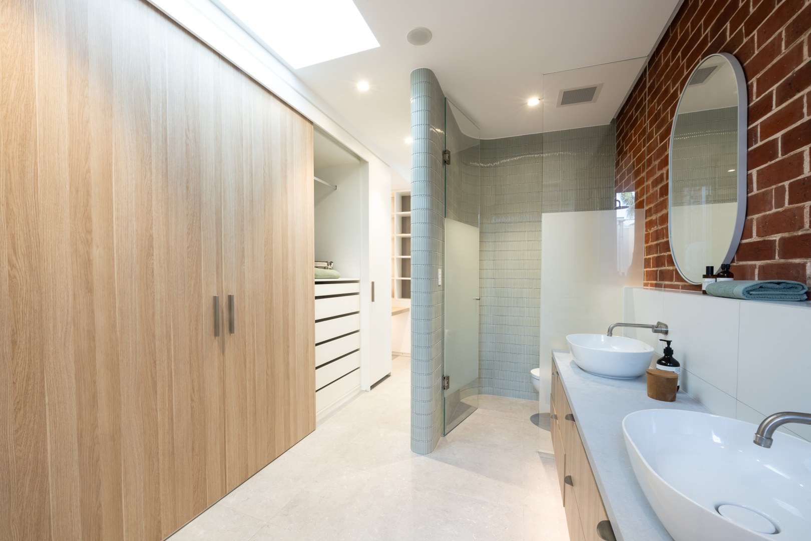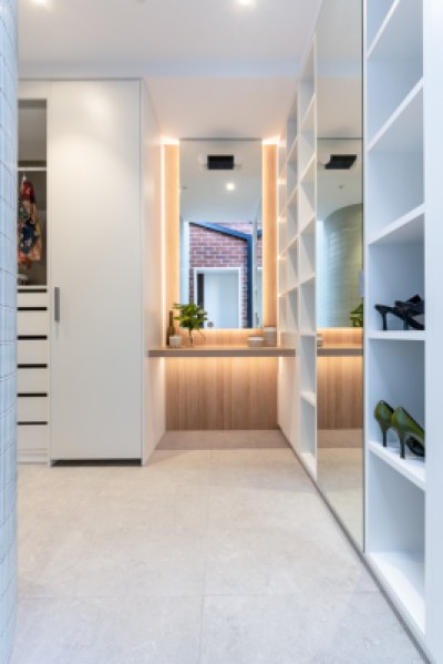 This project involves a side addition accommodating a master robe and vestibule ensuite. A new opening links the master bedroom with a view across to the dressing table. The curved mosaic wall adds a tactile element that guides you through to the combined robe and ensuite. Robe joinery is maximised with double height hanging, drawers and adjustable shelving. Timber laminate provides warmth and practicality whilst also connecting to existing timber elements in the main home.