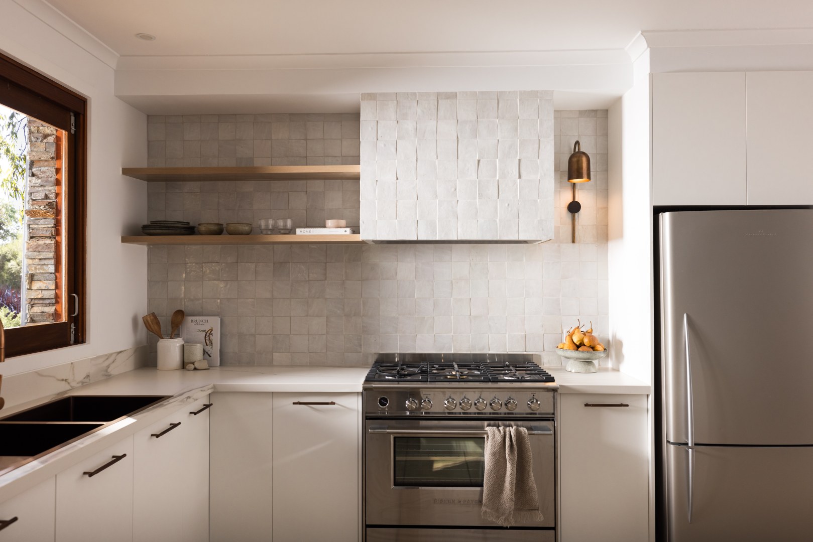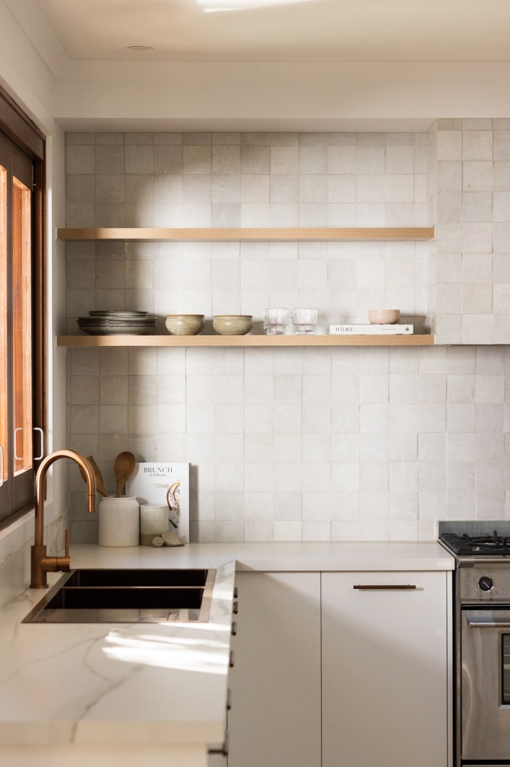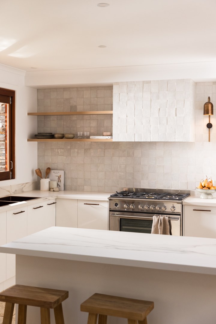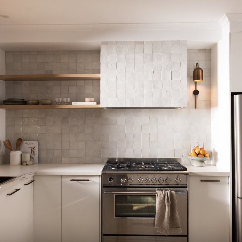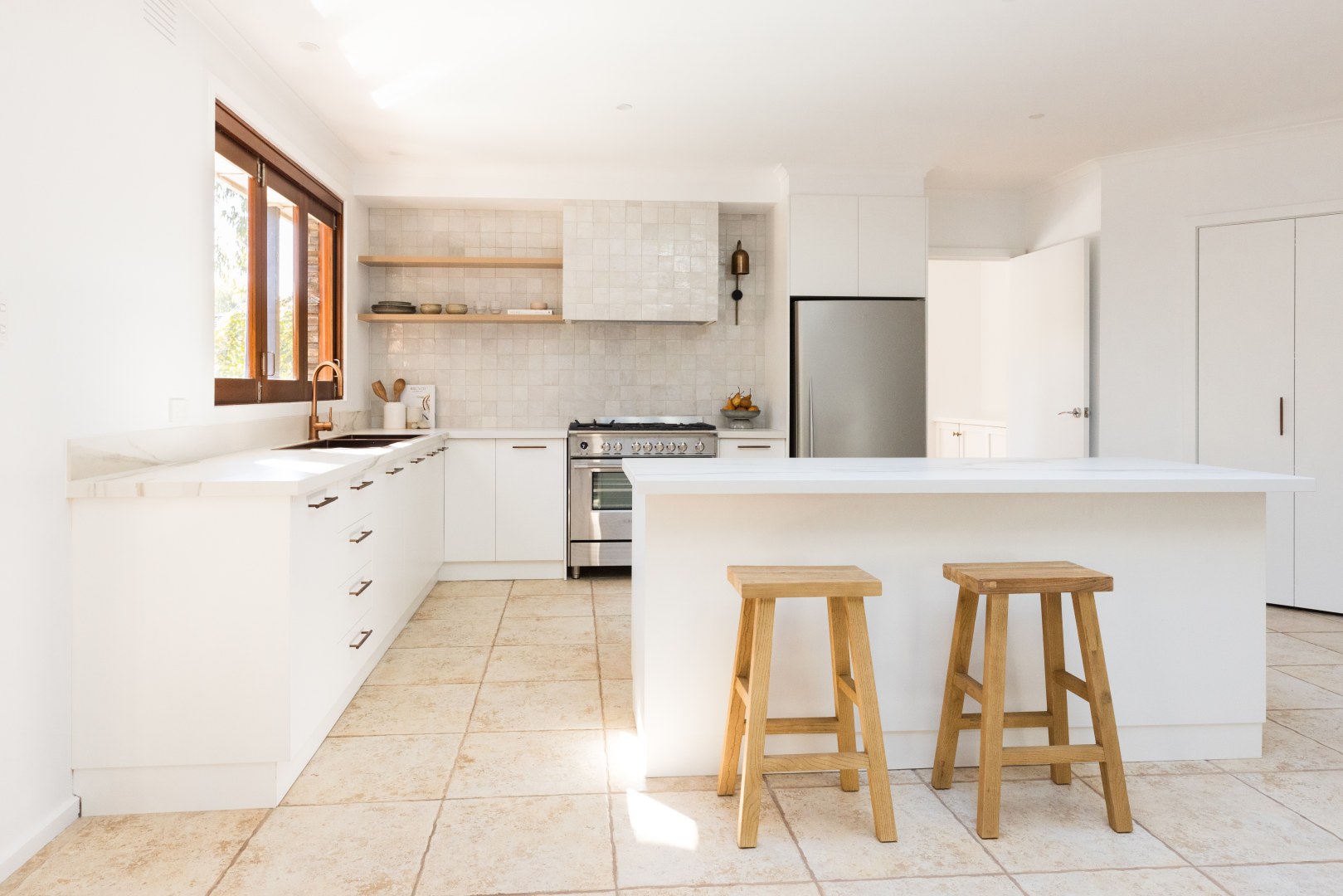 A considered re-imagination kitchen renovation on a 20-acre site that invites connection to adjoining spaces and a welcoming atmosphere. A focus on materials that offered both texture and aesthetic depth whilst embracing the perfect imperfections of natural and handcrafted materials. Warm metals, soft timber elements, travertine tiles and golden marble streaks delicately balance against an all-white backdrop, providing a whimsical ambience and nurture a warm and welcoming emotional response.