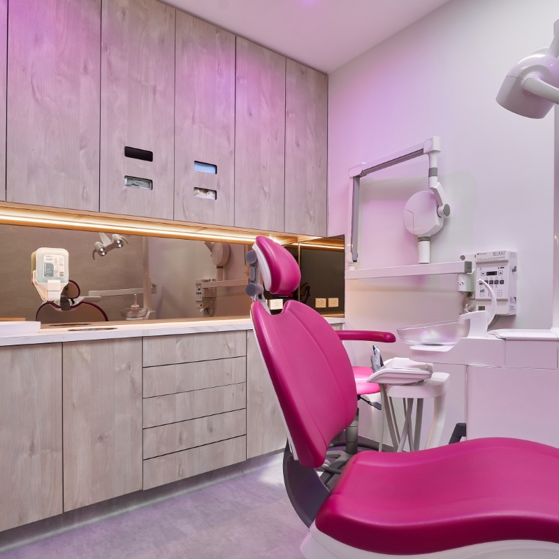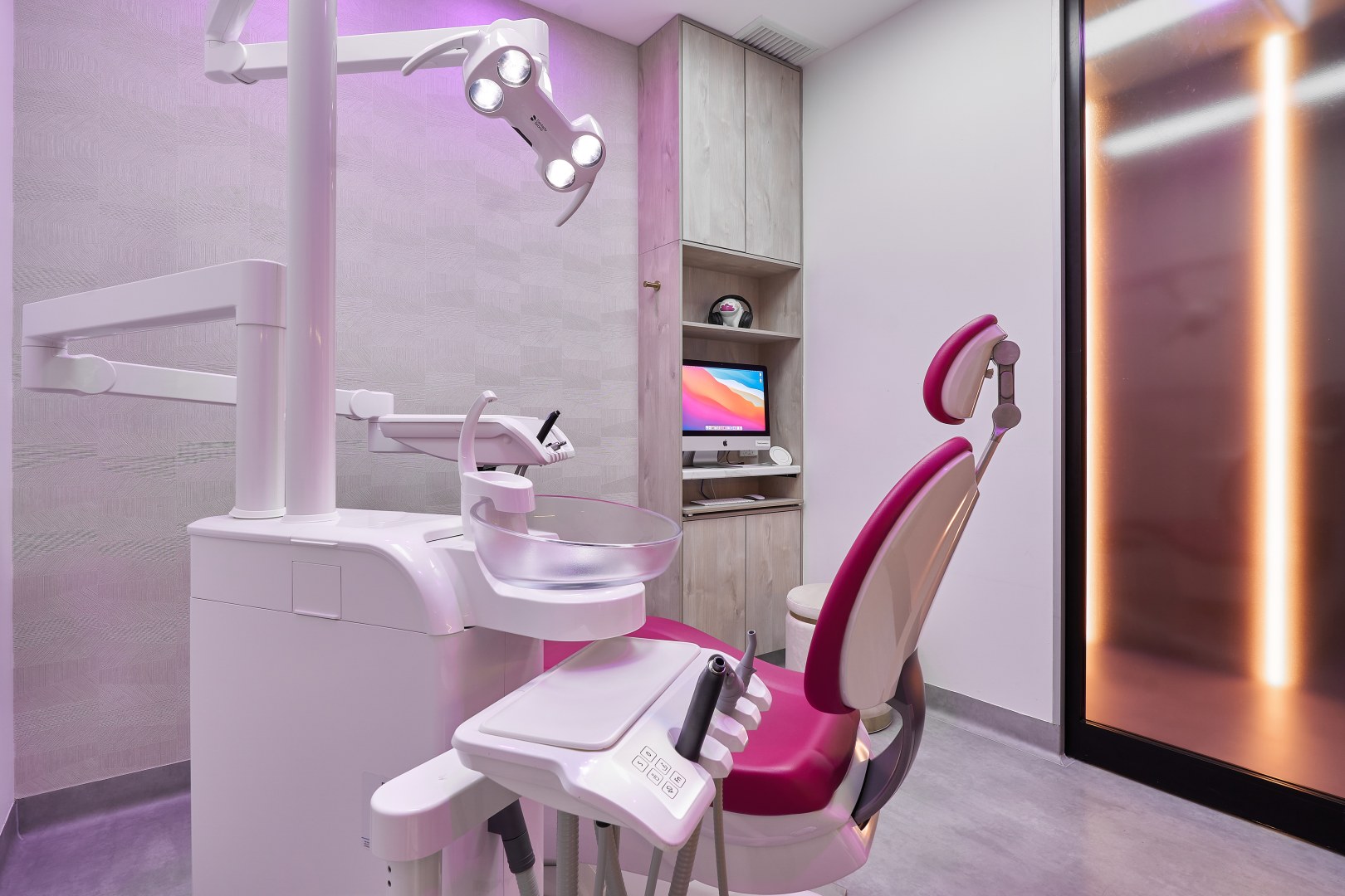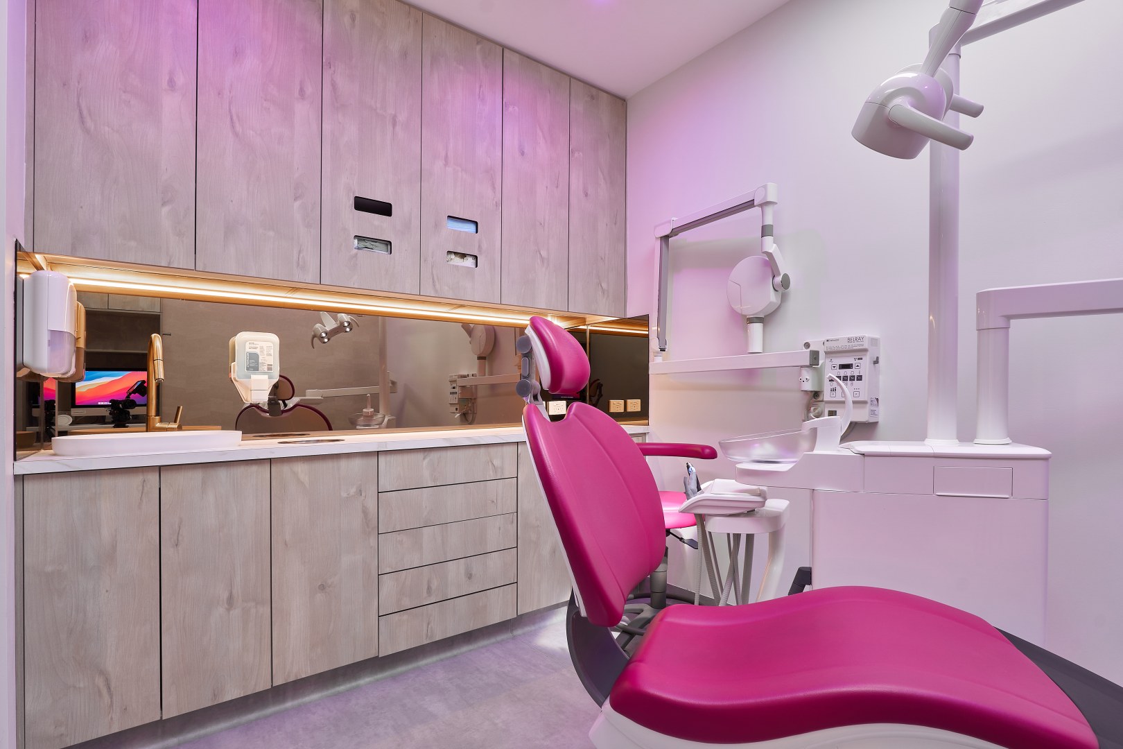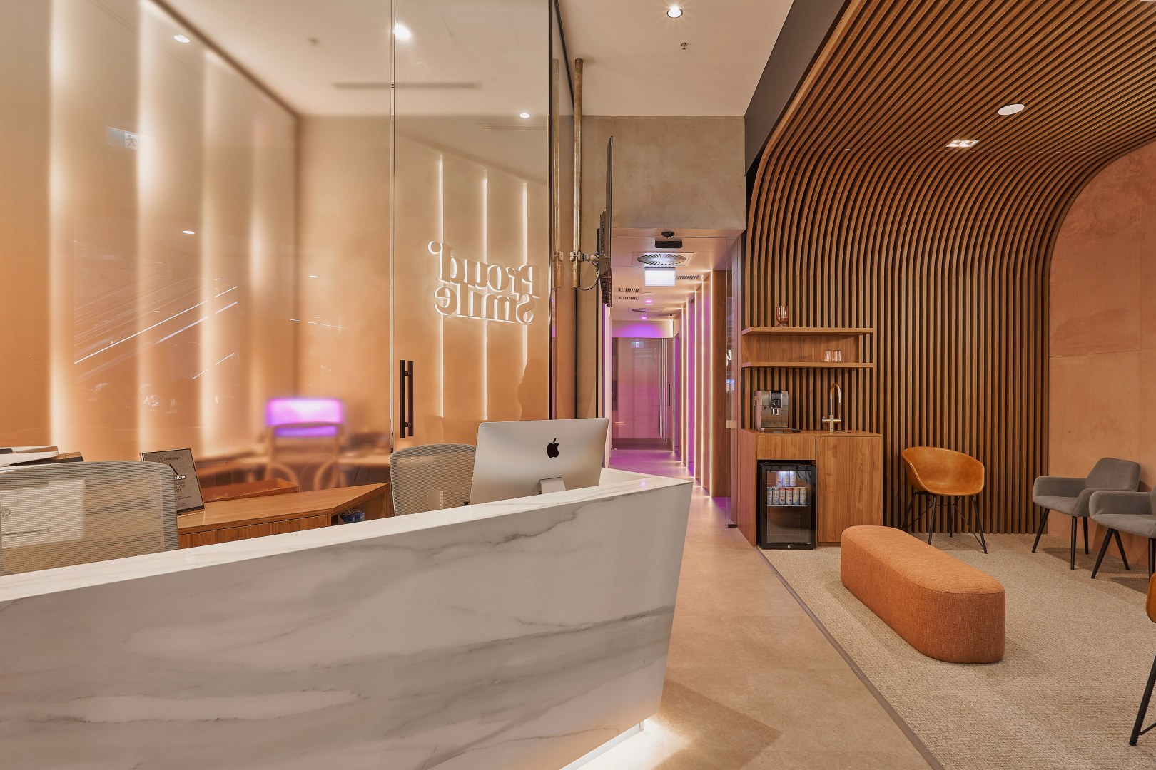 This is a place to be pampered and cared for. The main idea of the briefing was to create a space disconnected from the usually cold, impersonal, clinical and flat dental clinic. The owner loves luxury and travels a lot. He was willing to have a reception and waiting area that reminded a luxury hotel, and surgery rooms that transmitted a calm and warm feel. I chose to use polytec Notaio Walnut and Angora Oak as our main timber laminate colours.