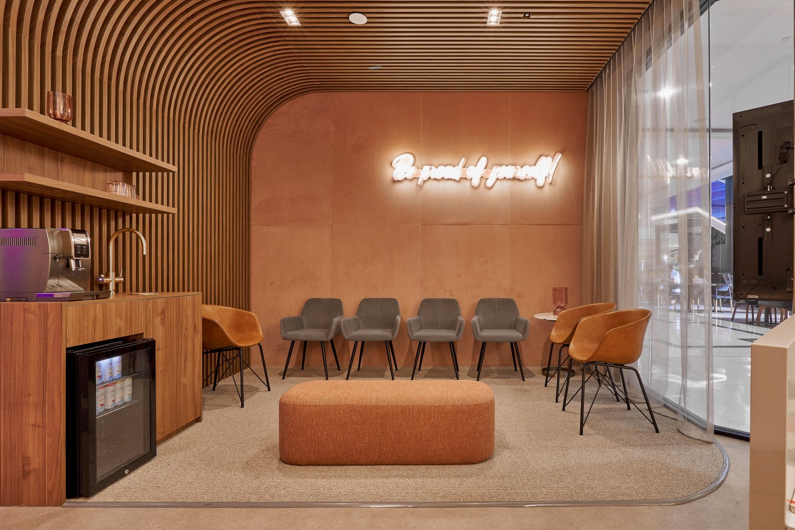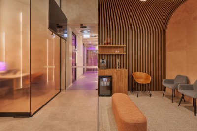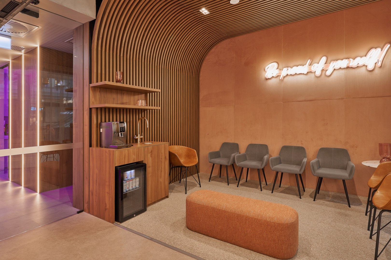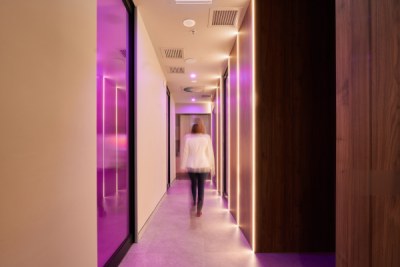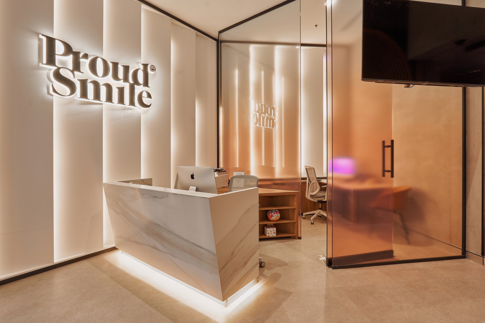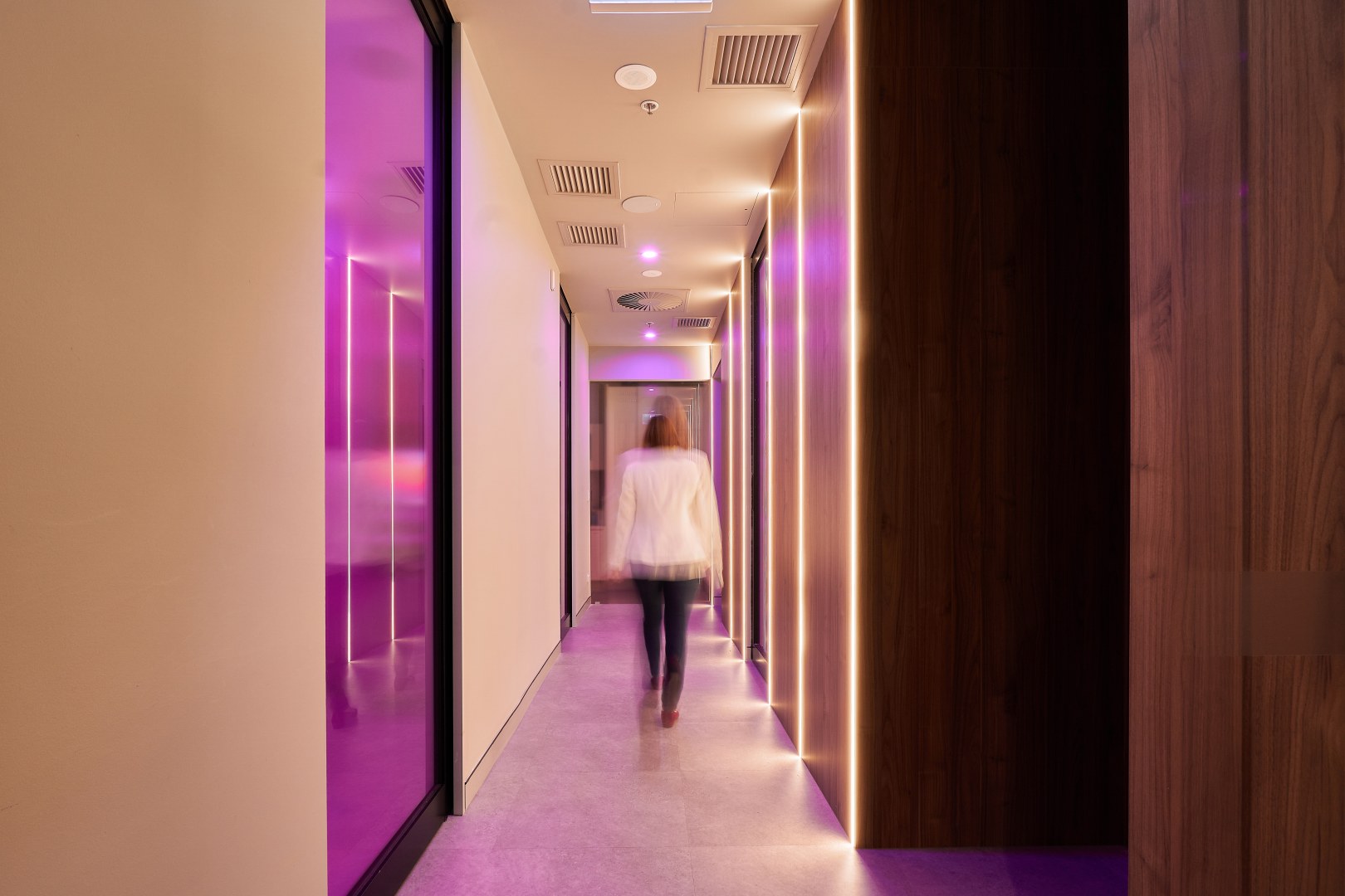 This is a place to be pampered and cared for. The main idea of the briefing was to create a space disconnected from the usually cold, impersonal, clinical and flat dental clinic. The owner loves luxury and travels a lot. He was willing to have a reception and waiting area that reminded a luxury hotel, and surgery rooms that transmitted a calm and warm feel. I chose to use polytec Notaio Walnut and Angora Oak as our main timber laminate colours.